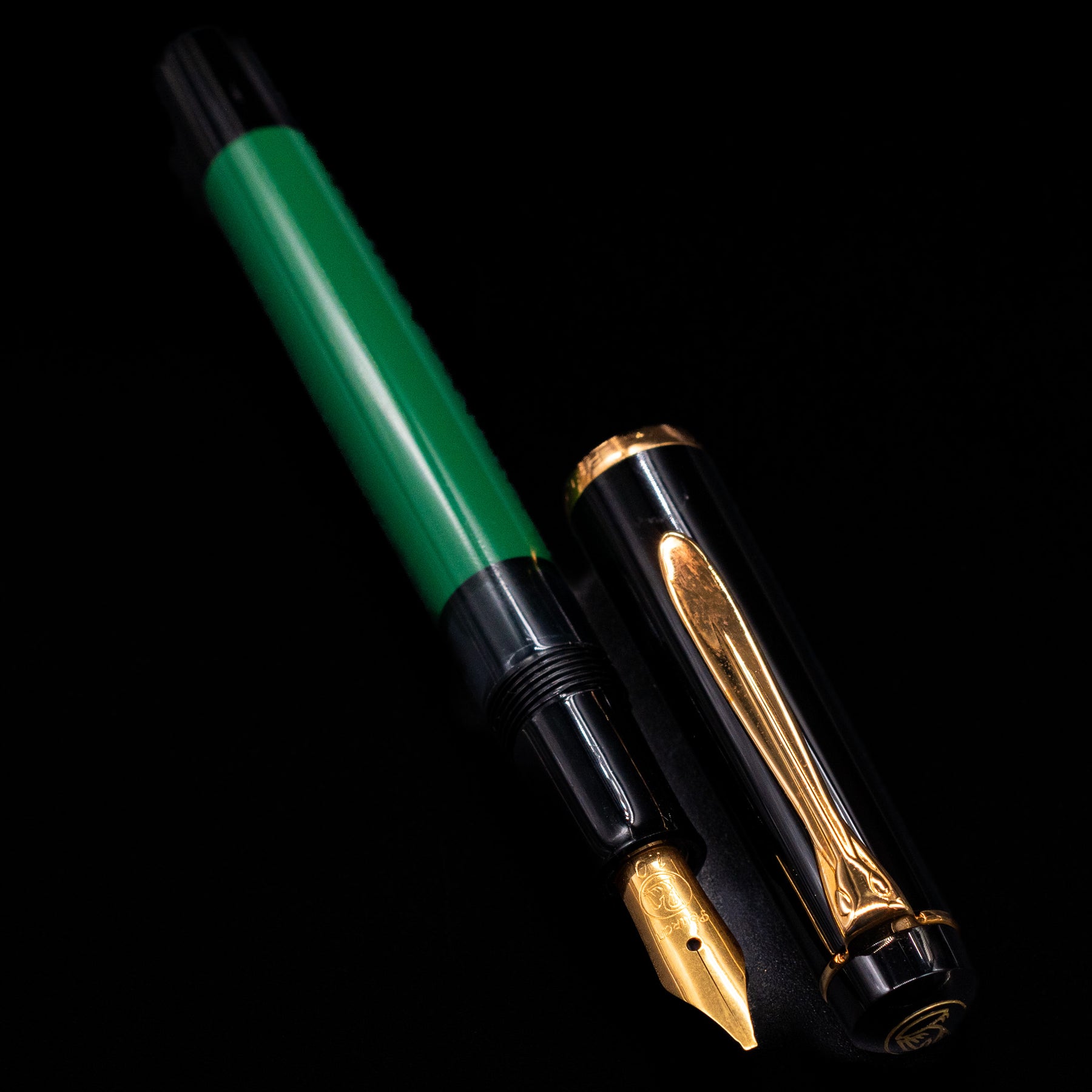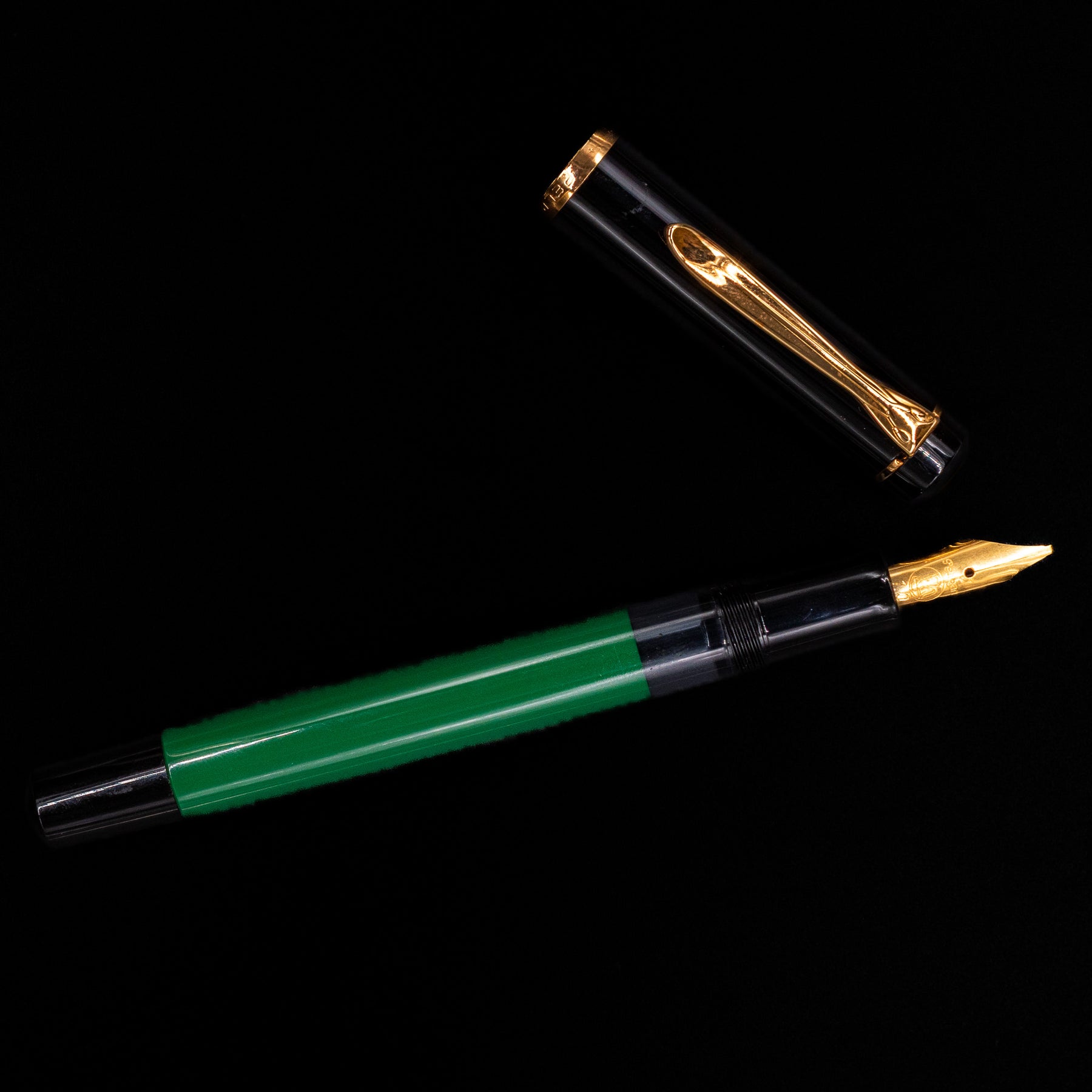 The pen features Pelikan’s signature opaque green barrel with ink window, allowing you to see the ink level inside, paired with a glossy black cap and warm gold-plated trim. The iconic Pelikan beak clip and traditional cap band complete the timeless aesthetic, giving the M150 the classic look collectors and writers love.