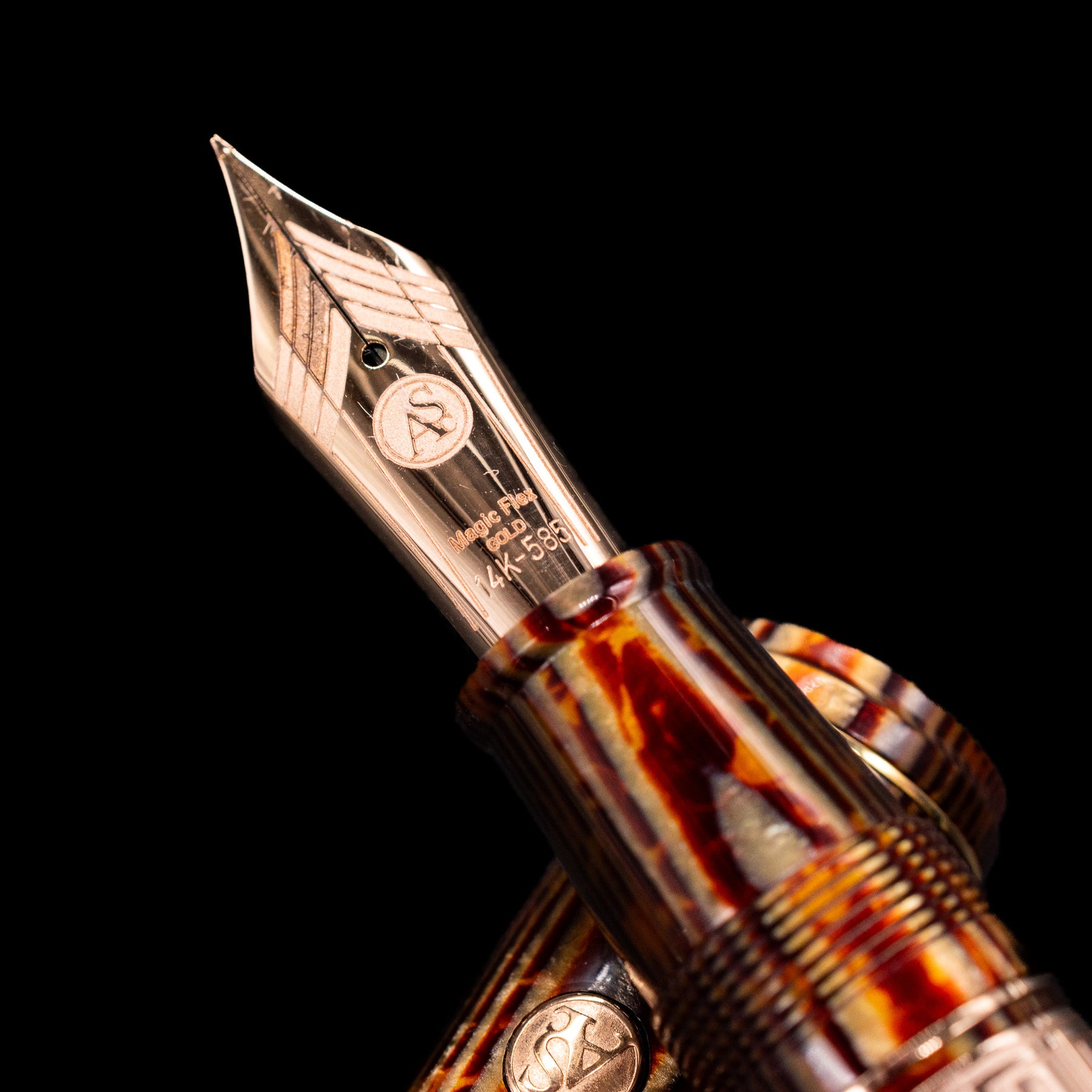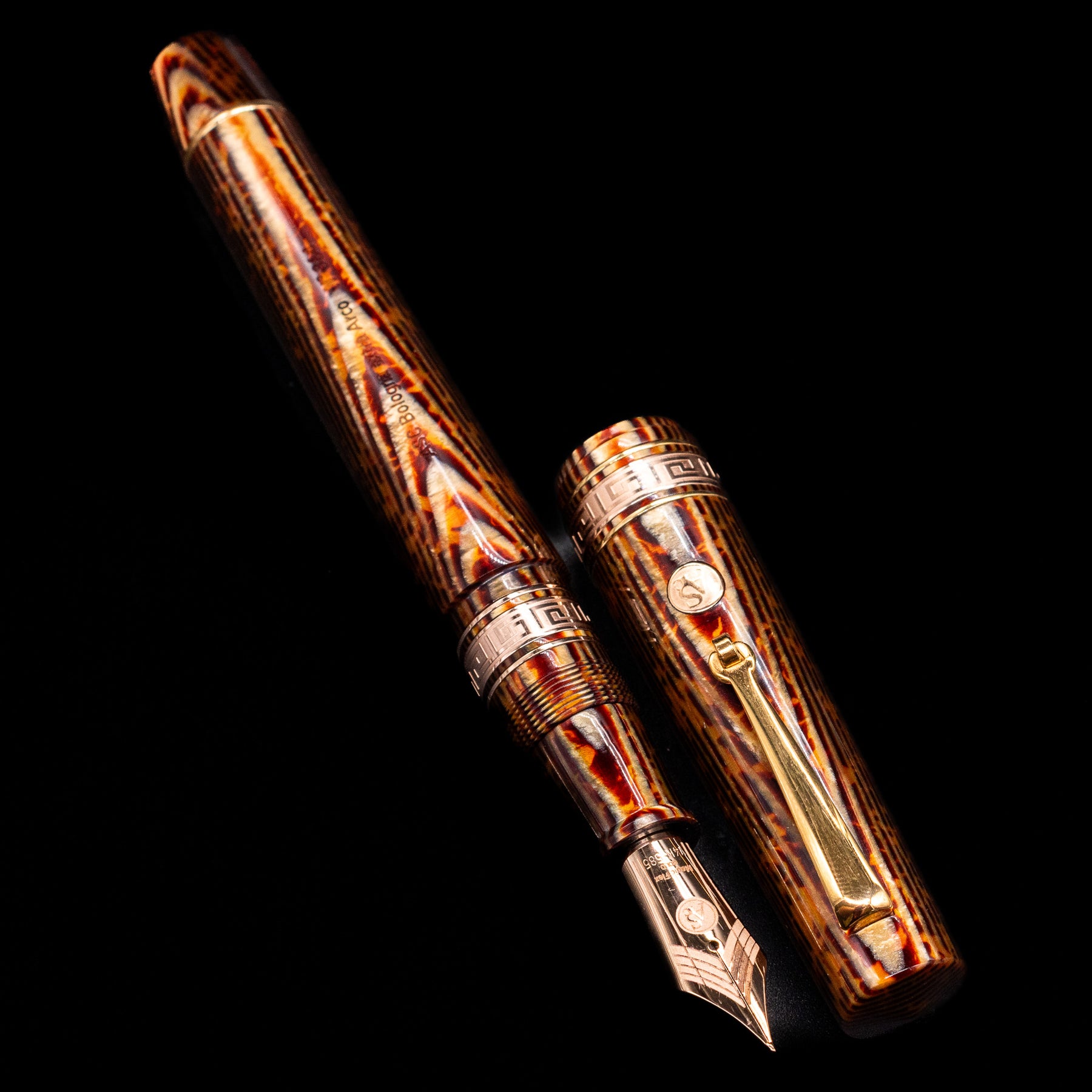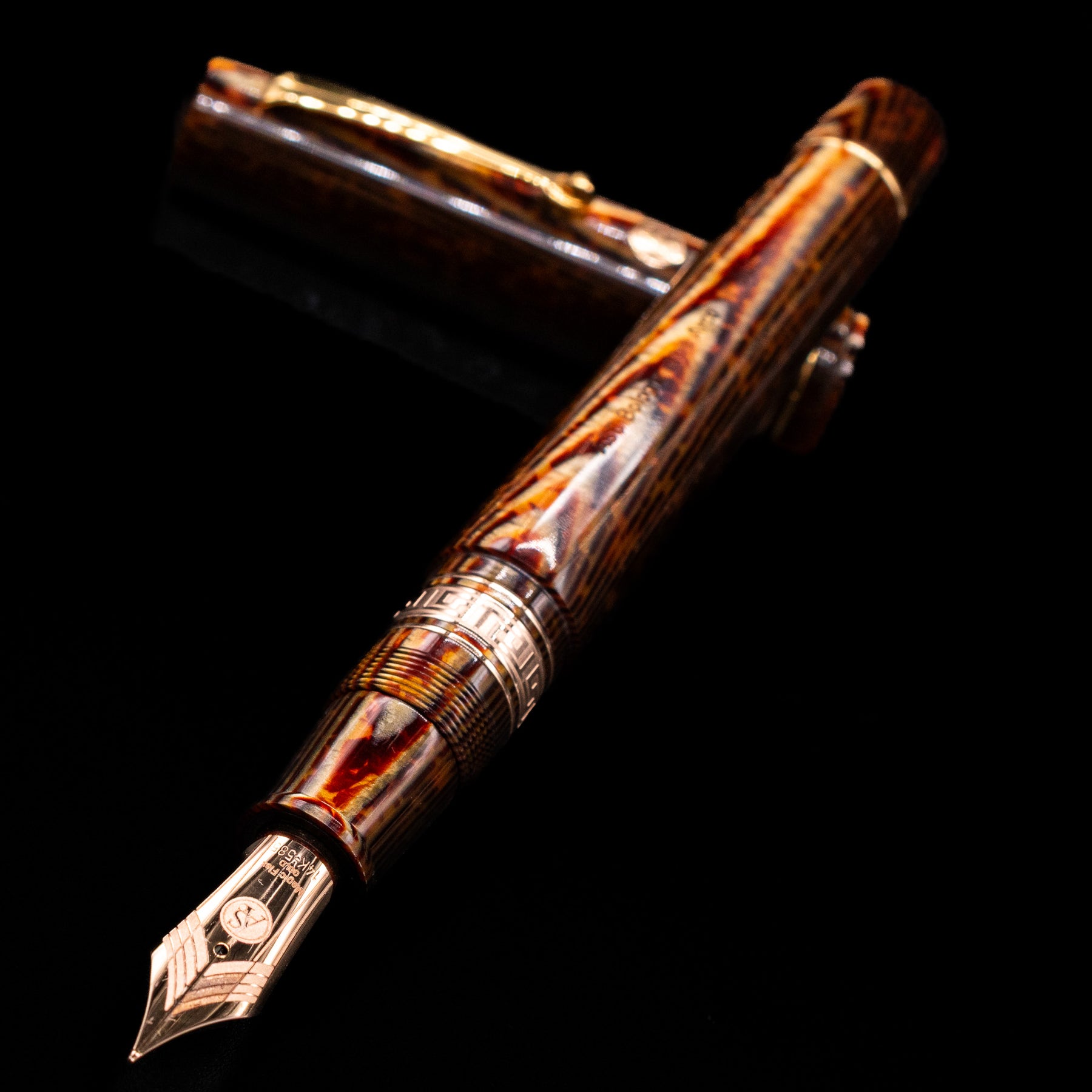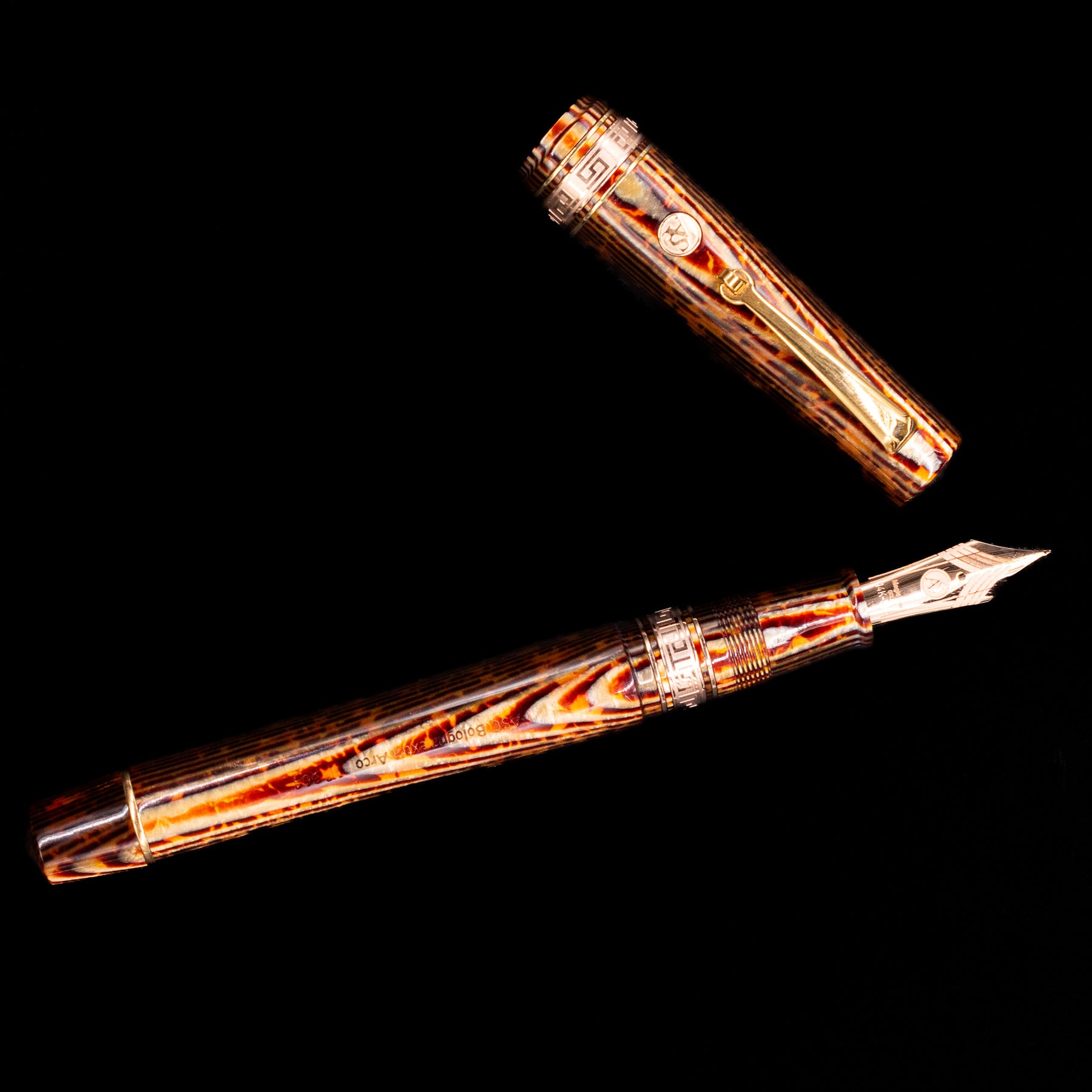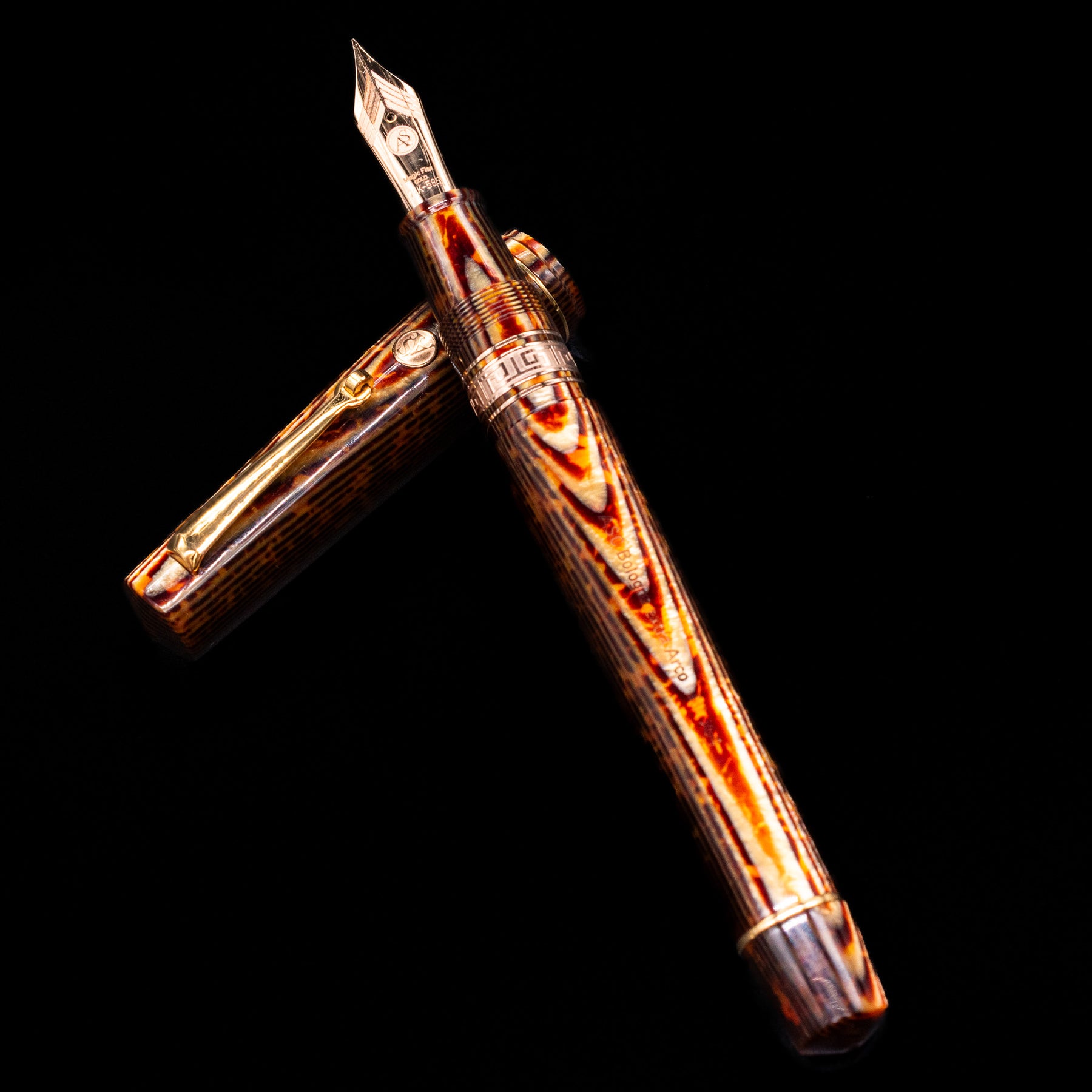 The Armando Simoni Club Bologna Extra Arco is one of the most admired modern interpretations of a legendary Italian celluloid pattern. Made using ASC’s proprietary Arco material, this pen recreates the dramatic, layered “stacked” effect that made vintage Arco celluloid so sought after. The resin displays bands of amber, caramel, bronze, and deep espresso, shifting beautifully in the light and giving every pen a one-of-a-kind visual signature.
