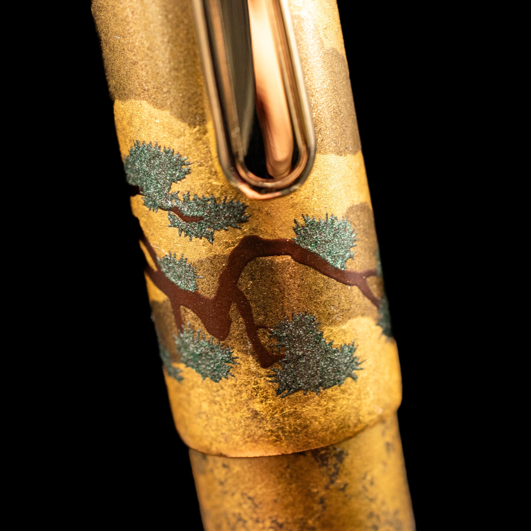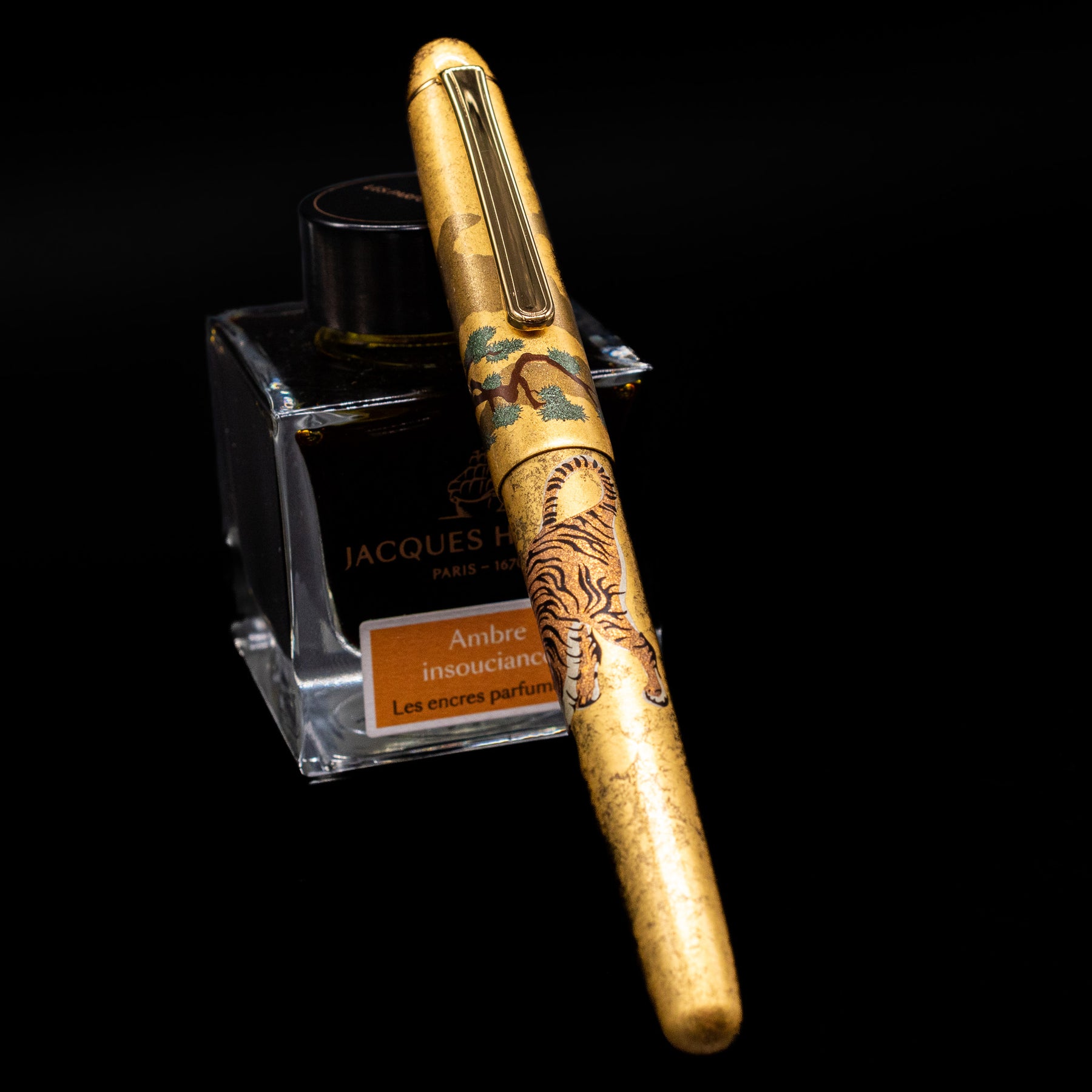 • Deep black resin barrel — dramatic contrast for the gold leaf detailing