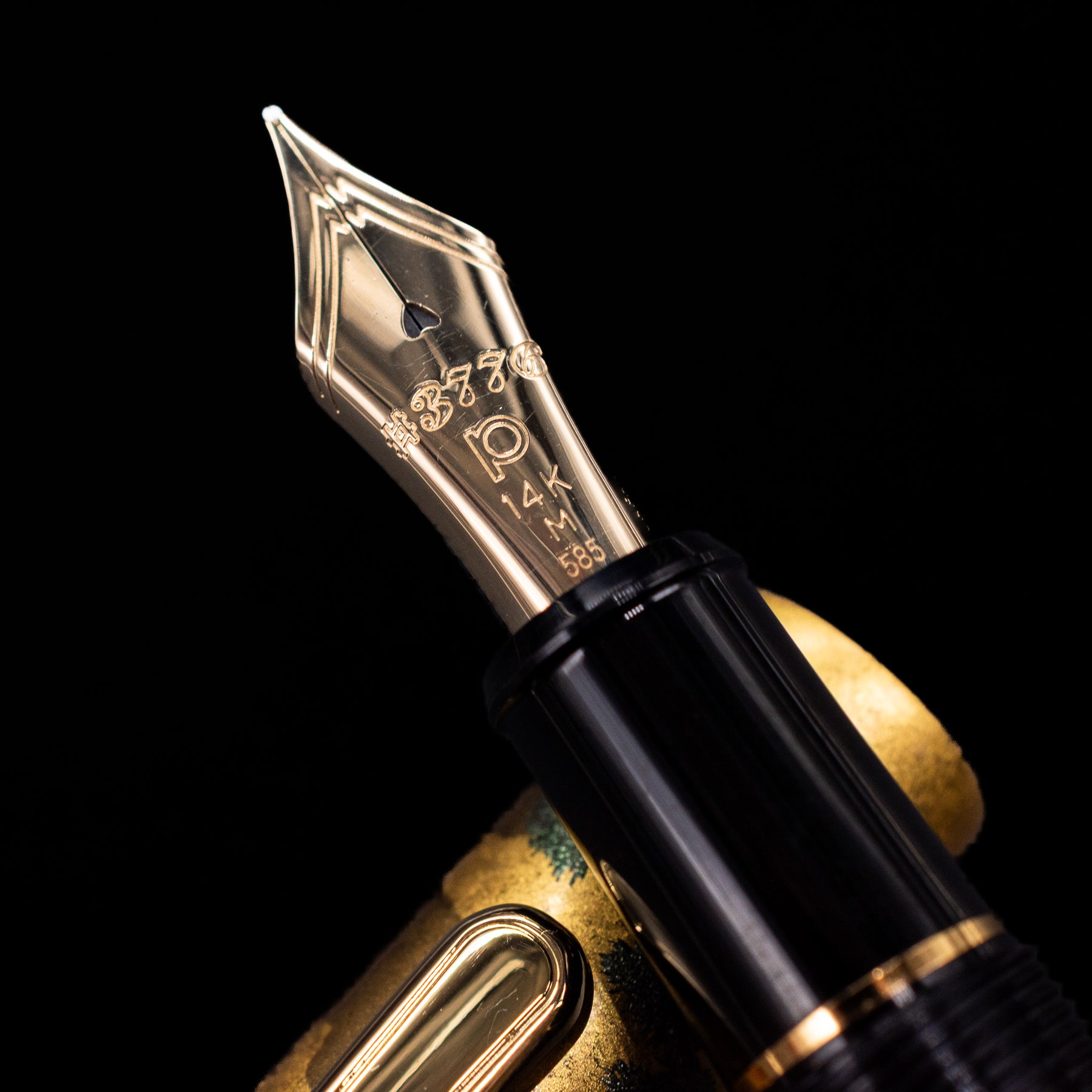 Gold fountain pen with intricate designs on a black background
