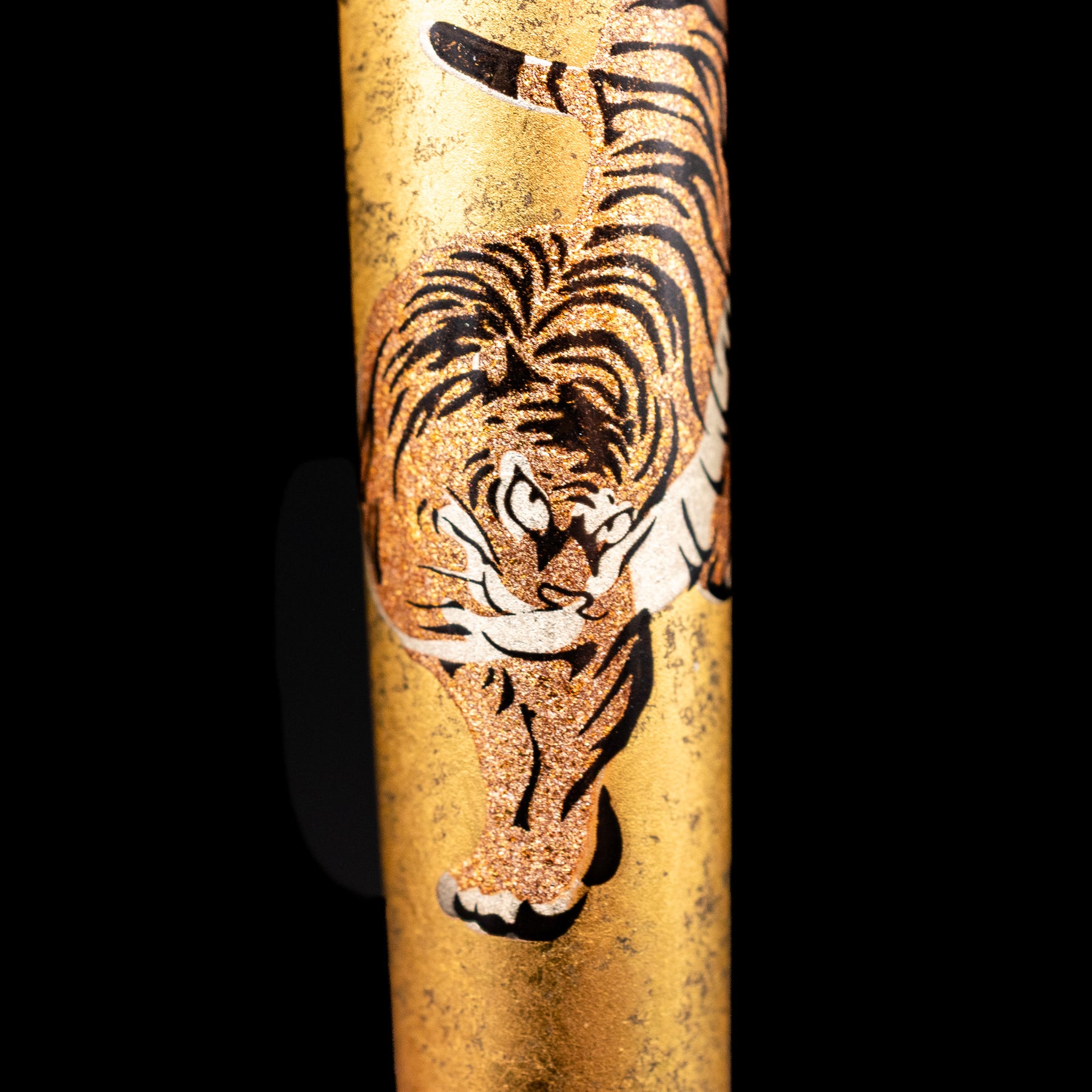Gold cylindrical object with a tiger design on a black background