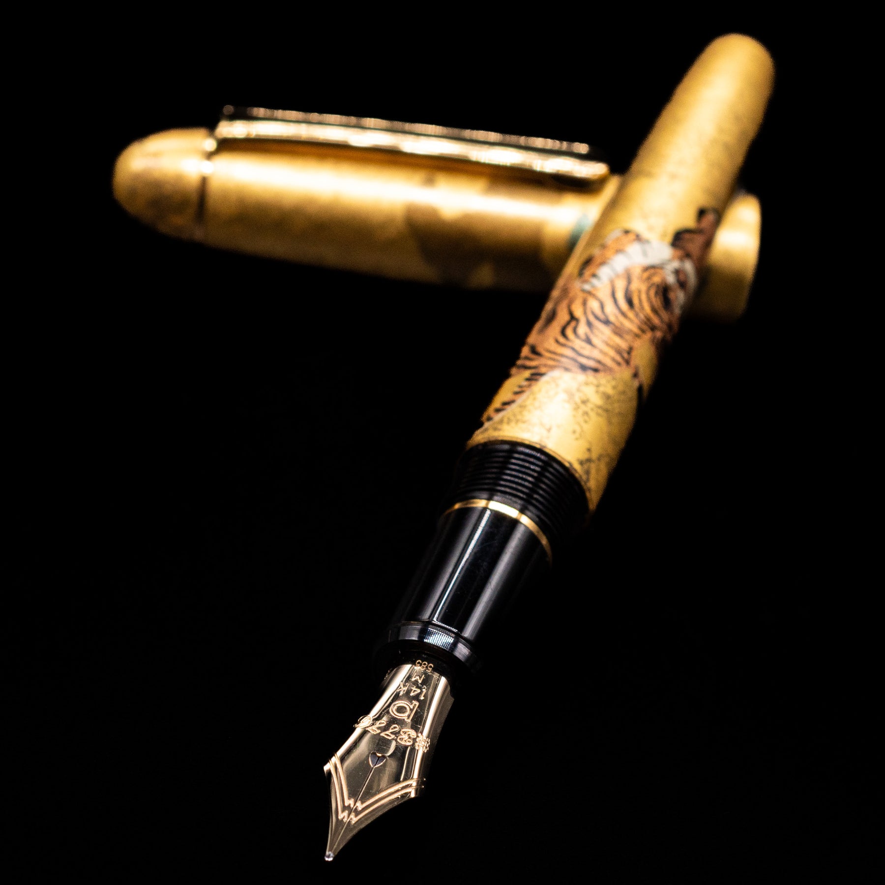 The artwork is set against a deep black resin barrel, allowing the gold leaf detailing to stand out with dramatic contrast and refined elegance. Paired with gold-plated trim, the pen balances visual impact with timeless sophistication, making it as much a collector’s piece as a functional writing instrument.