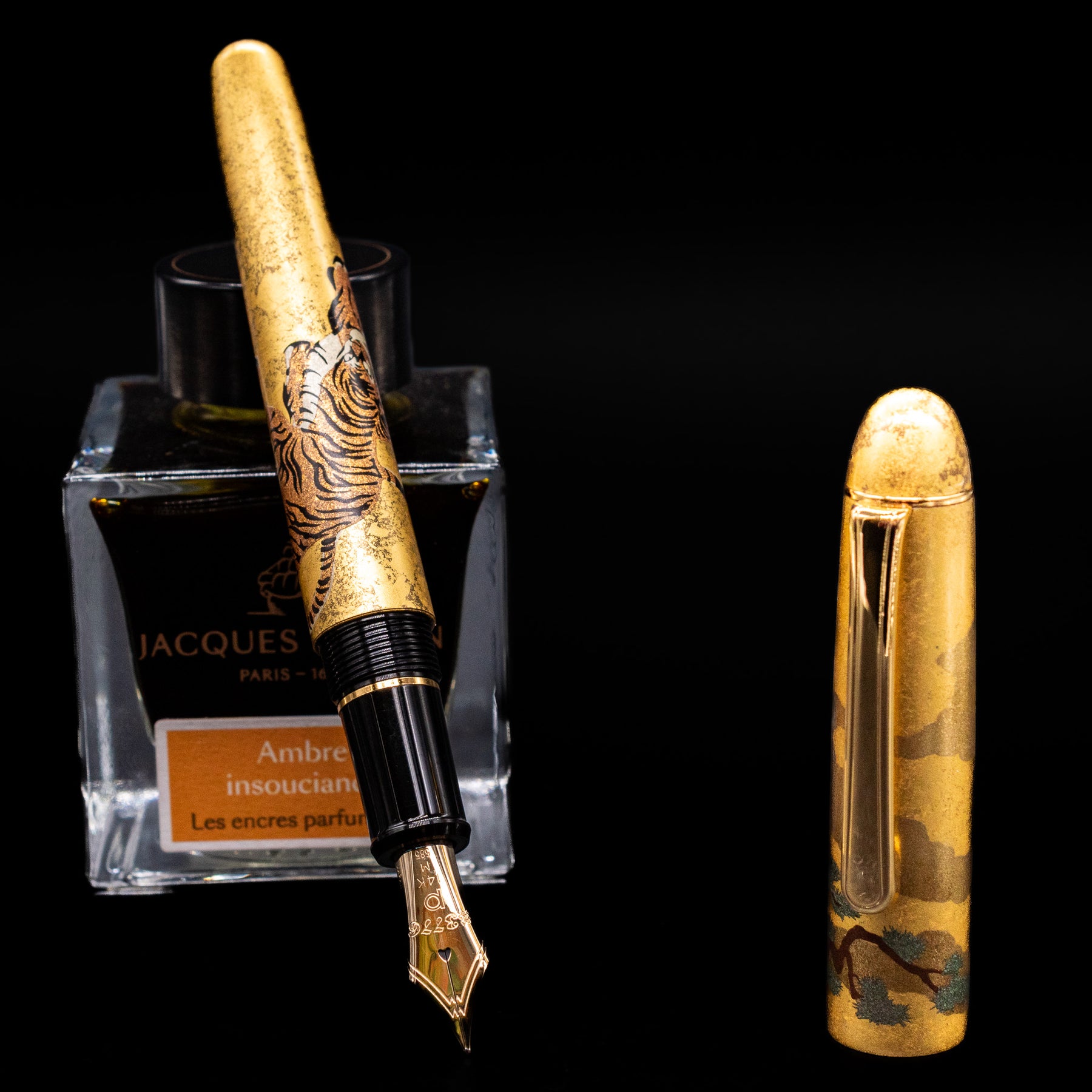 Gold fountain pen with intricate design next to a bottle of Jacques perfume on a black background