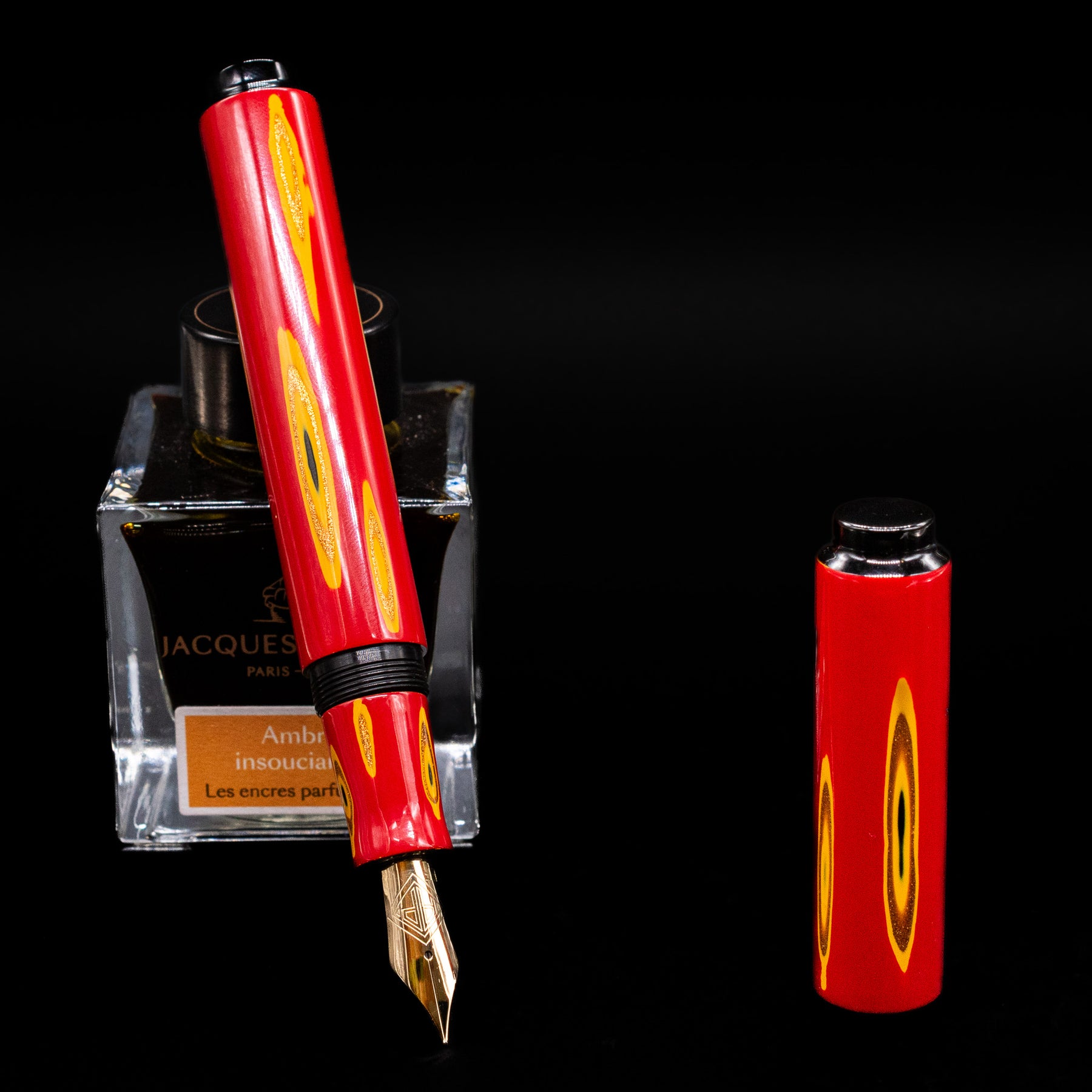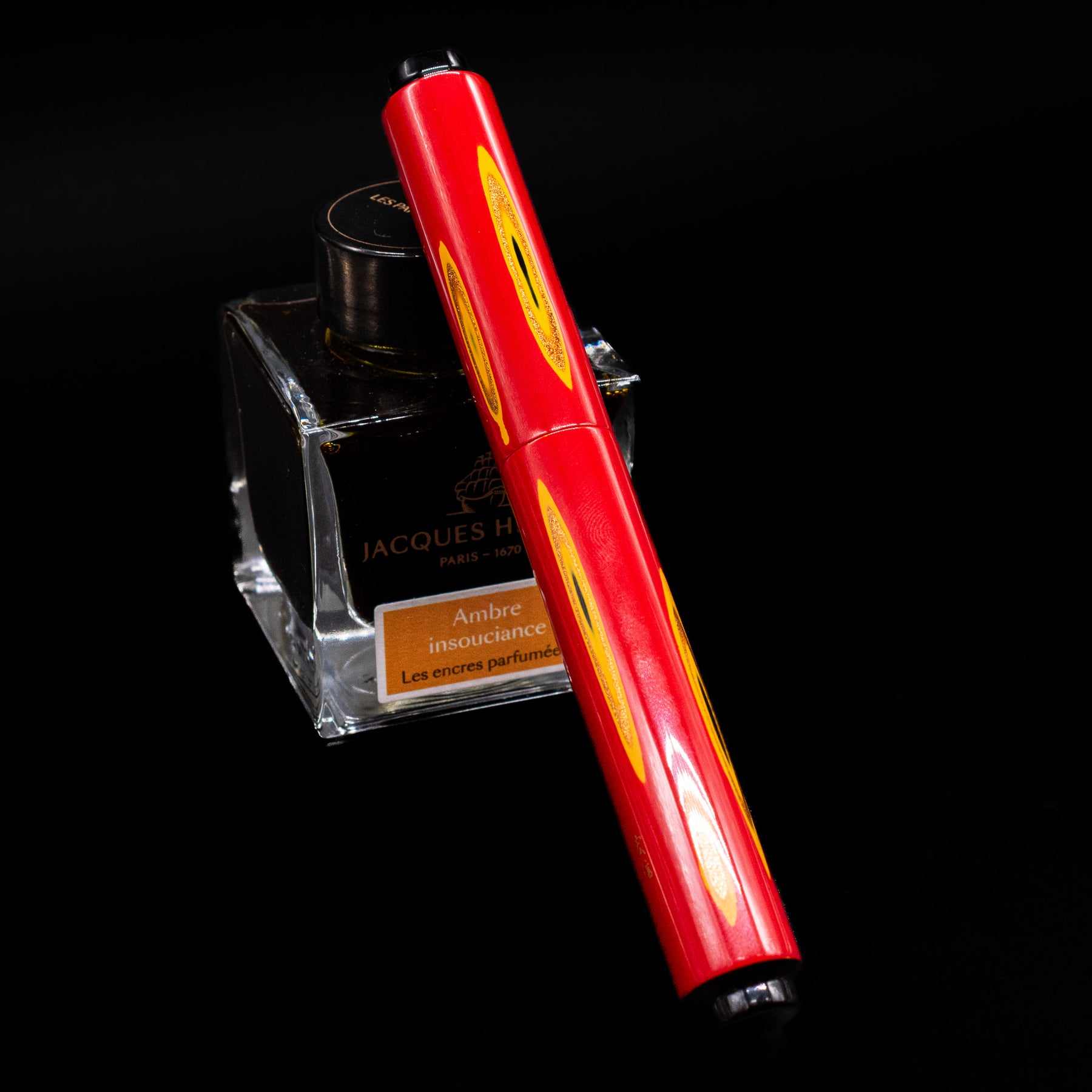 The warm gold nib architecture pairs naturally with the red lacquer palette.