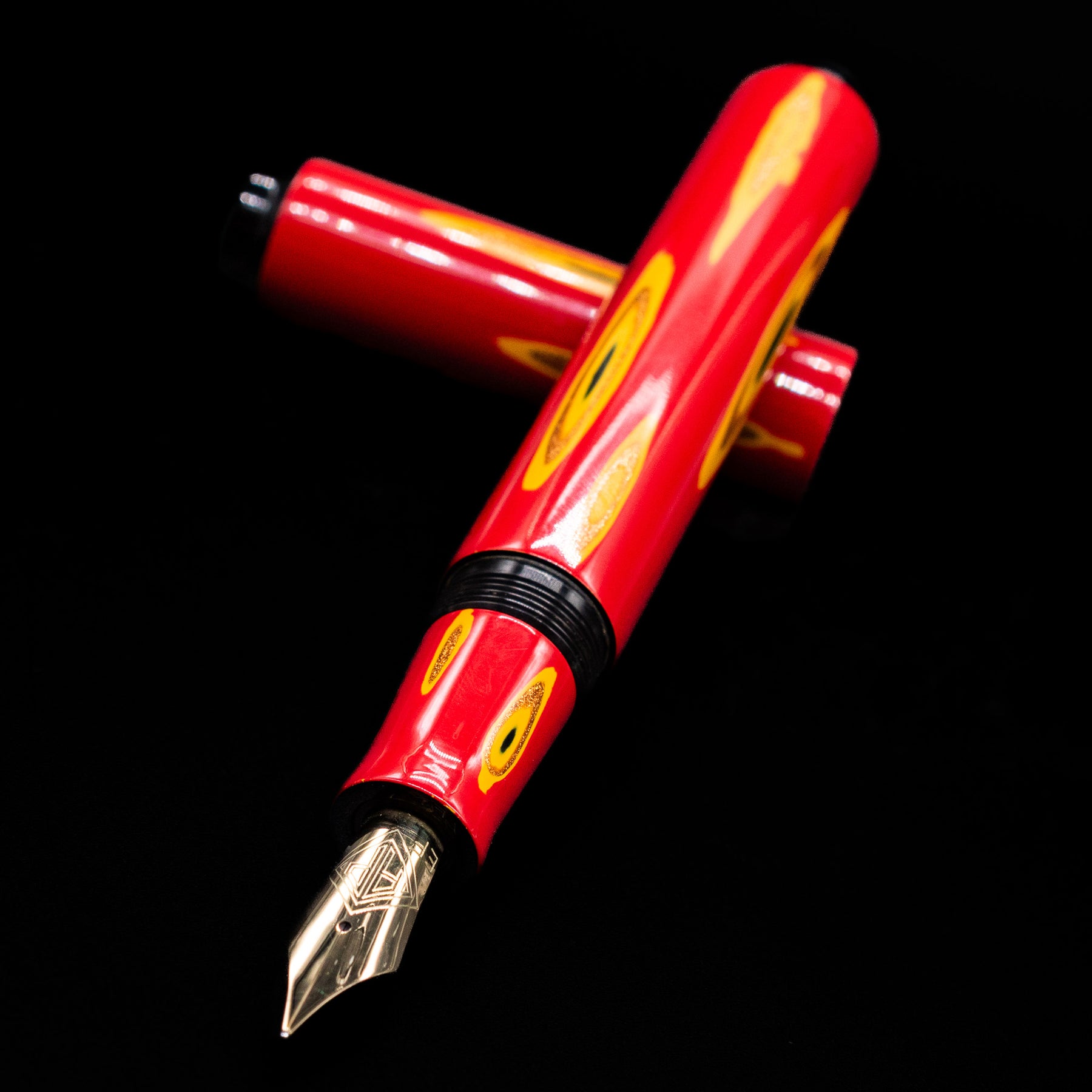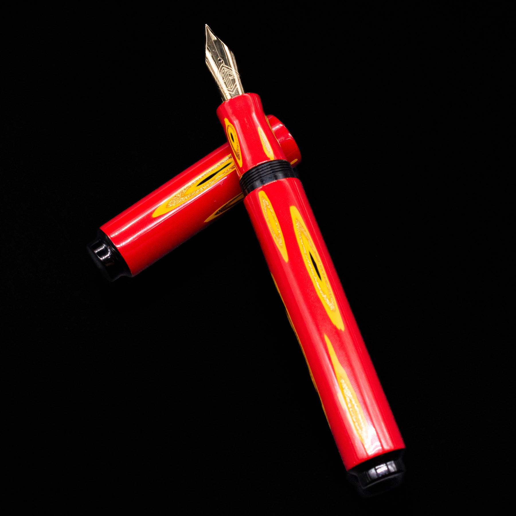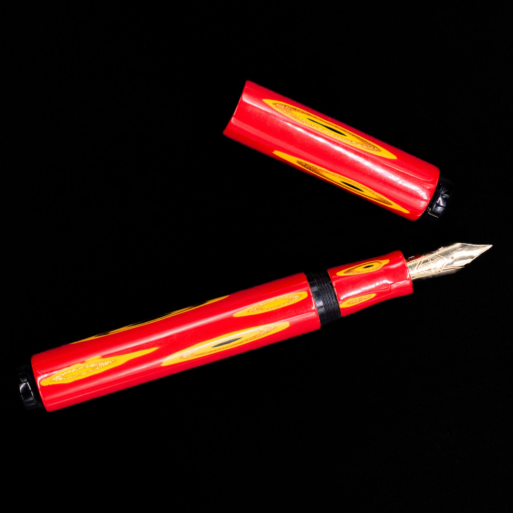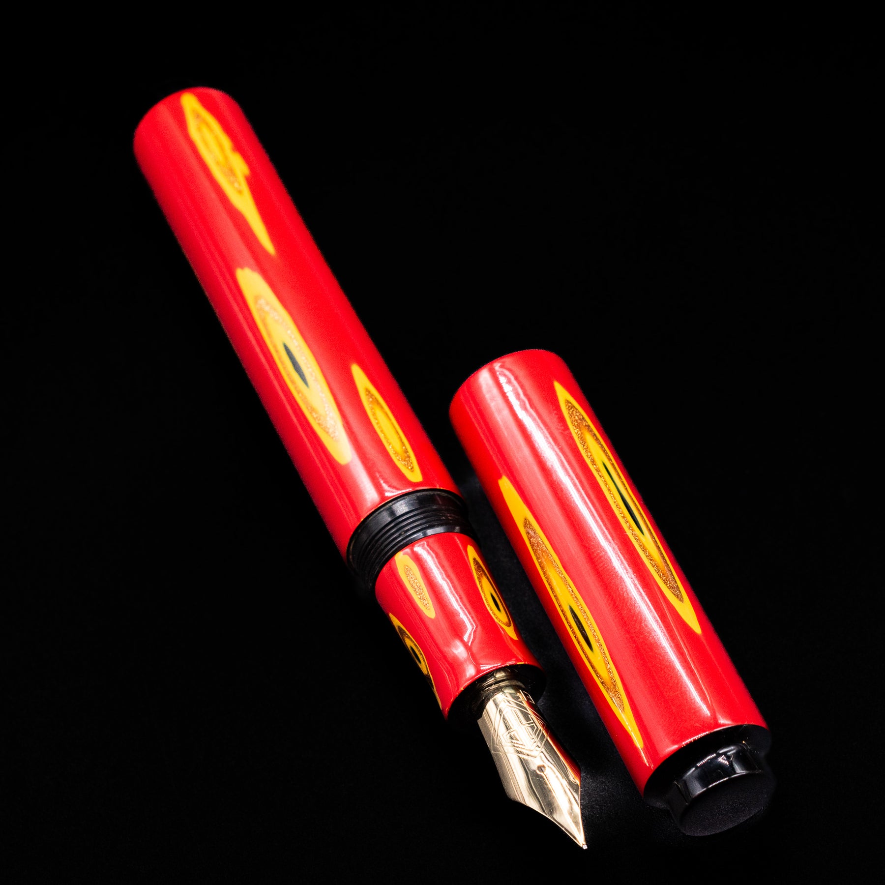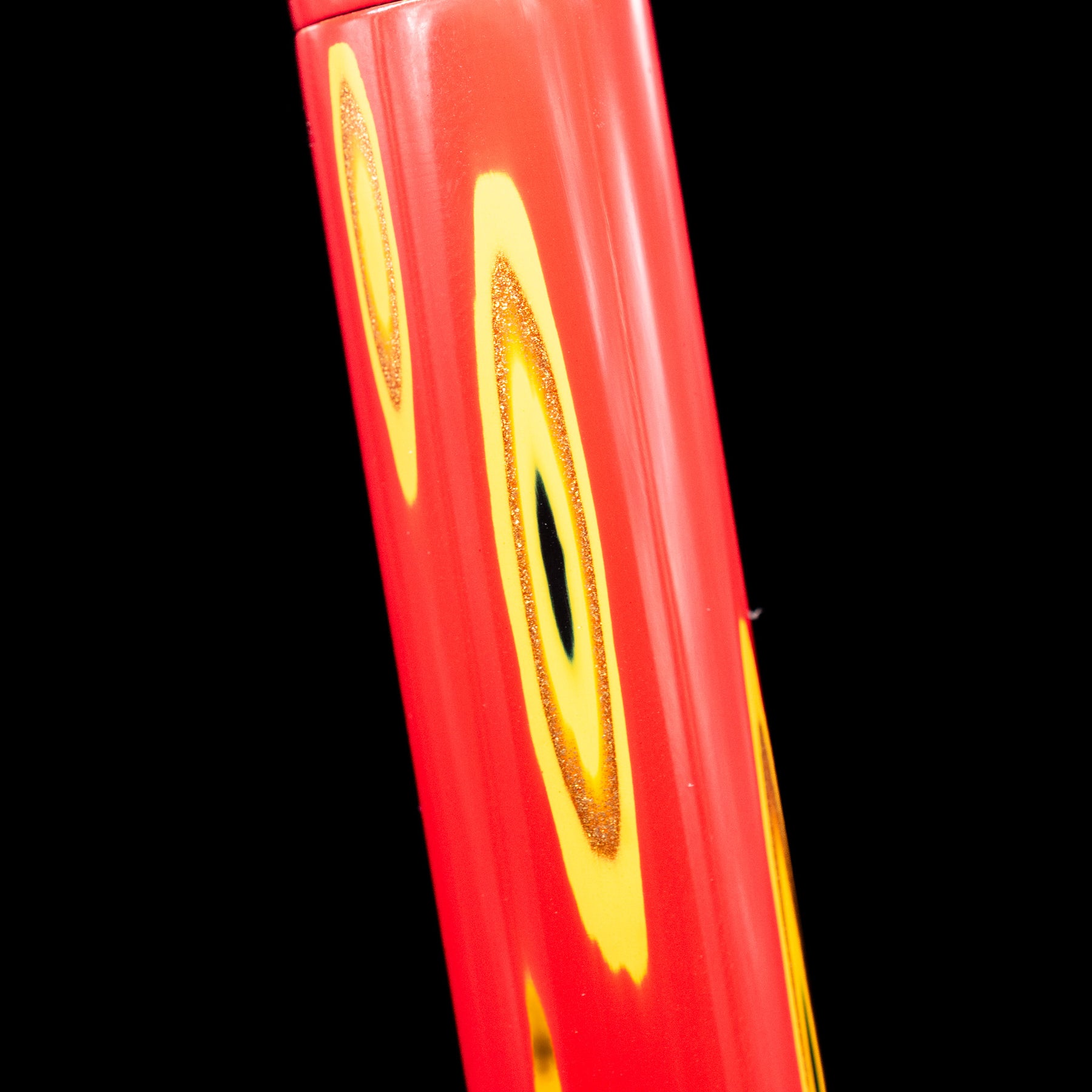 The brighter yellow and warm metallic tones appear suspended beneath the surface, while the surrounding red lacquer softens the transitions. Because the effect is achieved entirely within lacquer, light moves across the pen seamlessly, without the interruption of inlay edges.