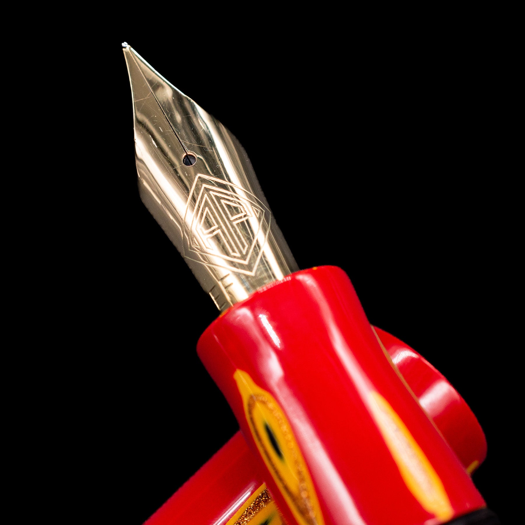A macro shot of the nib with its intricate detailing and logo engraving for the AP Limited Editions Urushi Lacquer Art Fountain Pen - Amorphous Splendor (Red).