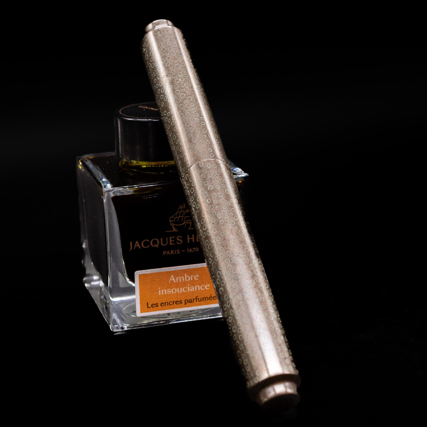 - Intricate repeating dew drop motif across cap and barrel
