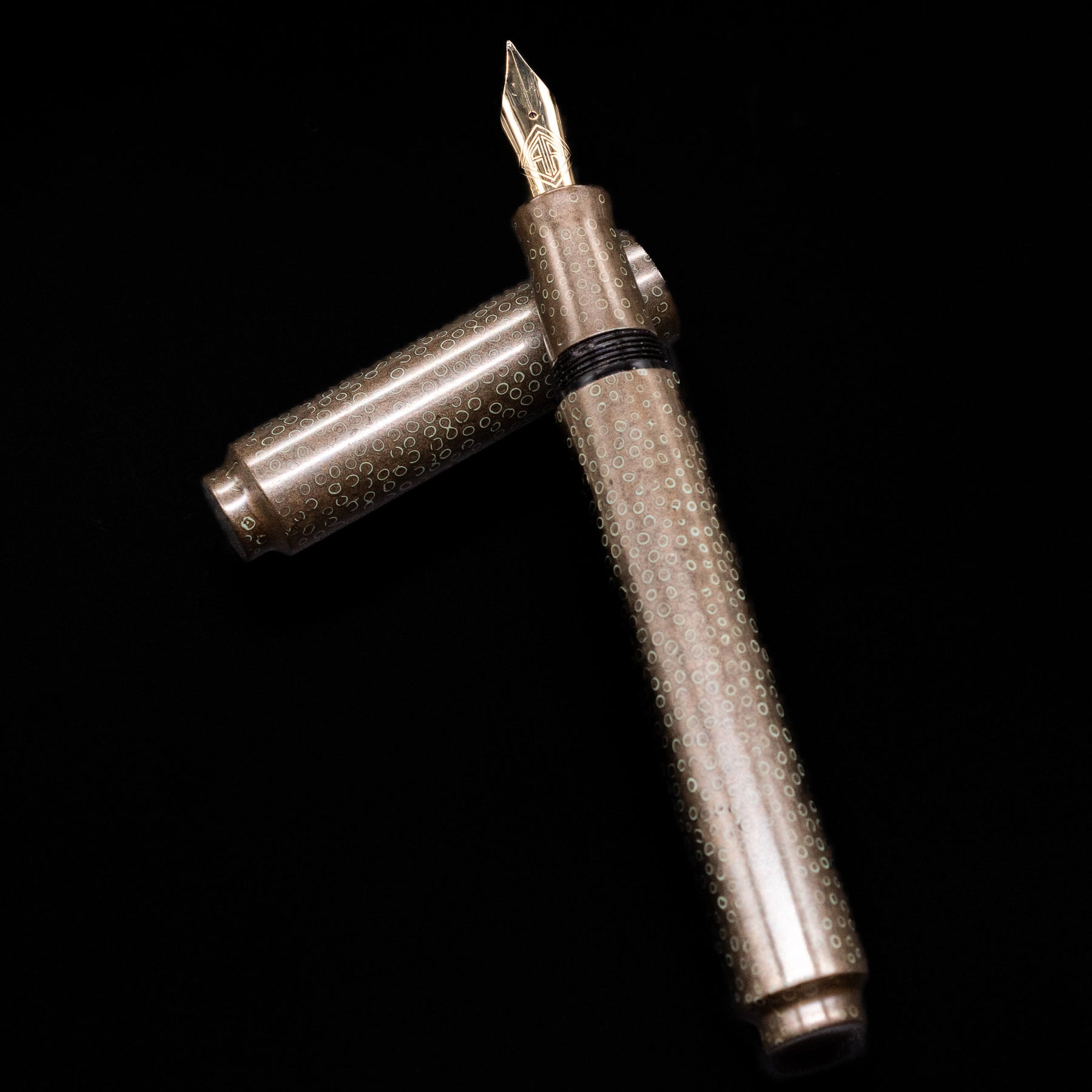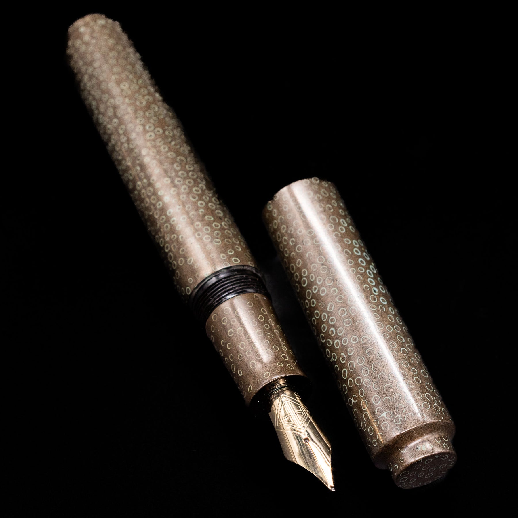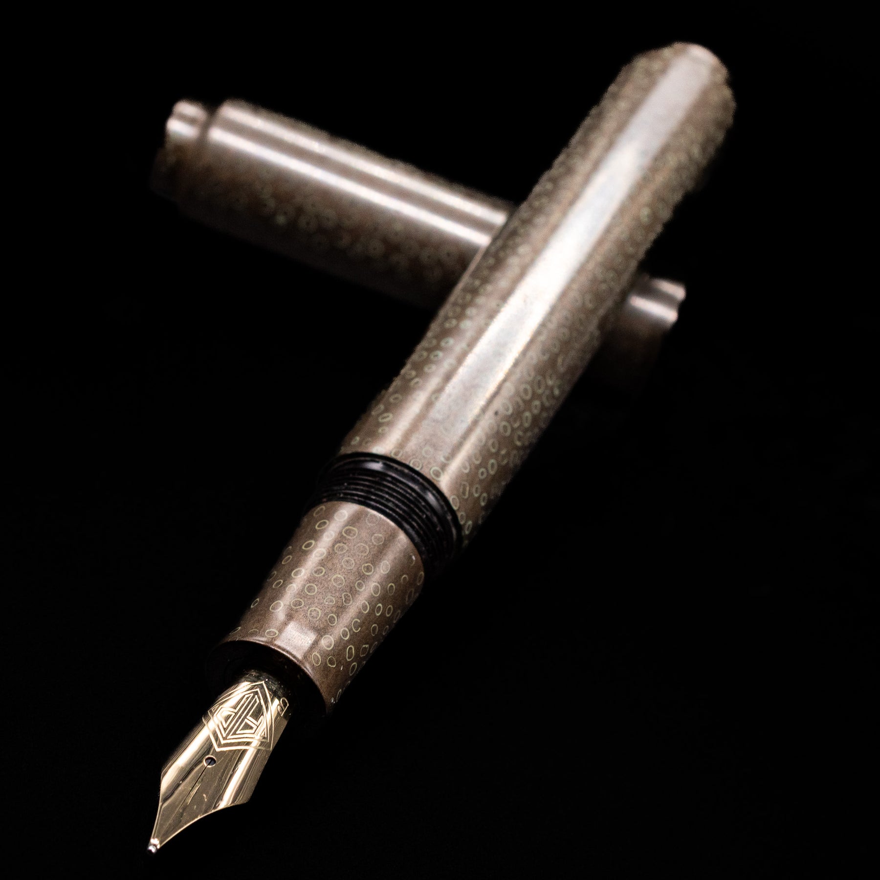 Rendered in a warm smoky taupe-brown lacquer, the pen possesses an understated elegance that reveals itself slowly. Across its surface, delicate circular motifs shimmer like droplets suspended in twilight, evoking dew illuminated by the last traces of evening light. The effect is subtle yet mesmerizing, offering texture, movement, and an almost meditative rhythm across the pen’s silhouette.