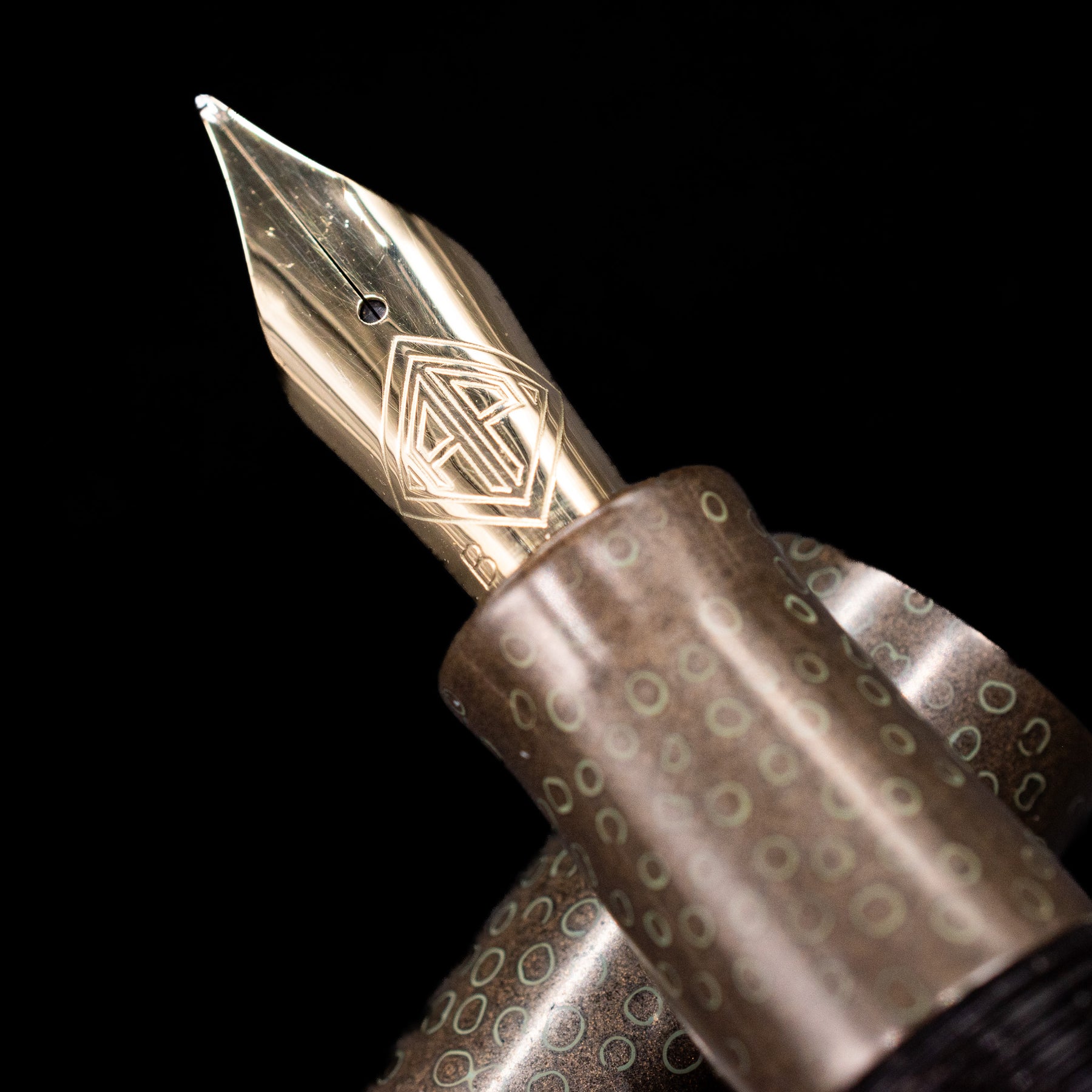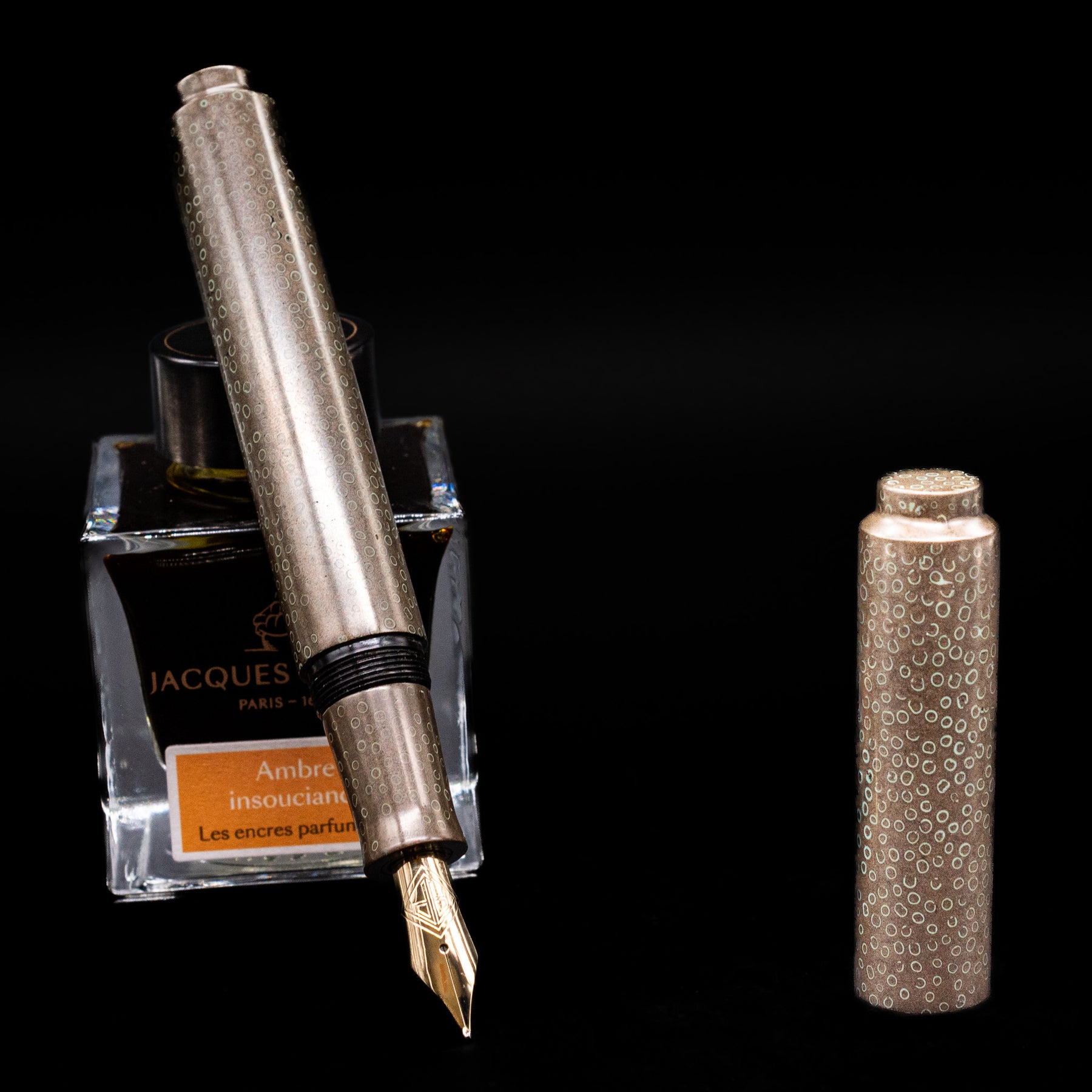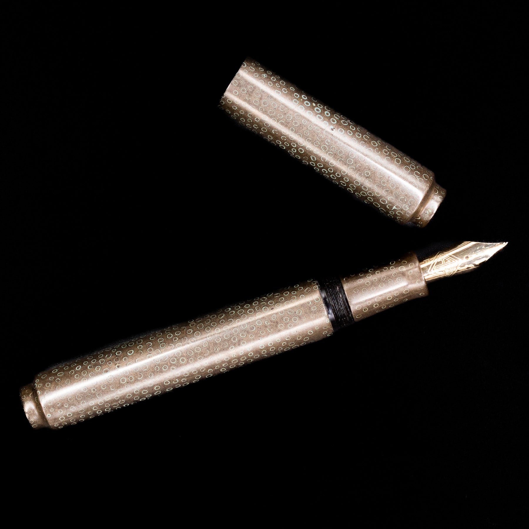Rendered in a warm smoky taupe-brown lacquer, the pen possesses an understated elegance that reveals itself slowly. Across its surface, delicate circular motifs shimmer like droplets suspended in twilight, evoking dew illuminated by the last traces of evening light. The effect is subtle yet mesmerizing, offering texture, movement, and an almost meditative rhythm across the pen’s silhouette.