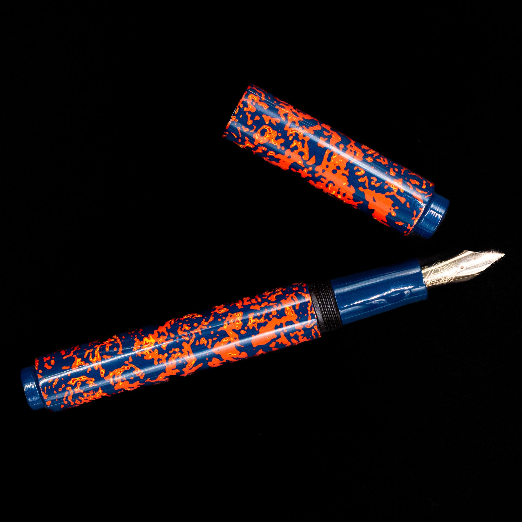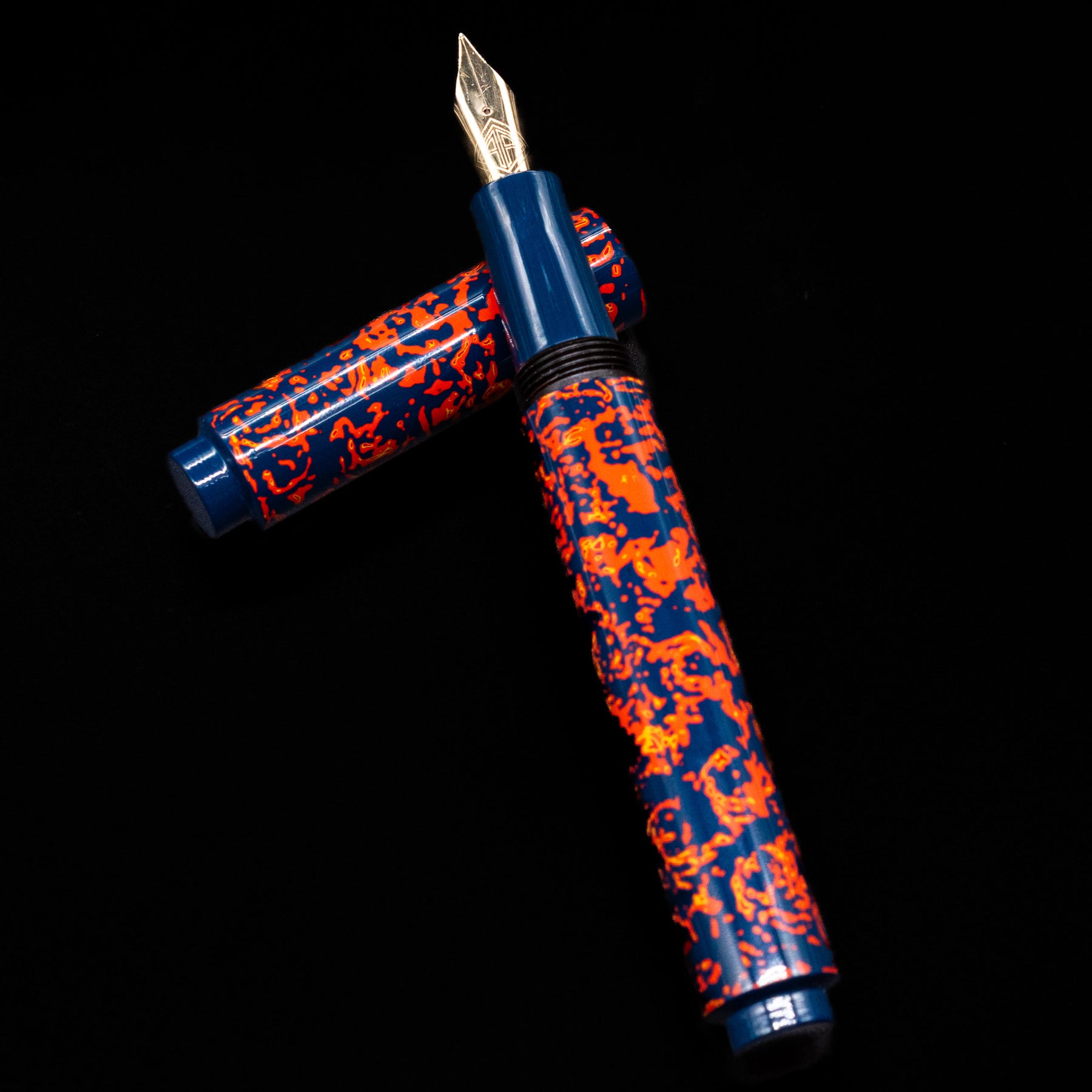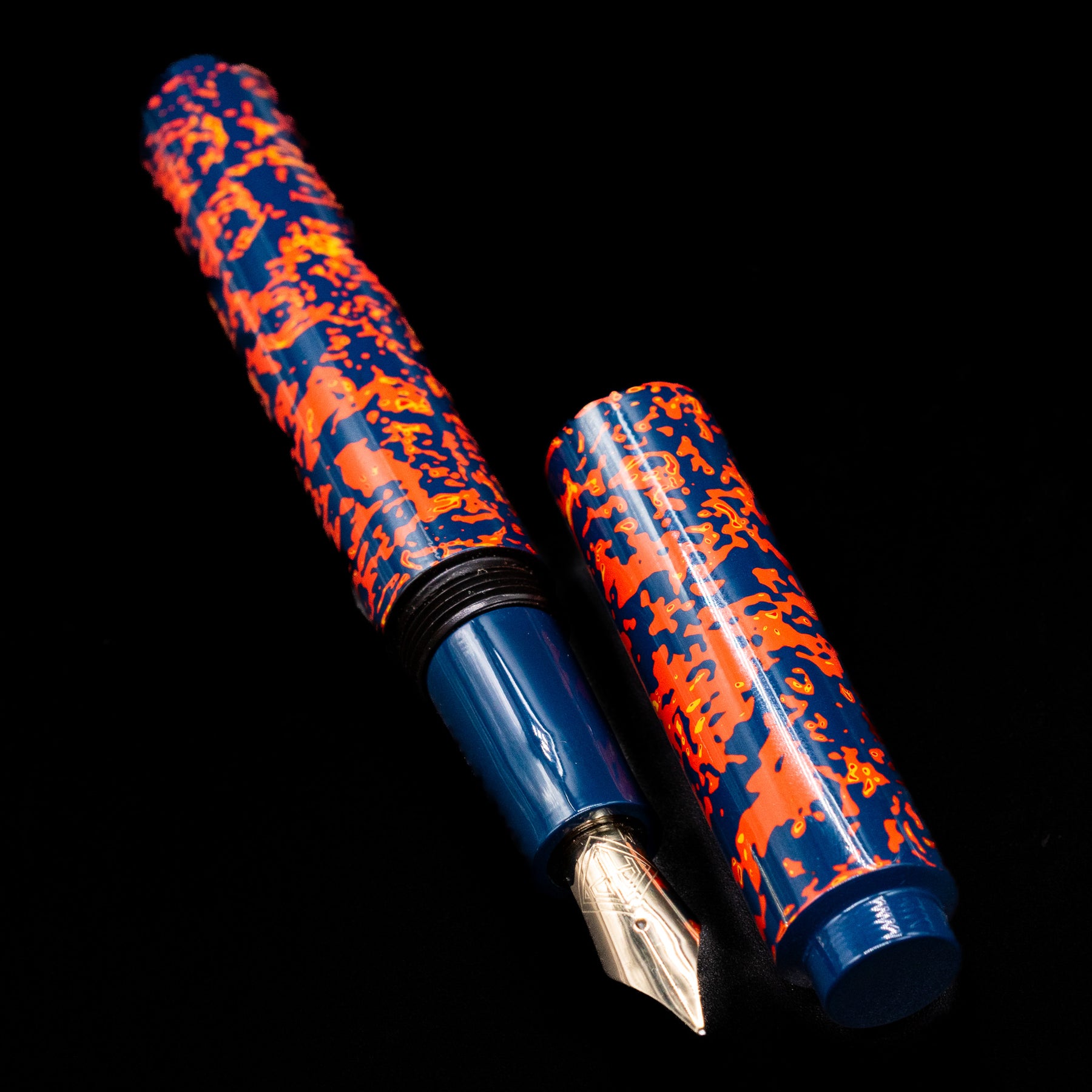Its visual language is immediately arresting. A deep midnight-blue urushi ground forms the canvas for an explosive field of glowing vermillion-orange forms that move across the cap and barrel like living fire. The pattern feels organic and spontaneous, suggestive of sparks riding on wind, molten lava threading through cooled stone, or ember fragments suspended in the dark. Rather than repeating as a rigid motif, the composition flows continuously, giving the pen a sense of motion and energy that changes as it is turned in the light.