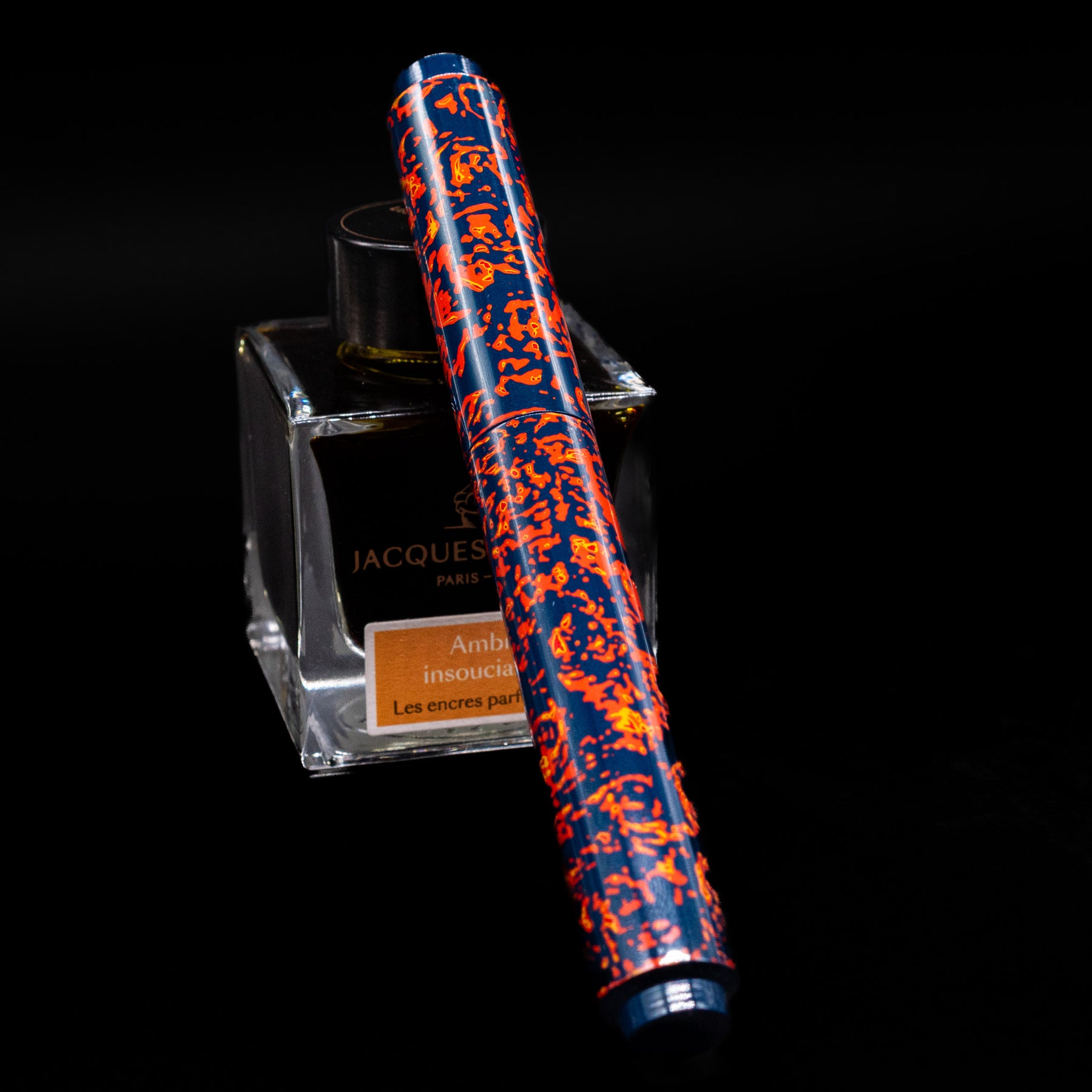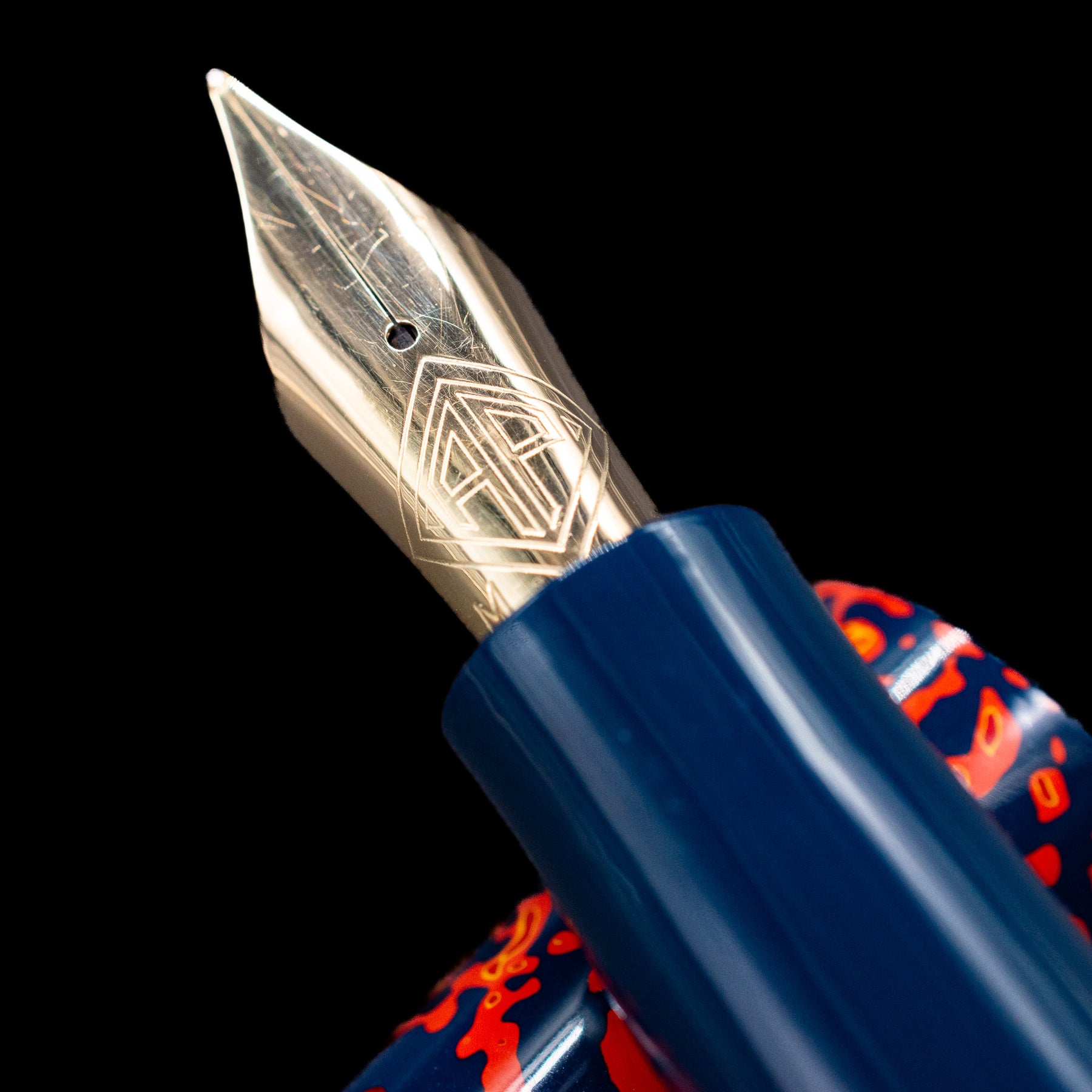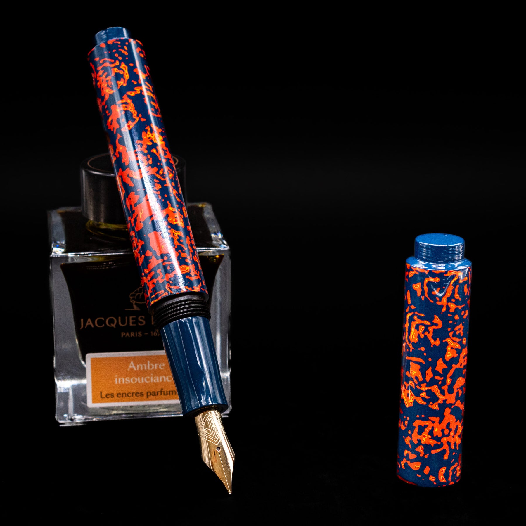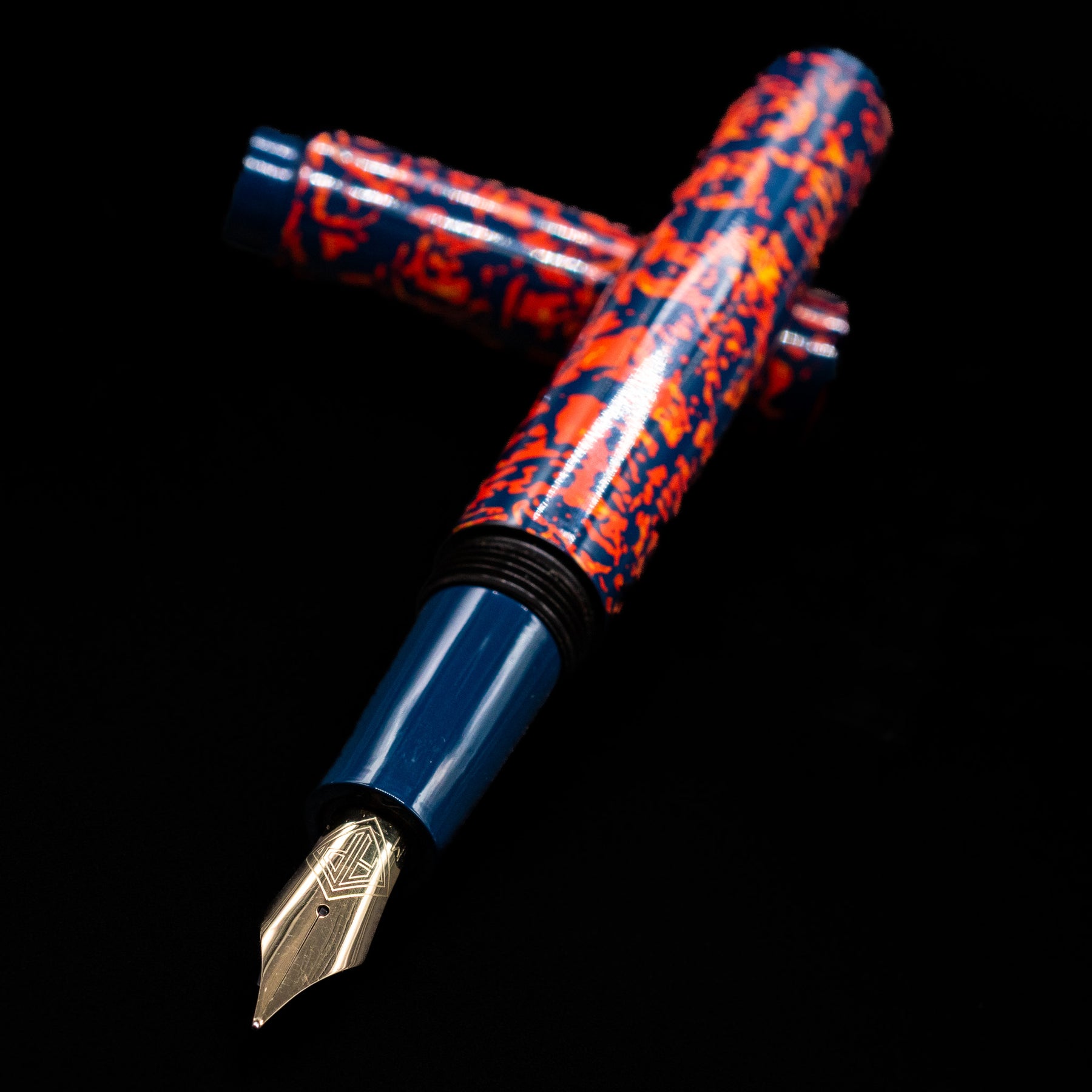 Its visual language is immediately arresting. A deep midnight-blue urushi ground forms the canvas for an explosive field of glowing vermillion-orange forms that move across the cap and barrel like living fire. The pattern feels organic and spontaneous, suggestive of sparks riding on wind, molten lava threading through cooled stone, or ember fragments suspended in the dark. Rather than repeating as a rigid motif, the composition flows continuously, giving the pen a sense of motion and energy that changes as it is turned in the light.
