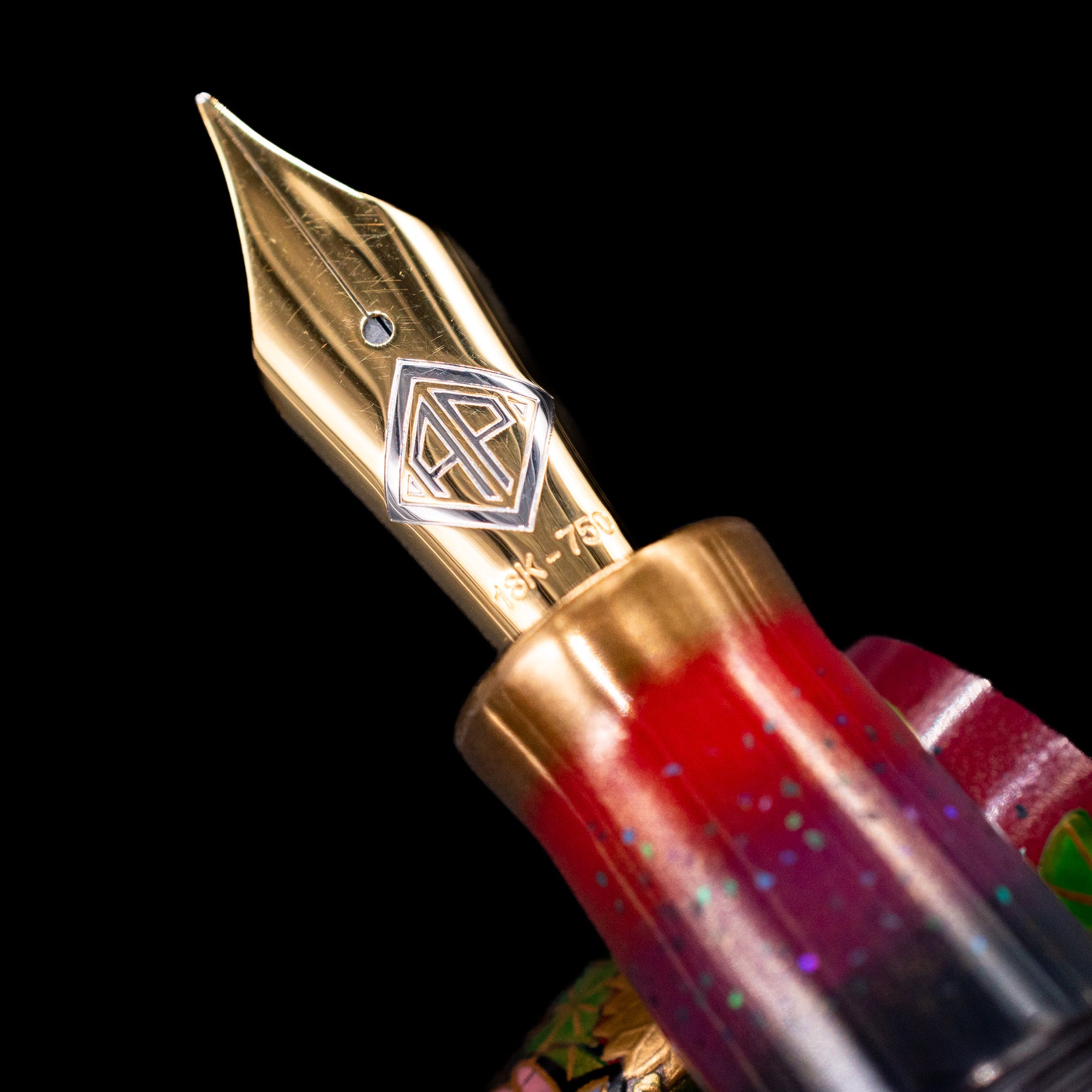 A macro shot of the nib with its intricate detailing and logo engraving for the AP Limited Editions Writer Maki-e Fountain Pen - Illumination.