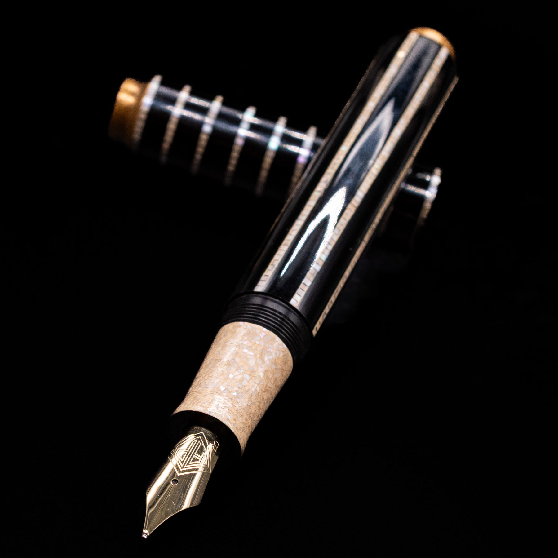 AP Limited Editions Writer Maki-e Fountain Pen - Magical Mother of Pearl laying across its own cap, crossed, with a focus on the nib.