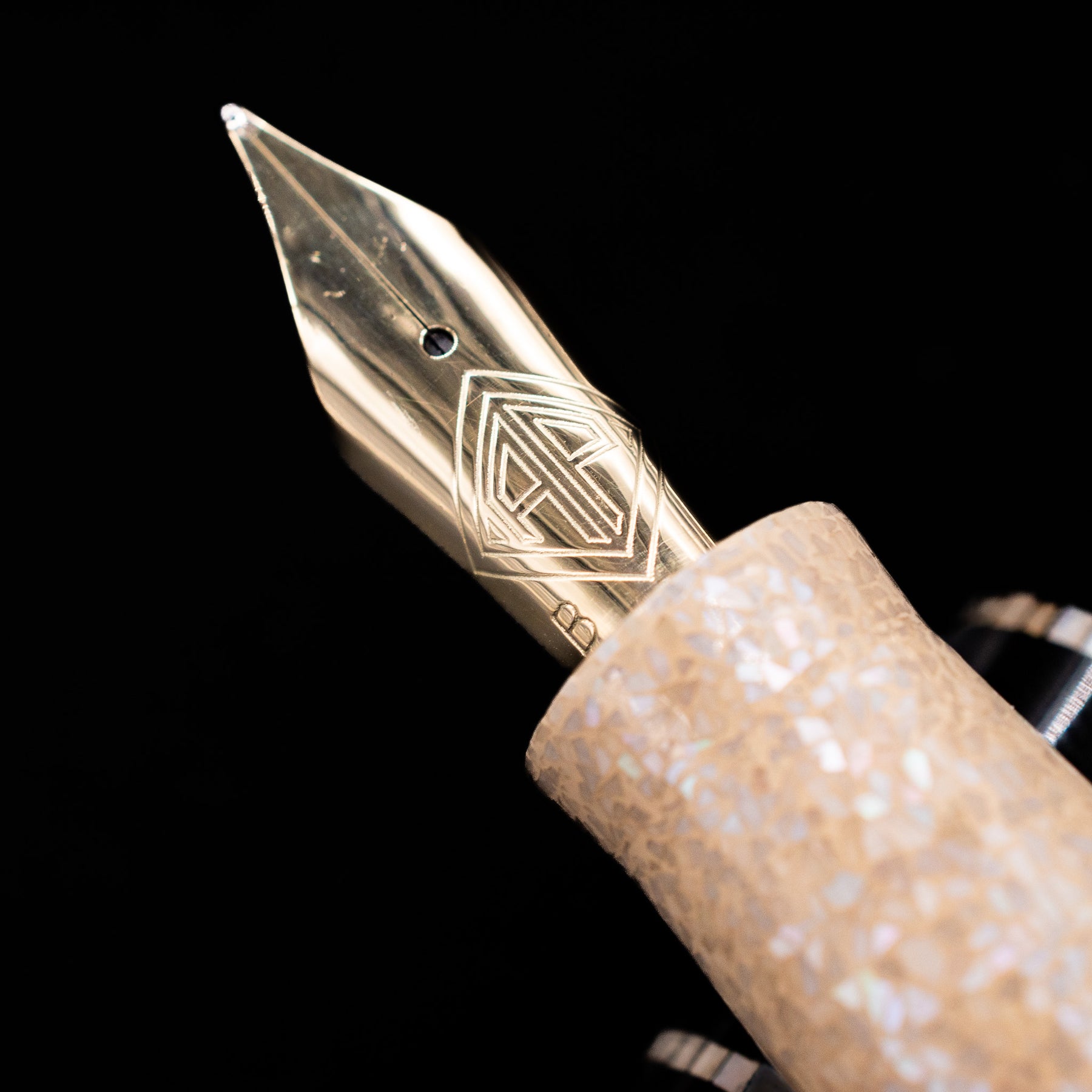 A macro shot of the nib with its intricate detailing and logo engraving for the AP Limited Editions Writer Maki-e Fountain Pen - Magical Mother of Pearl.