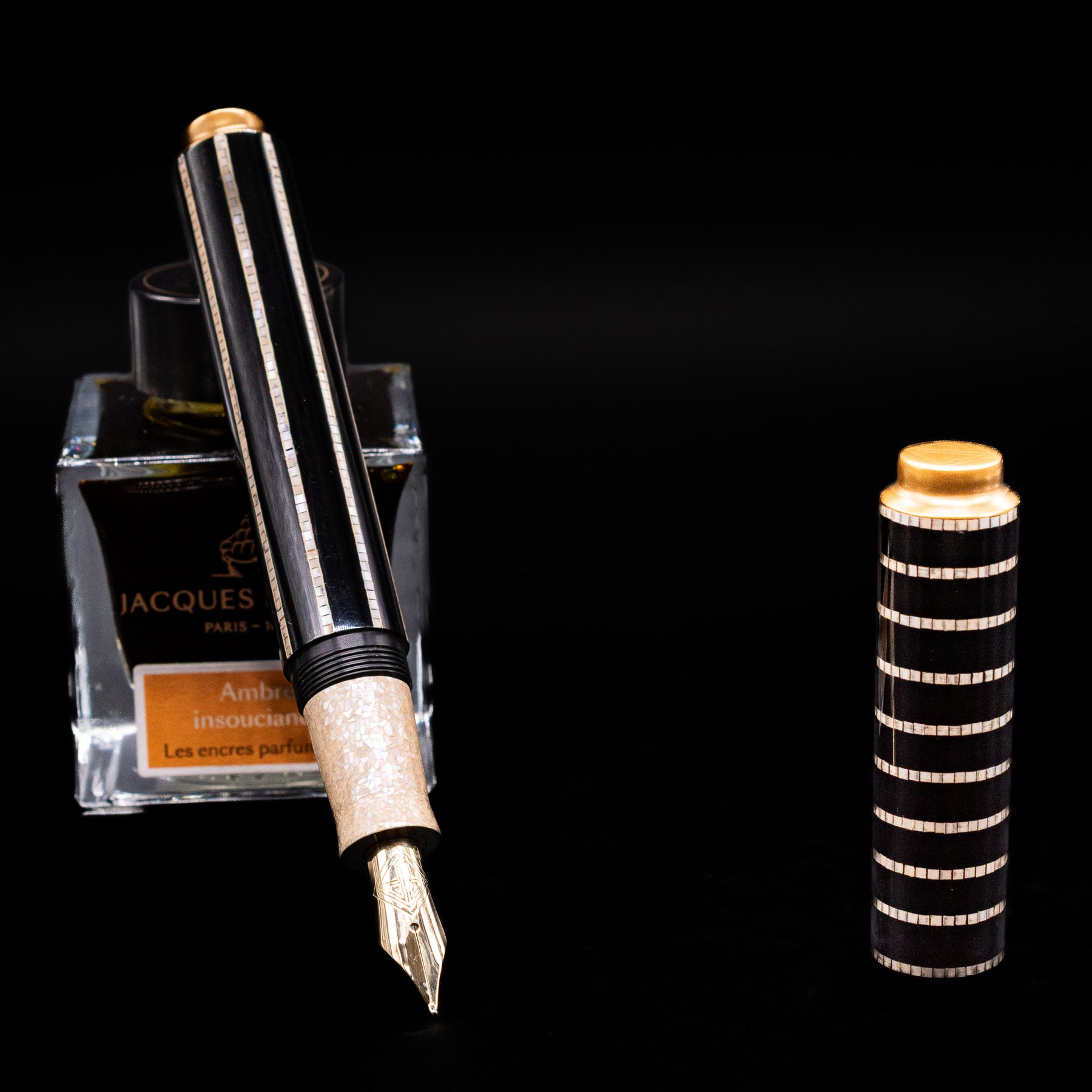 AP Limited Editions Writer Maki-e Fountain Pen - Magical Mother of Pearl capped, leaning against an ink bottle.