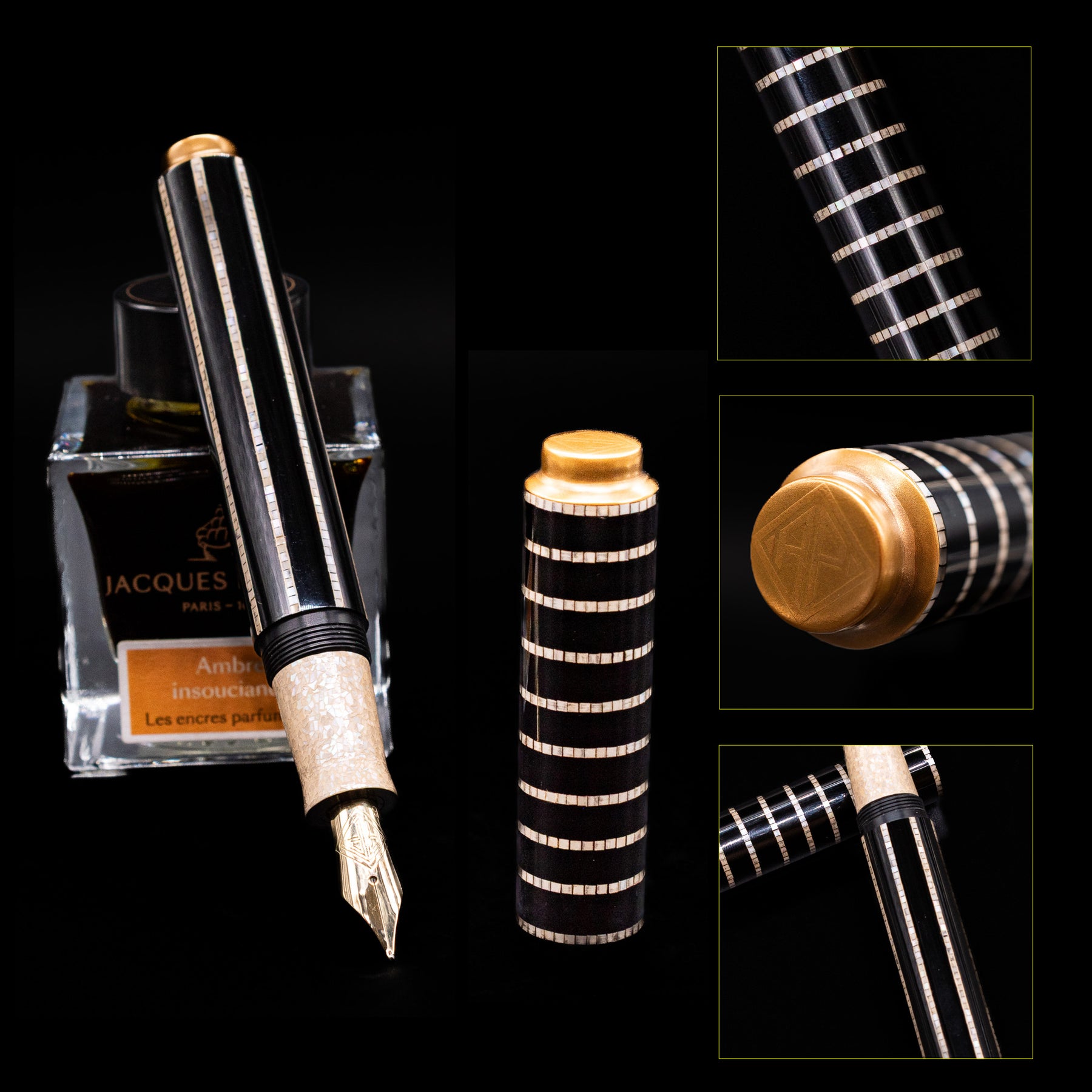 AP Limited Editions Writer Maki-e Fountain Pen - Magical Mother of Pearl leaning on an ink bottle uncapped showcasing the detailing on the nib with the cap standing next to it. Then, 3 olive gold squares sit to the right showcasing 3 different close-ups of the same fountain pen.