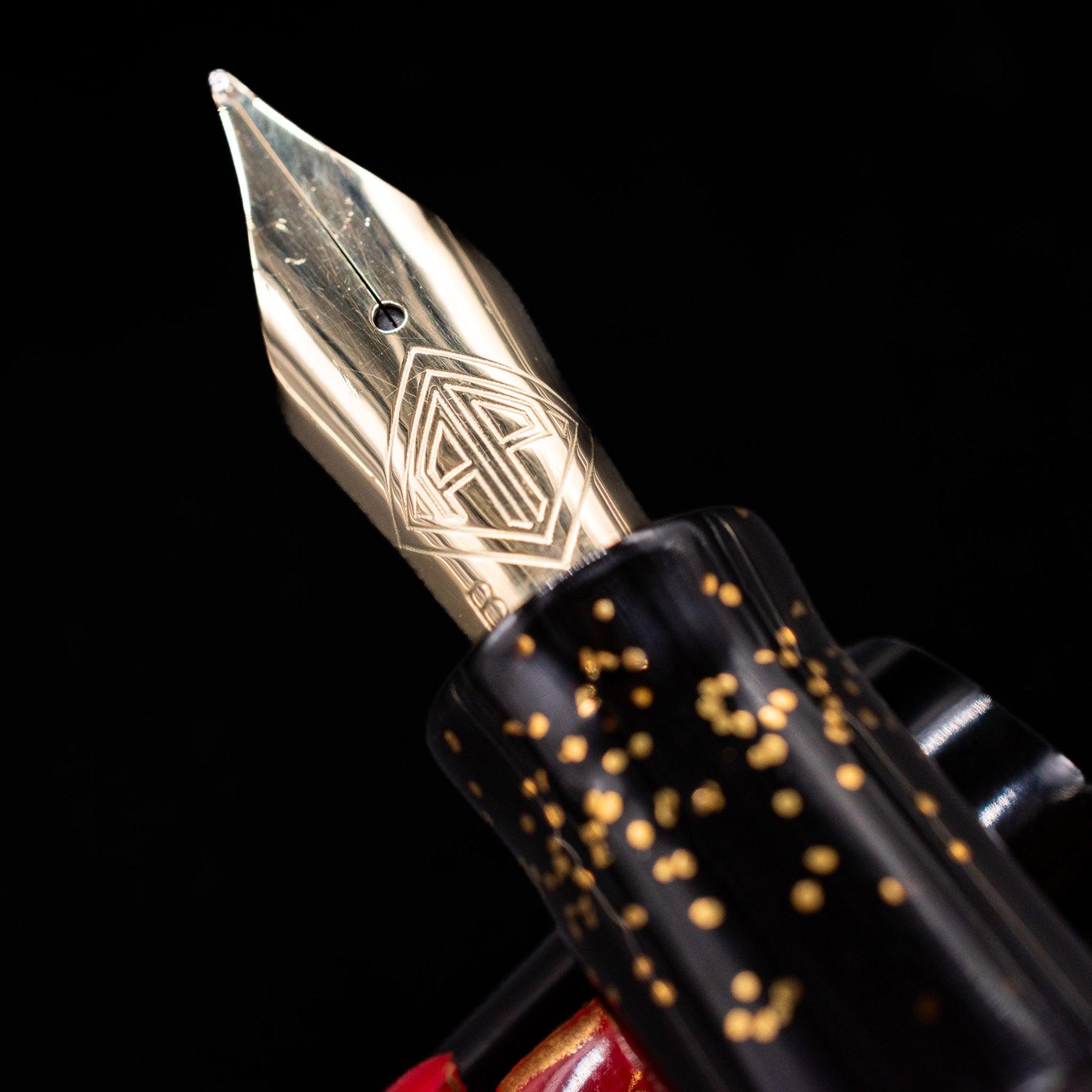 A macro shot of the nib with its intricate detailing and logo engraving for the AP Limited Editions Writer Maki-e Fountain Pen - Playful Poppies.