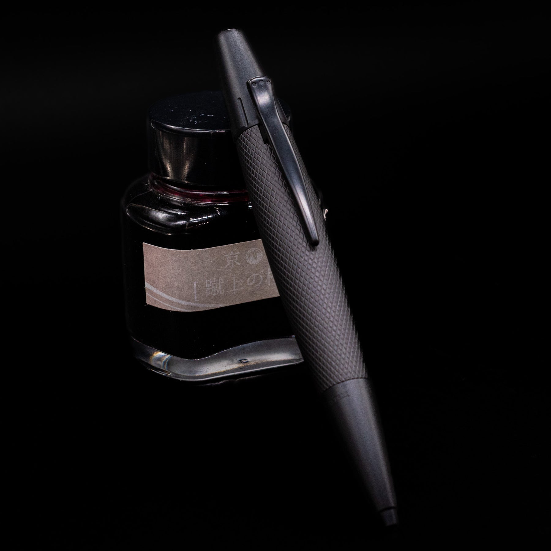 Graf von Faber-Castell E-Motion Ballpoint Pen - Pure Black leaning against an ink bottle.