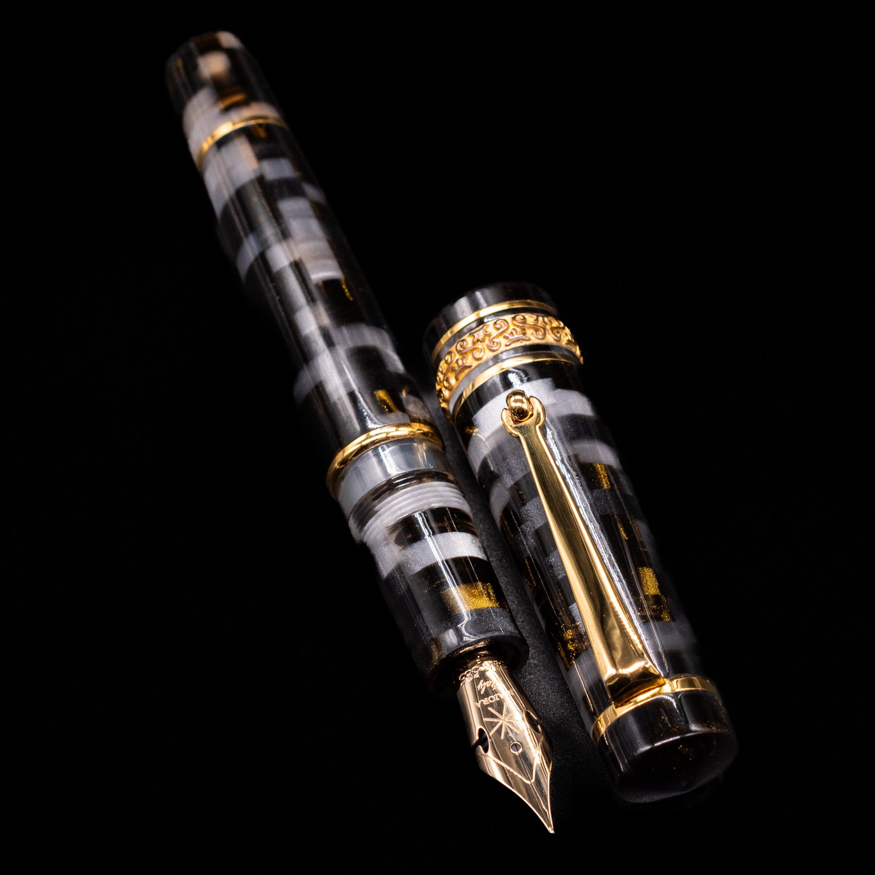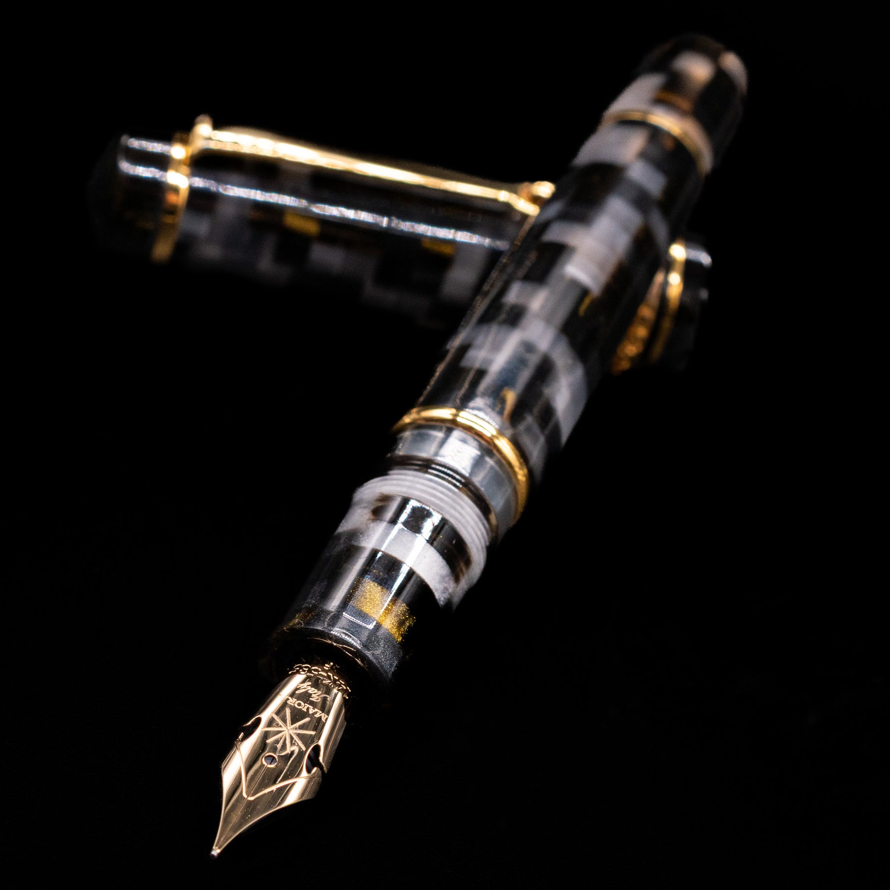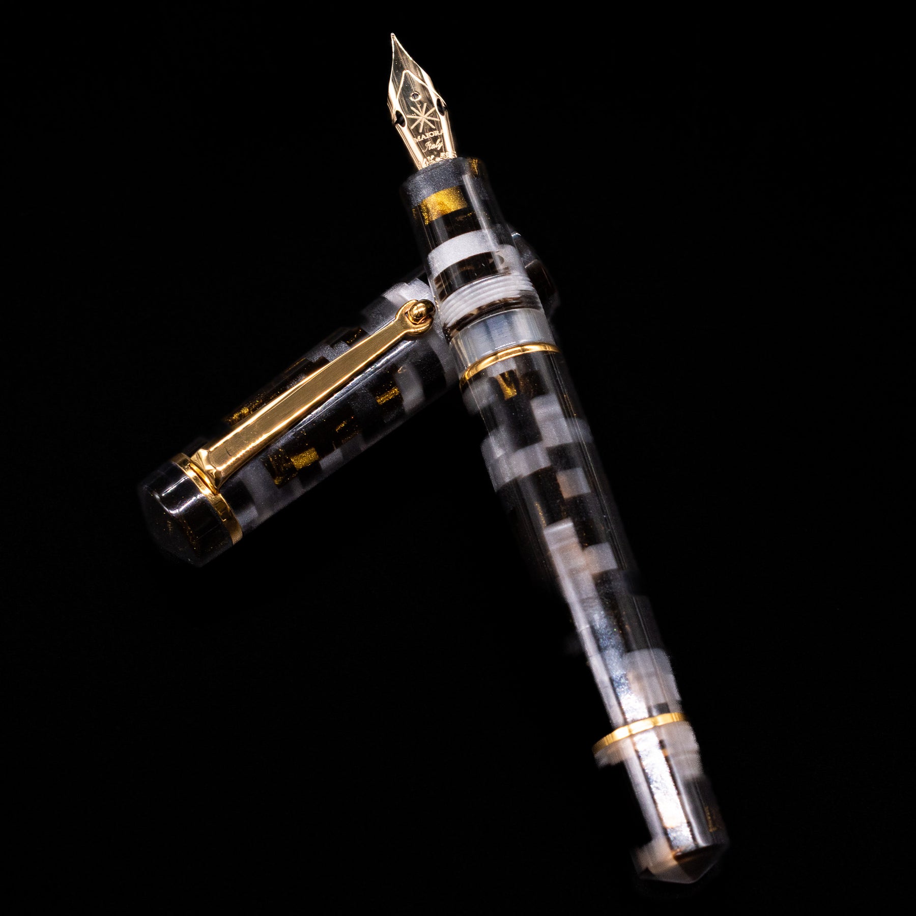 A new fountain pen collection by the Maiora Pen Company, the Alpha is made with raw materials of only Italian origin, with very special and exclusive color effects. This fountain pen features a stacked resin with shades of grey/silver, gold, and black, and a beautifully engraved centerband. The cap's centerband is made from sterling silver, plated in gold.