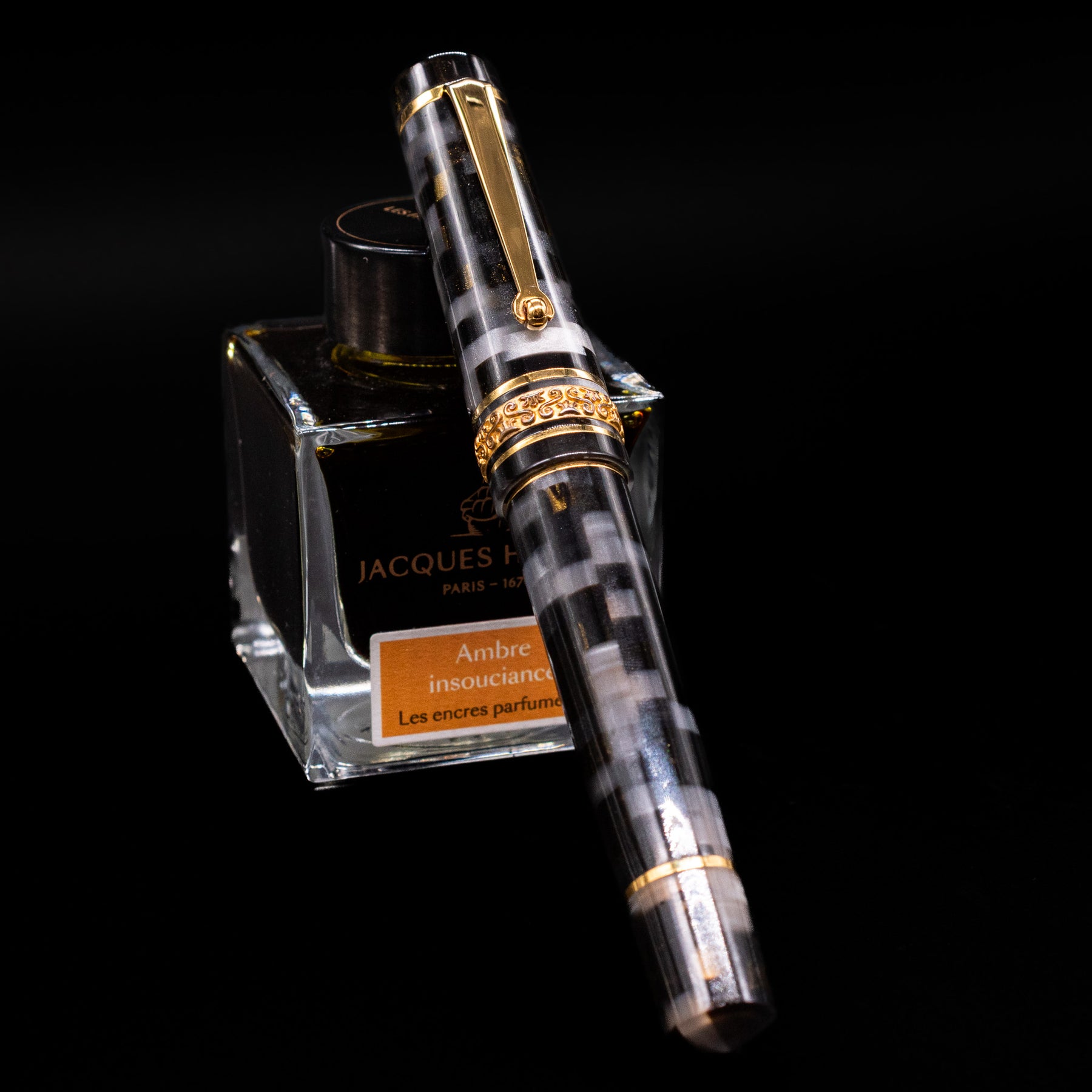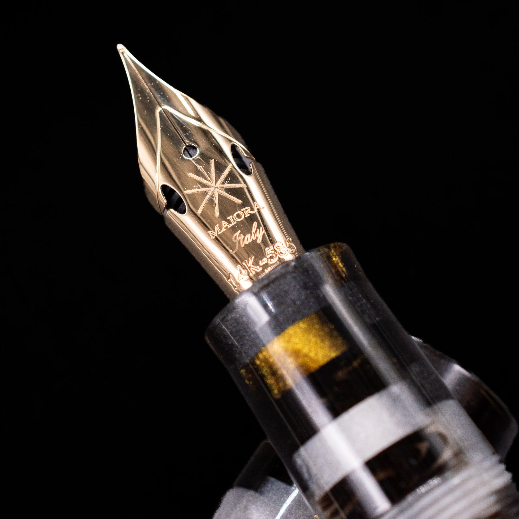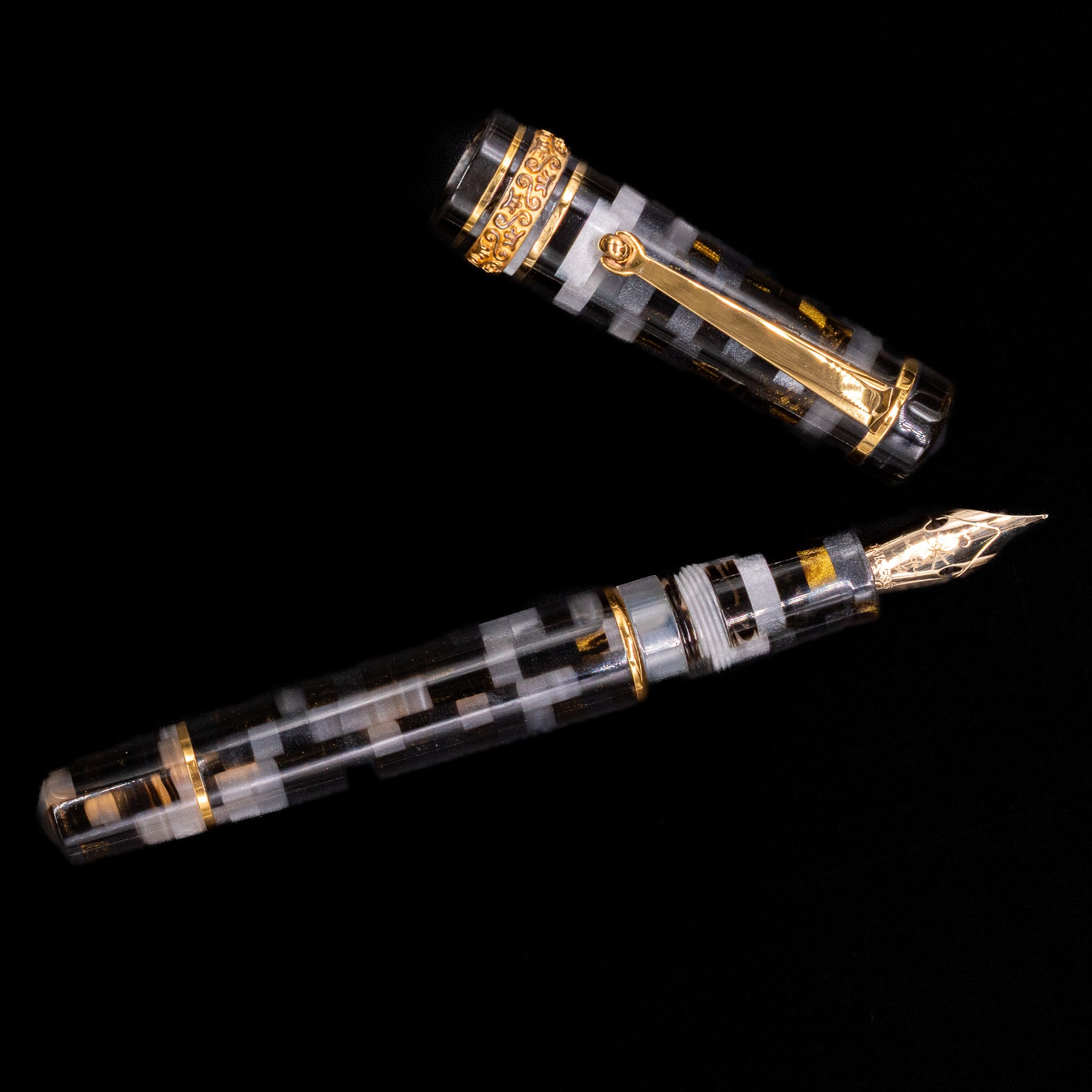 A new fountain pen collection by the Maiora Pen Company, the Alpha is made with raw materials of only Italian origin, with very special and exclusive color effects. This fountain pen features a stacked resin with shades of grey/silver, gold, and black, and a beautifully engraved centerband. The cap's centerband is made from sterling silver, plated in gold.