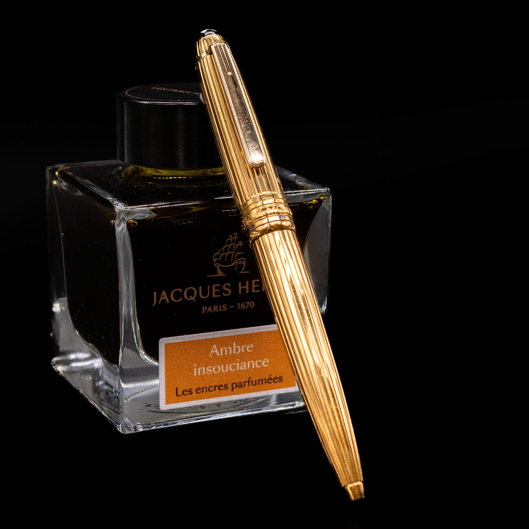 Polished accents, including the signature white Montblanc emblem prominently displayed on the cap top, beautifully complement the vermeil body and offer a sophisticated contrast that is unmistakably Montblanc. The clip and trim rings carry Montblanc’s traditional design language, refined with gold-tone detailing that adds cohesion to the pen’s luxurious aesthetic.