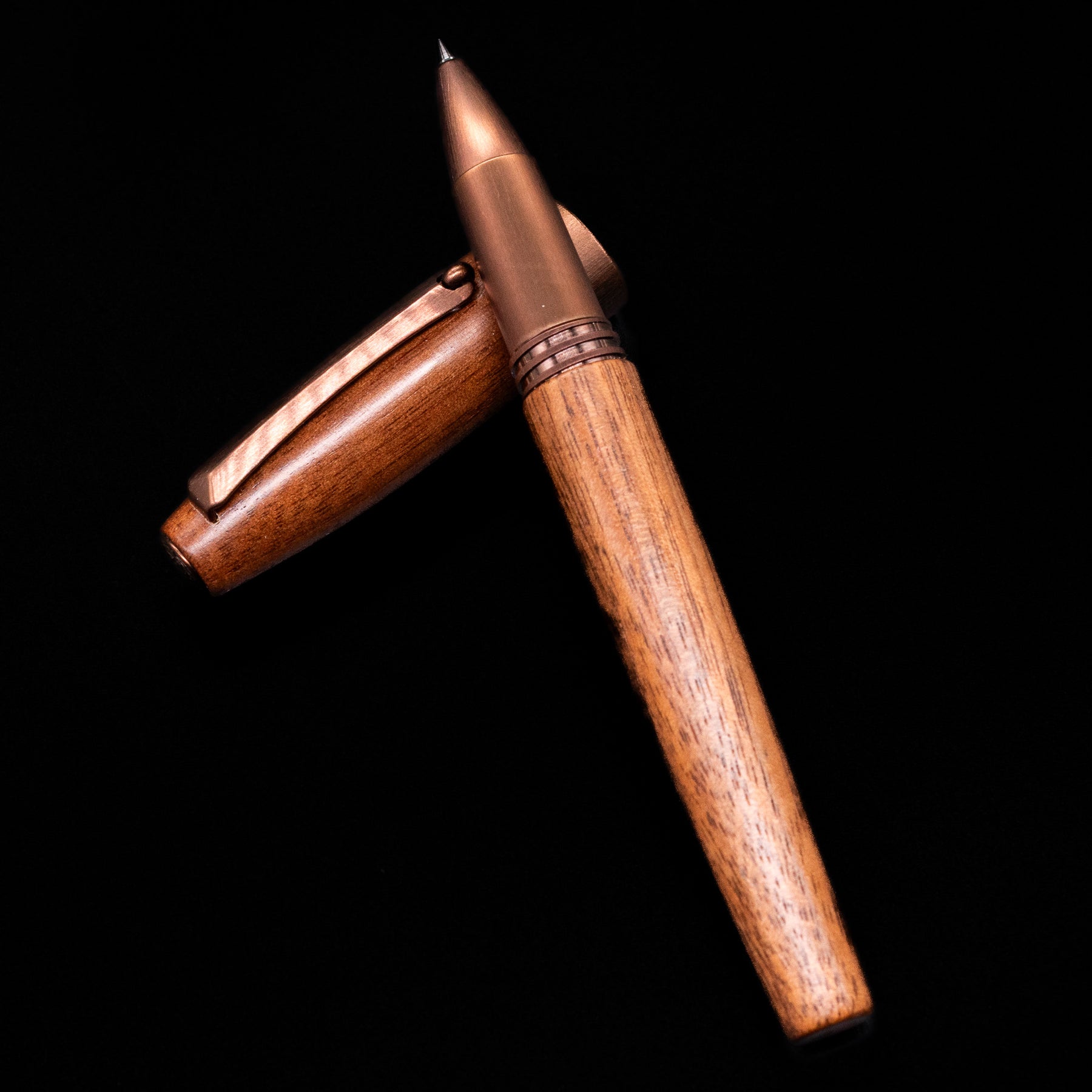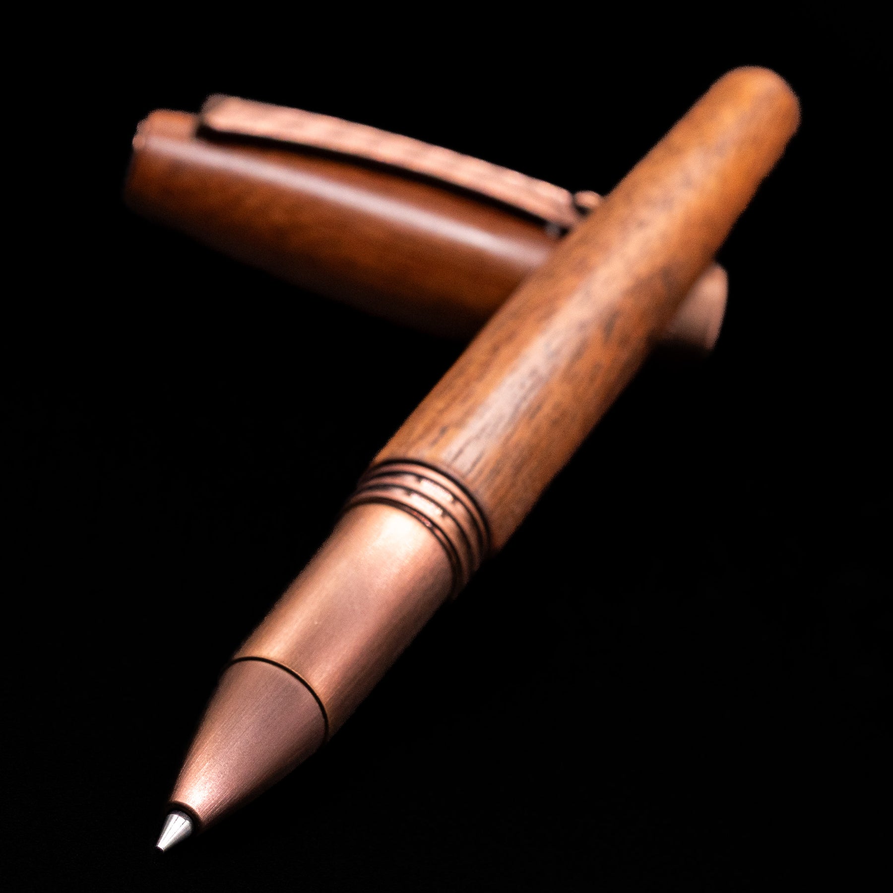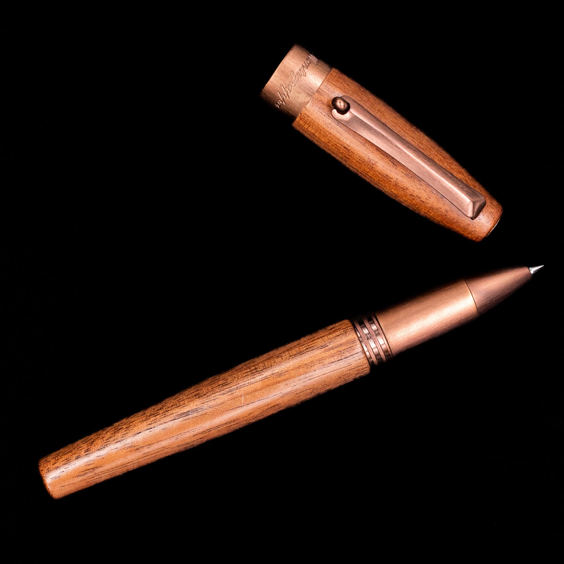 The barrel and cap are beautifully finished in heartwood, showcasing pronounced grain patterns and warm wood tones that range from deep browns to soft amber highlights. Polished metal trim and clip provide refined contrast and durable accents, elevating the organic beauty of the wood while preserving the pen’s sleek silhouette.