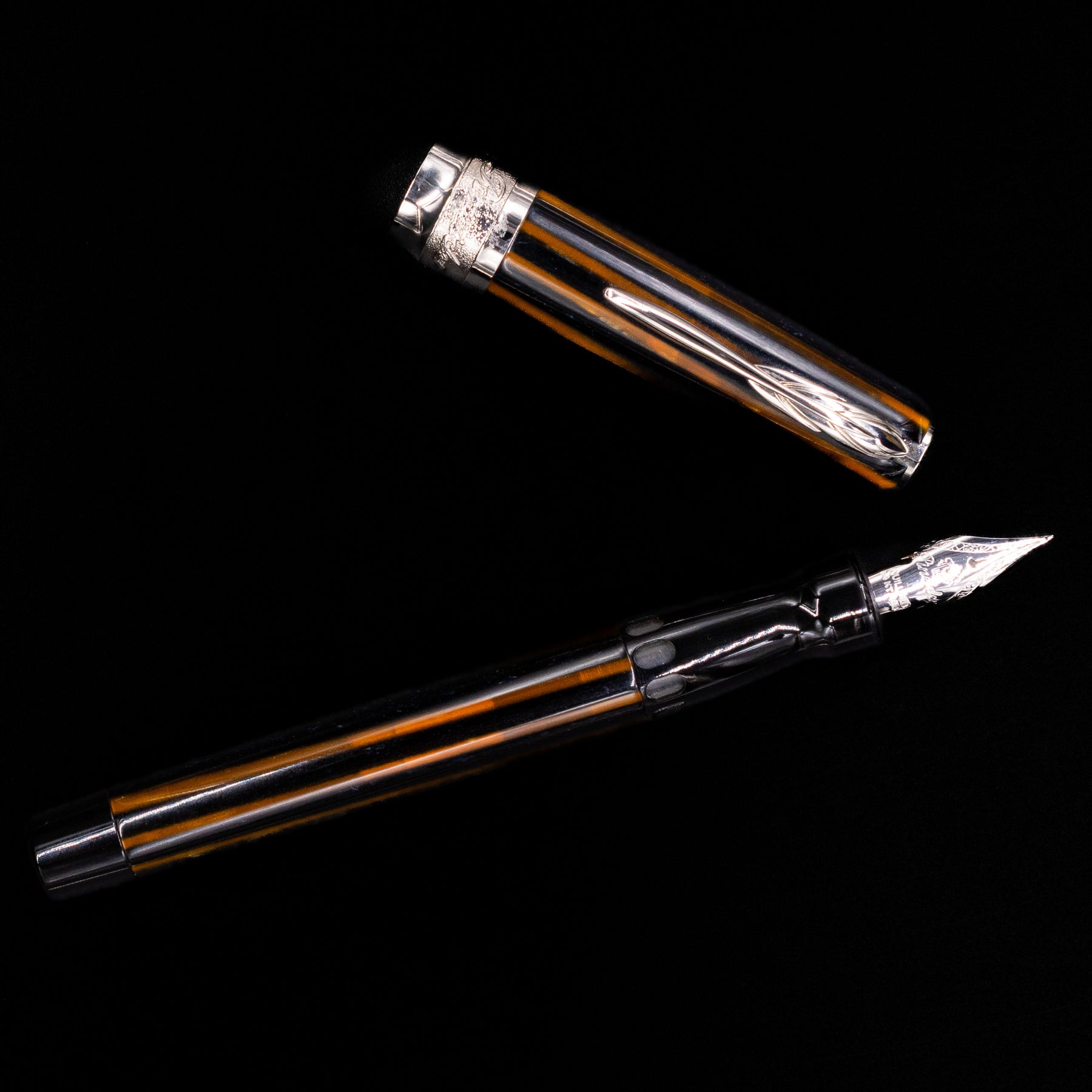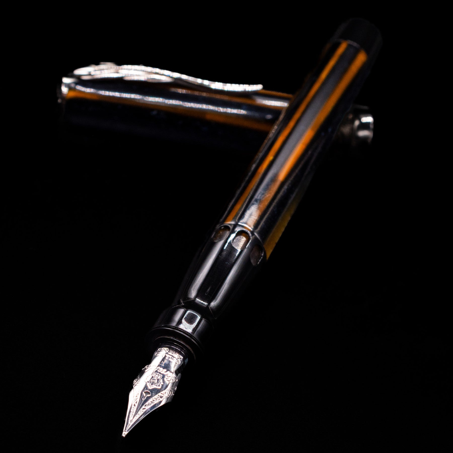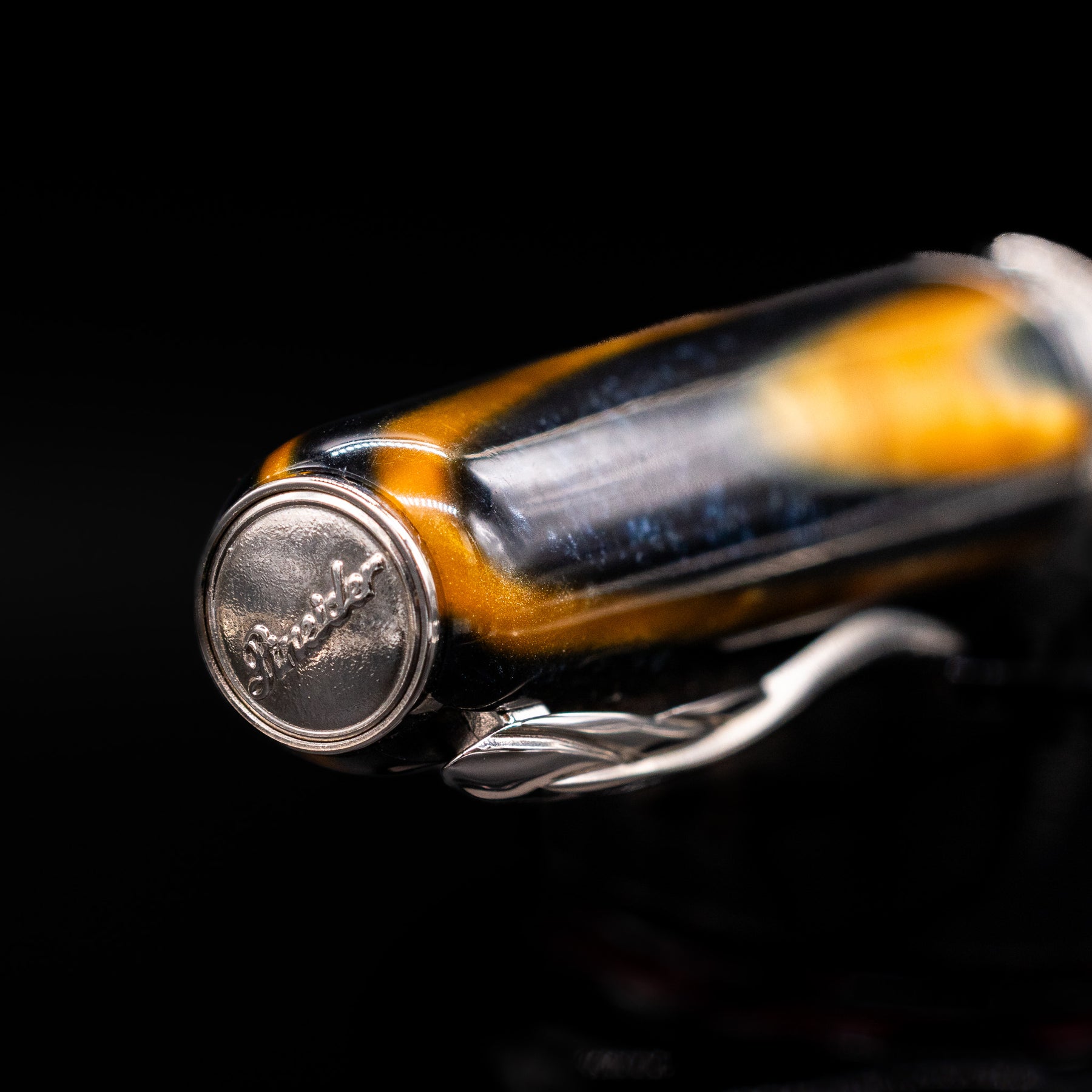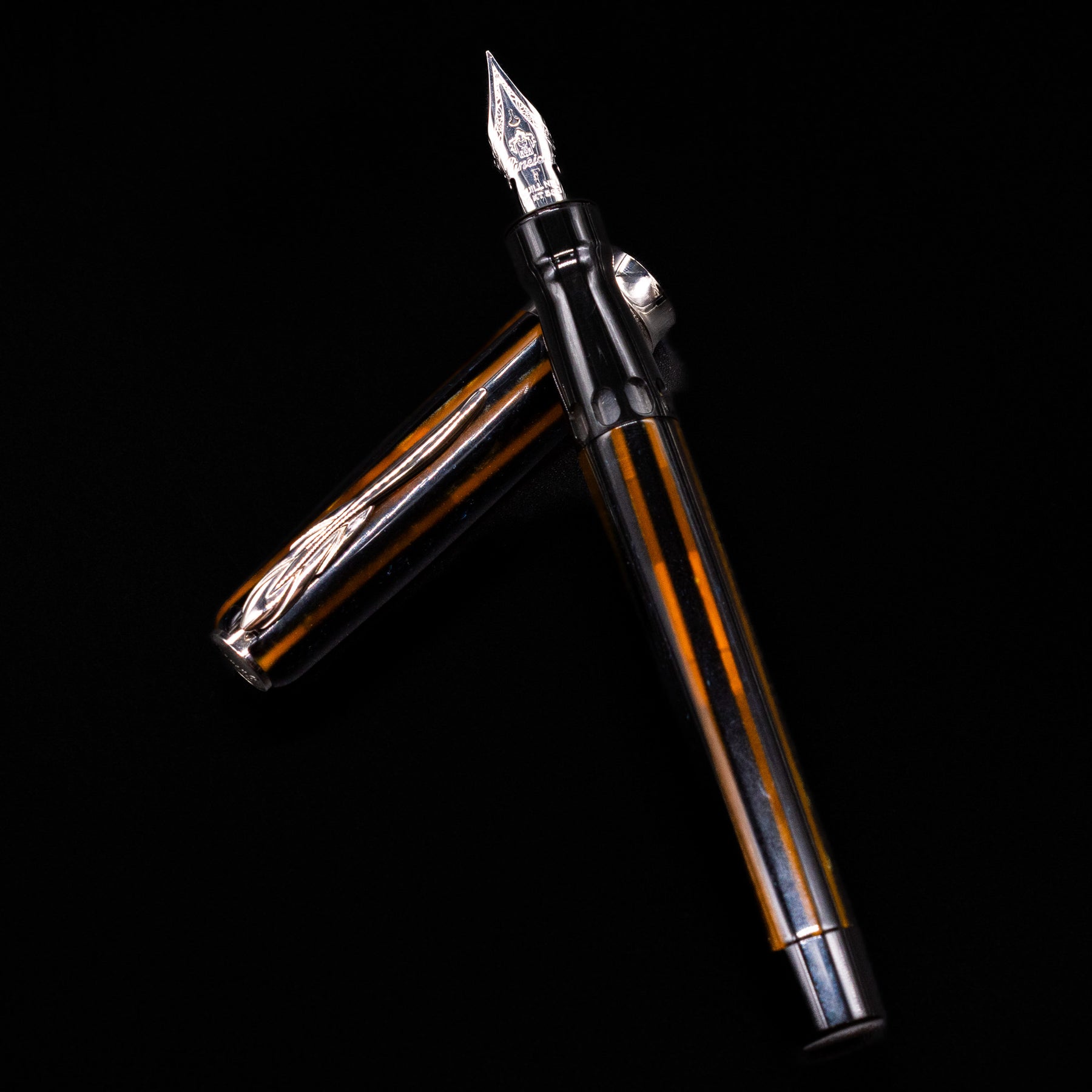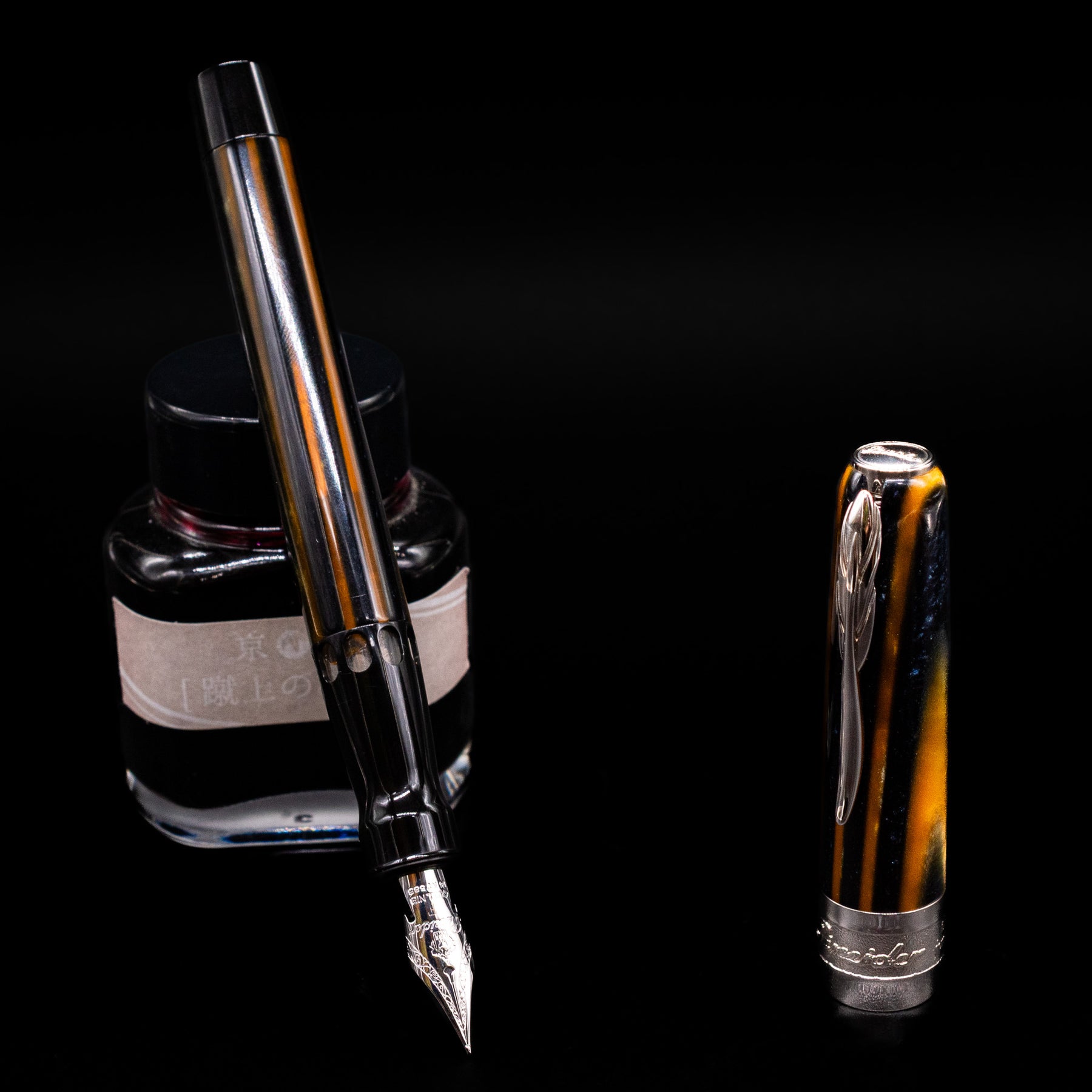 The Pineider Arco Blue Bee Fountain Pen is a vibrant expression of Italian design married with refined writing performance. Part of Pineider’s contemporary Arco series, this edition features a richly hued blue resin body accented with dynamic patterning that evokes the wings of a busy bee under bright sunlight — lively yet sophisticated. Polished rhodium trim provides cool, contrasting highlights that elevate the pen’s bold color without overpowering it.