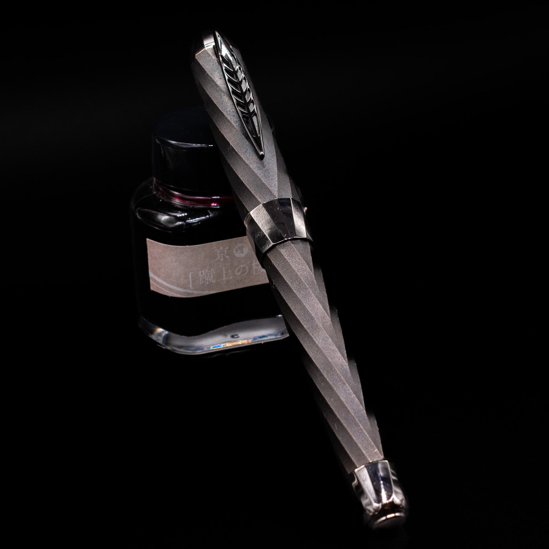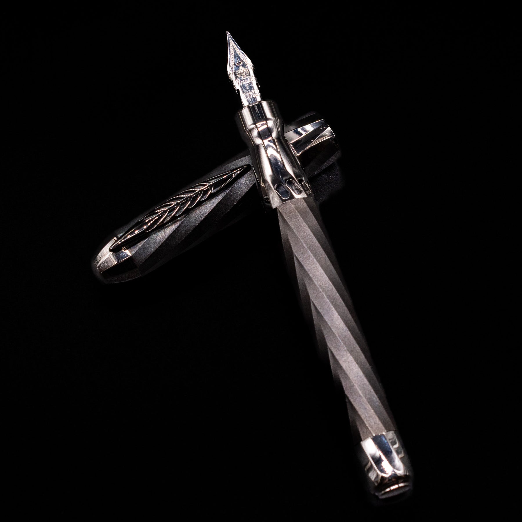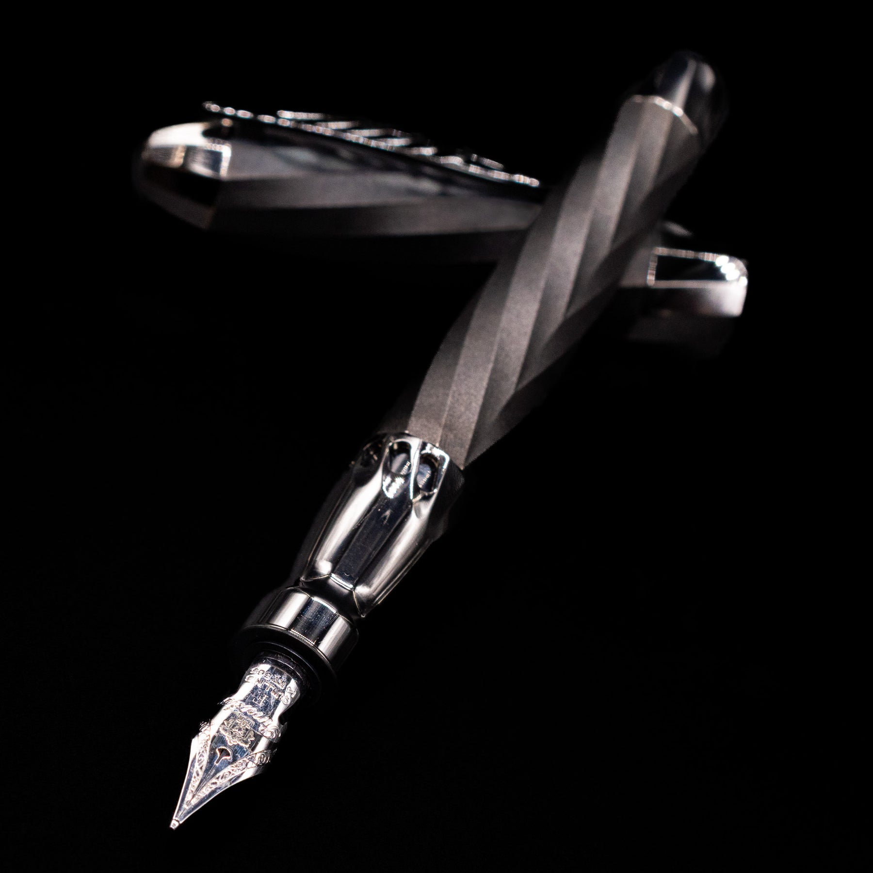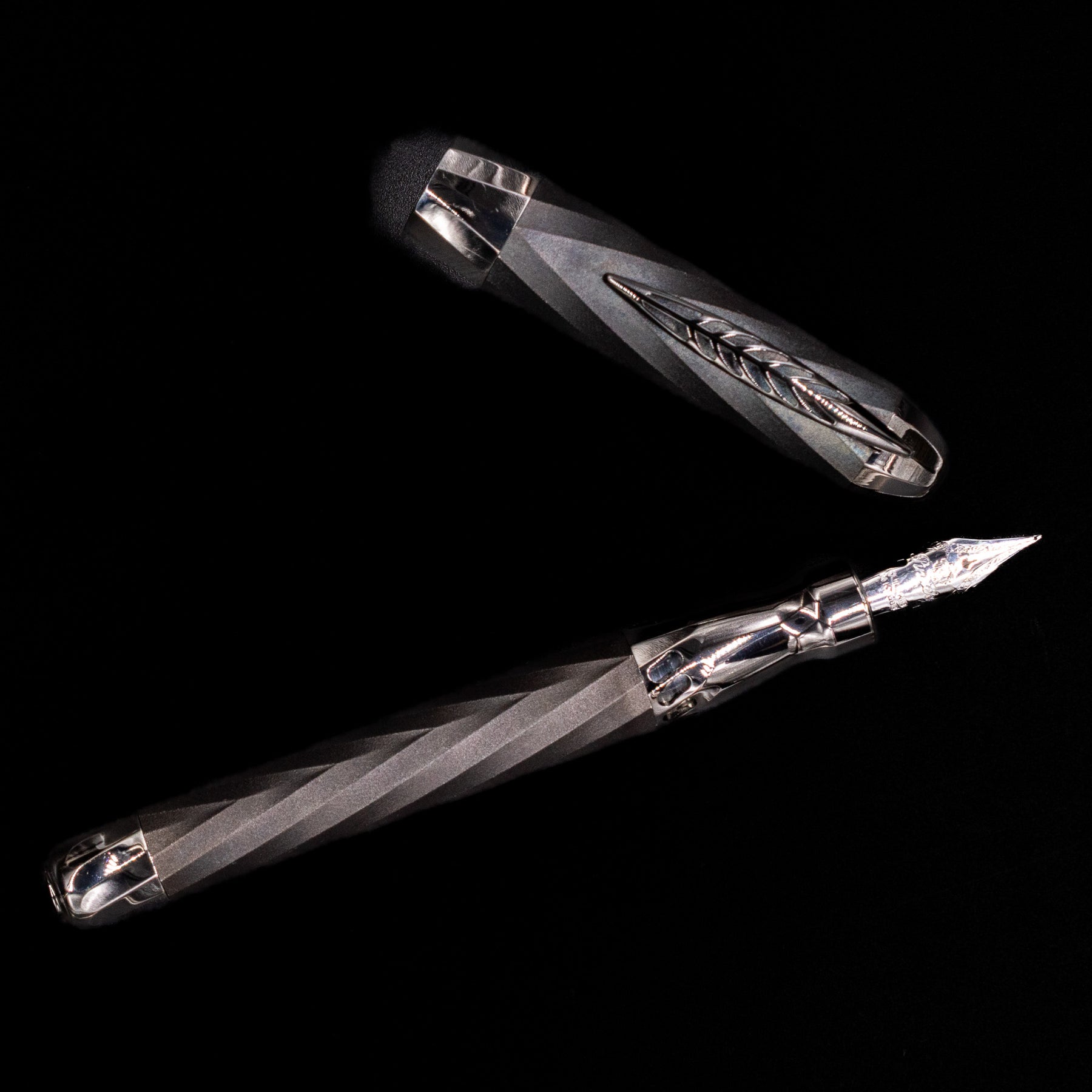 The Pineider Matrix Black is one of Pineider’s most dramatic “writing-jewelry” pieces—built with true precious-metal construction and a design language that feels engineered, architectural, and intentionally futuristic. The pen’s cap, barrel, and faceted mid-ring are crafted from solid 925 sterling silver, then finished in a deep, stealthy black ruthenium plating that alternates between satin and gloss across its geometric surfaces. In hand, it feels like a luxury object first…that also happens to write beautifully.