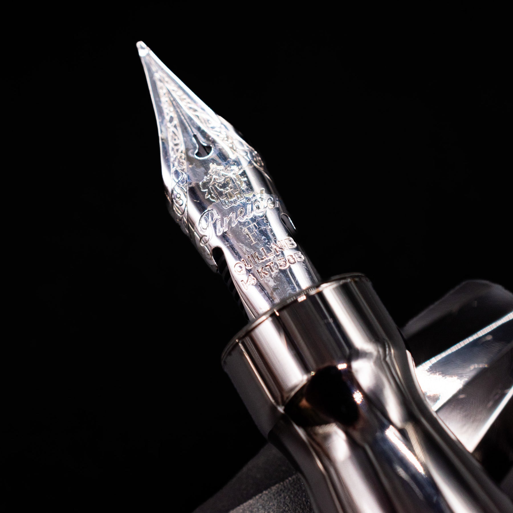 Where this pen really separates itself is the nib. The Matrix is fitted with Pineider’s 14K gold Hyperflex Quill nib—a quill-cut design engineered to provide a soft, responsive feel and real expressive potential. It’s not a “nail,” and it’s not a vintage wet noodle either; it’s a modern, controlled flex experience designed for everyday writing pleasure with the option to open up your line when you want it.