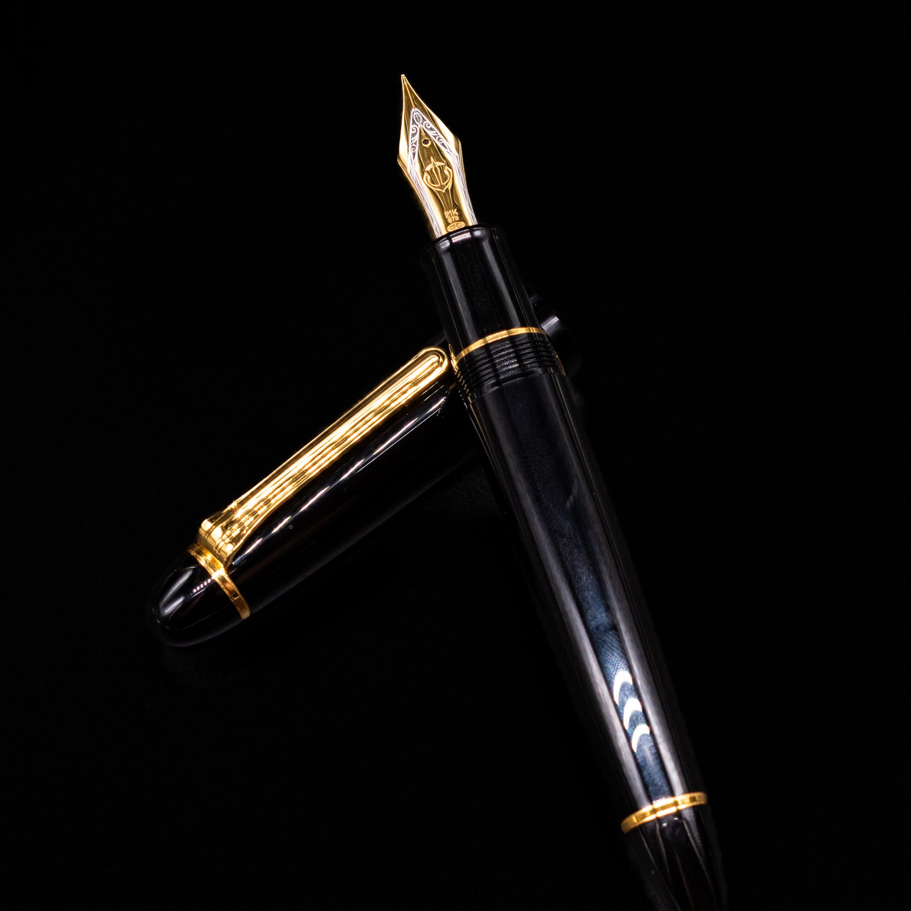 At the heart of the King of Pens is Sailor’s legendary 21K gold “King-size” nib, an oversized bicolor nib revered for its smooth glide, controlled feedback, and expressive character. This large nib is engineered to deliver Sailor’s signature writing feel — precise, consistent, and quietly luxurious — making it a standout among modern gold nib fountain pens.