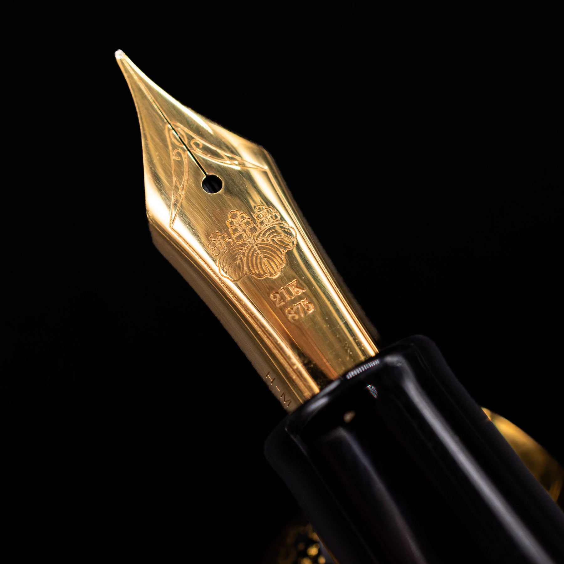 A macro shot of the nib with its intricate detailing and logo engraving for the Sailor Professional Gear Sakura Nagare Prime Minister Fountain Pen - Preowned.