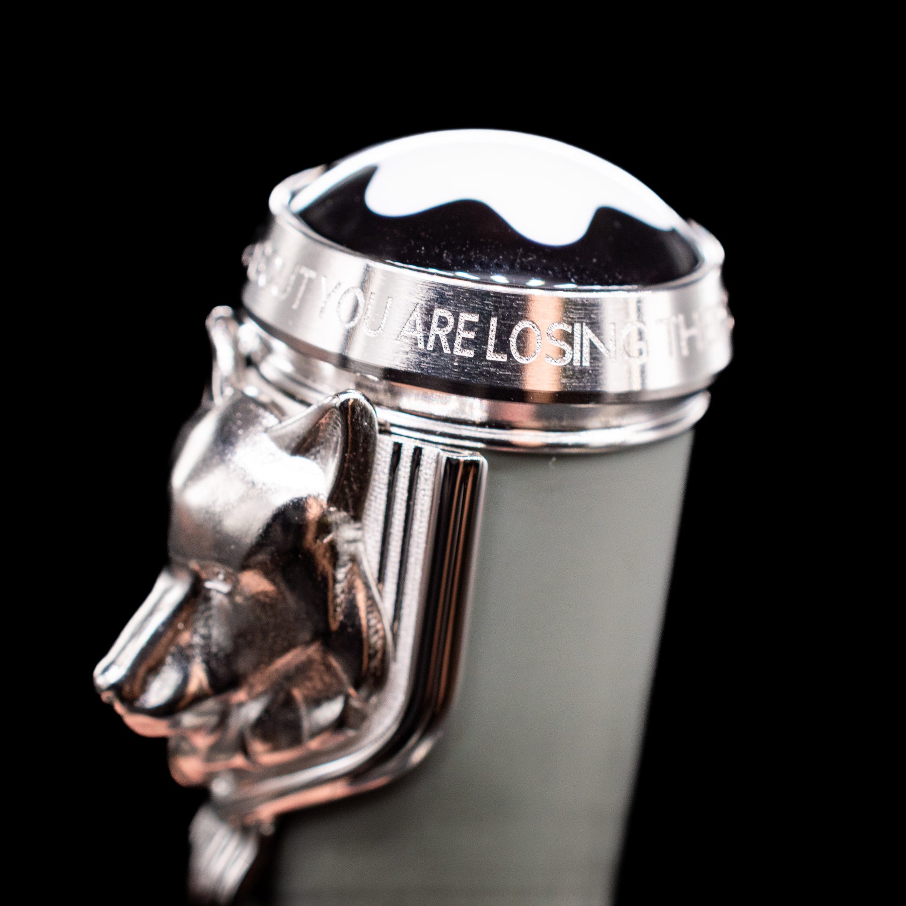 A macro shot of the wolf on the clip and the word saying on top of the cap on the Montblanc Writer&