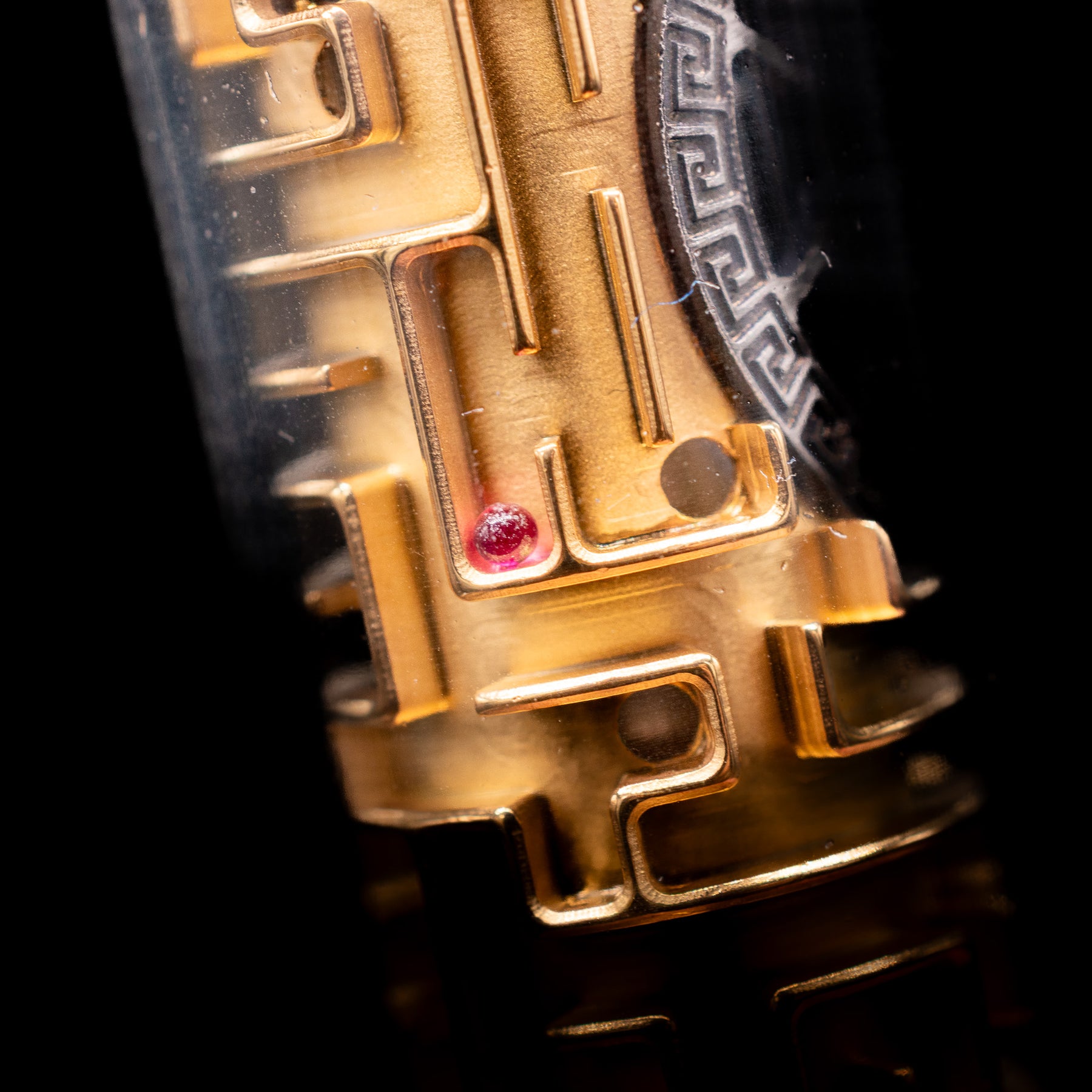 The aged-palladium trim, gold-plated clip, and enameled red accents on the cap echo the ruby motif, while elegant detailing in the rings and section brings balance and harmony to the piece. The twist-on cap features red enamel engraving that matches the labyrinth’s ruby tone.