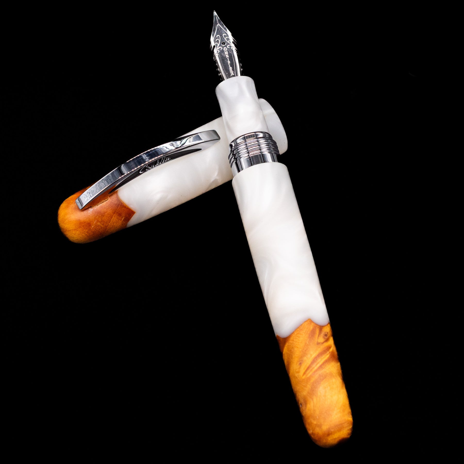Blending heritage craftsmanship with modern innovation, the Spectra Fusion White is a limited-edition fountain pen that elevates everyday writing into an art form. Its body is crafted from stabilized maple burl fused with luminous white epoxy resin — the result is a richly layered finish with depth, translucency, and unique “snow-white” luminosity that interacts beautifully with the natural warmth of the wood. No two pens are exactly alike, making each piece a one-of-a-kind statement.