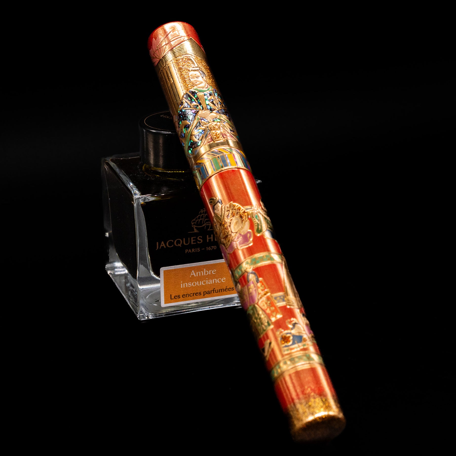 The result is a fountain pen that functions as both instrument and heirloom — an embodiment of cultural symbolism, artisanal mastery, and narrative artistry rendered in urushi lacquer.