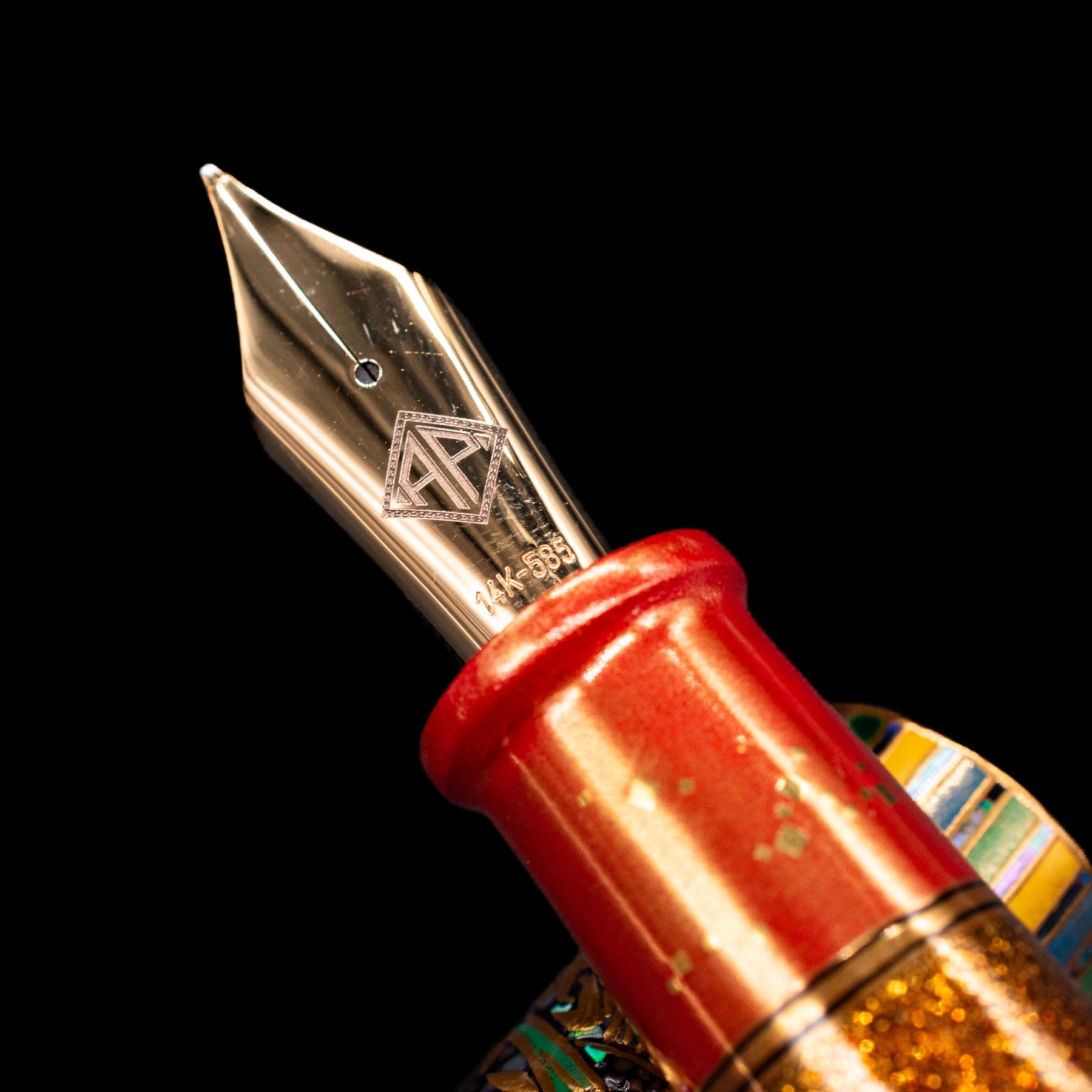 It is fitted with a large 14K gold nib, tuned for refined performance. The filling system — either eyedropper or AP’s proprietary bulk piston — offers generous ink capacity to match the pen’s scale and stature.