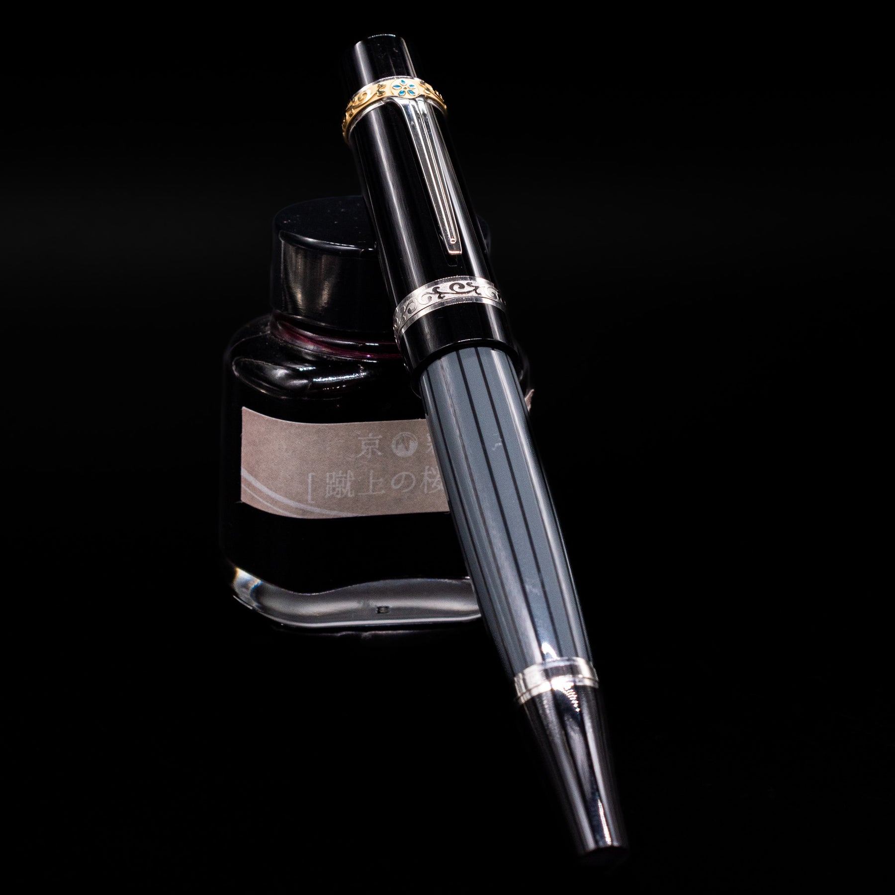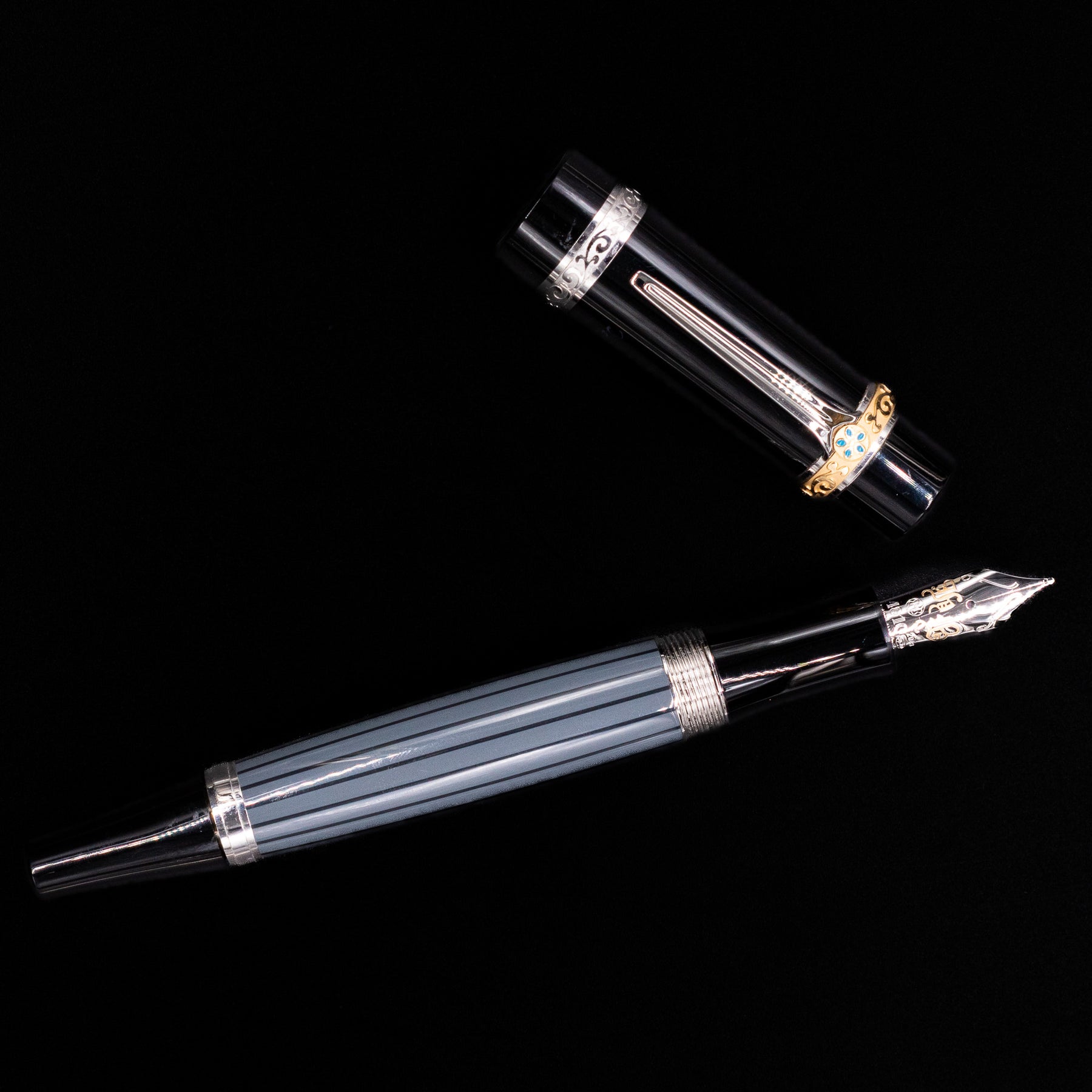 Inspired by the style of Parisian gentlemen of Balzac’s time, the pen’s silhouette echoes the cut of a classic tailcoat: broad at the top and narrowing toward the writing end. The precious black resin barrel contrasts beautifully with the gray lacquer cap and platinum-coated fittings, representing both sophistication and restraint. A gold-plated clip, shaped like a walking cane, recalls Balzac’s flamboyant personality and elegant Parisian fashion.