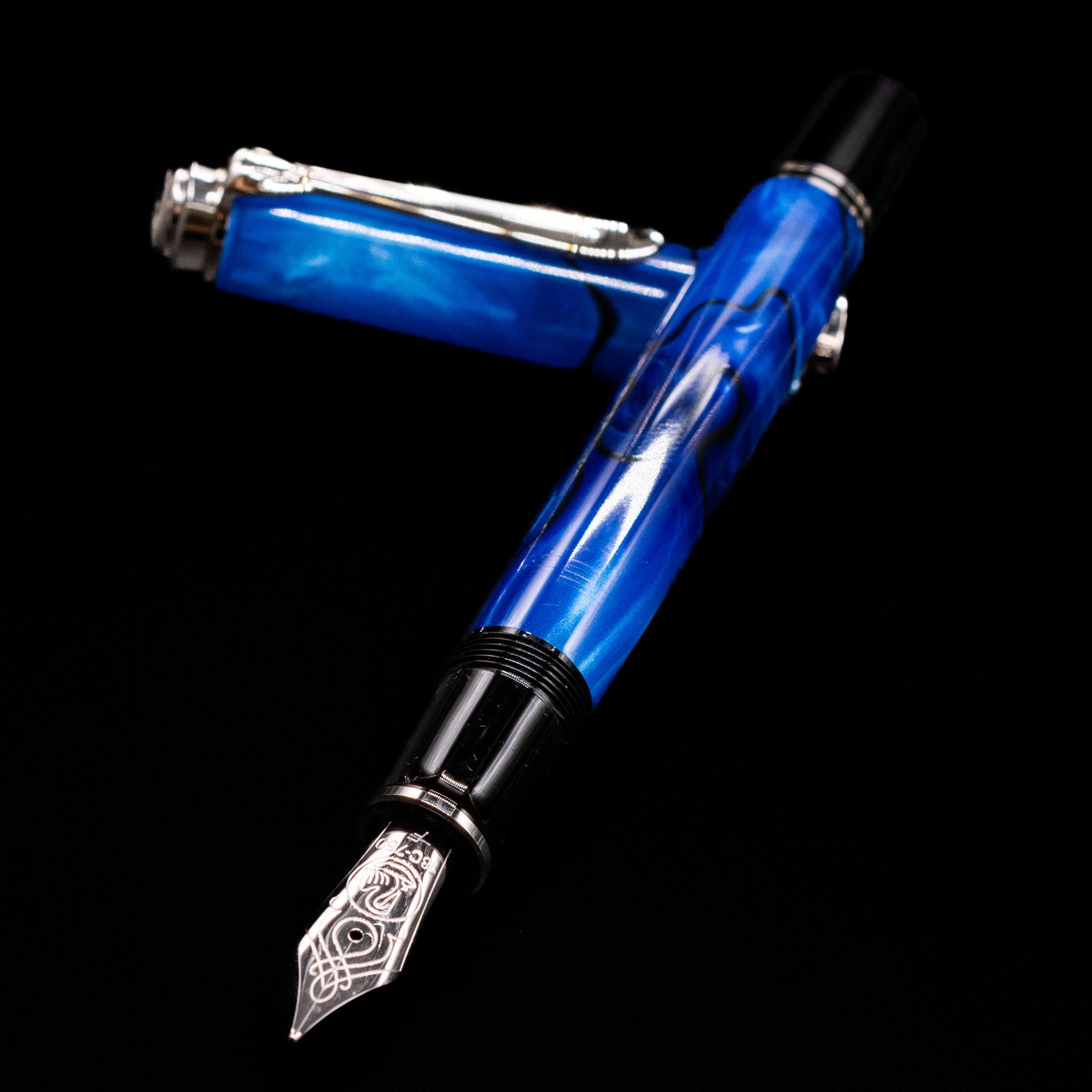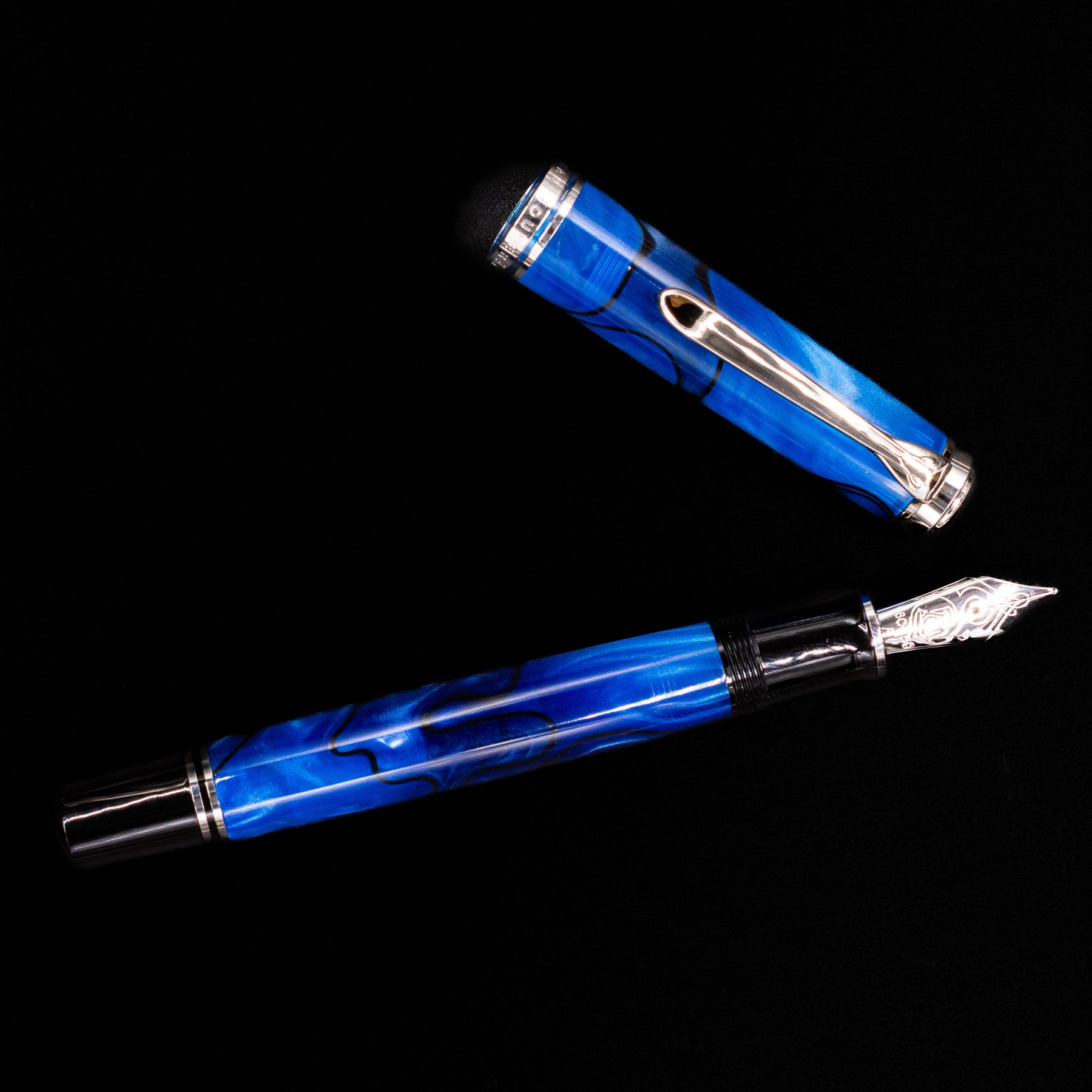 The Pelikan Souverän M805 Blue Dunes Fountain Pen is a stunning writing instrument that combines exceptional craftsmanship with a visually captivating design. The pen features a deep blue resin body with swirling patterns of light and dark, reminiscent of rolling sand dunes under a twilight sky. This mesmerizing finish is complemented by rhodium-plated trim, adding a touch of elegance and sophistication.