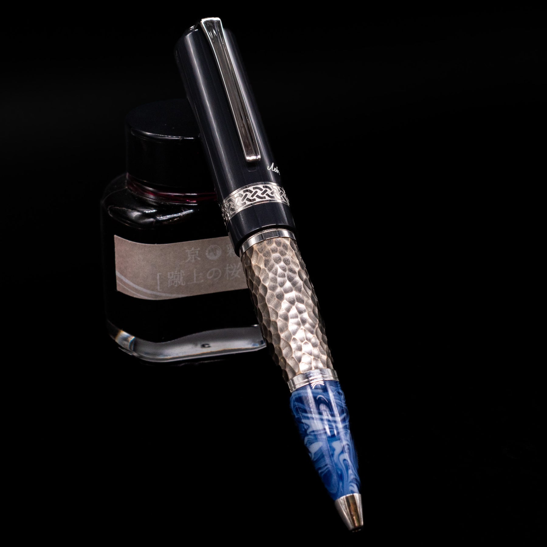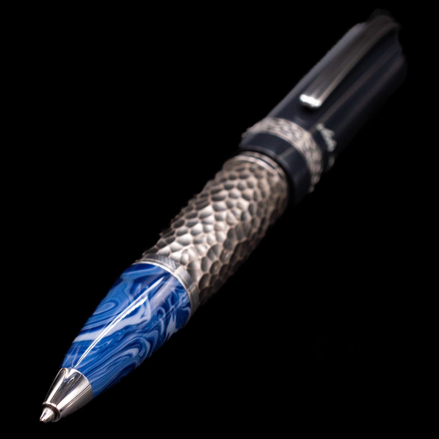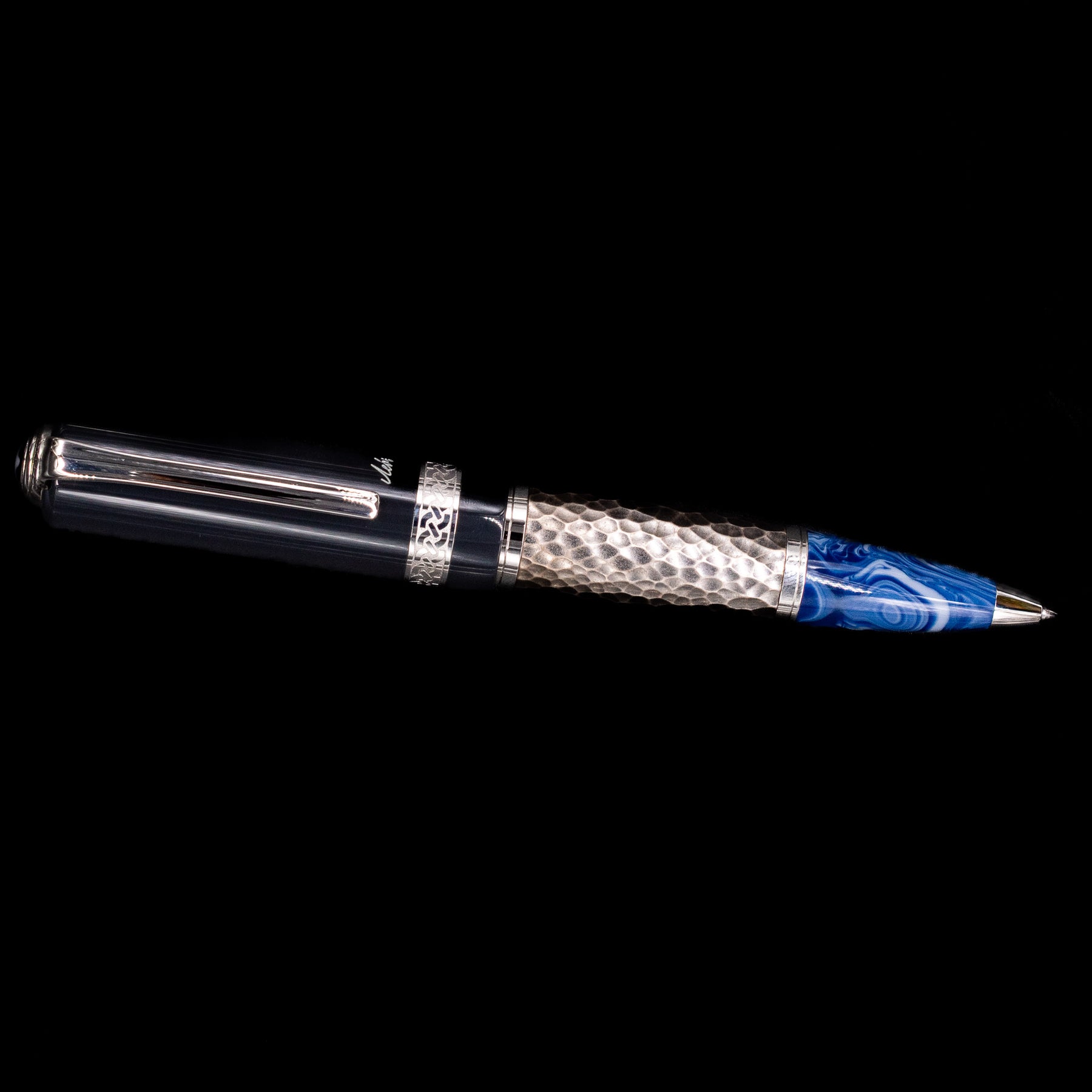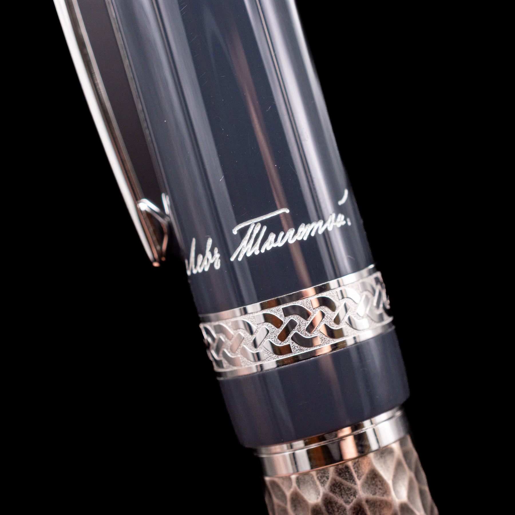 The Montblanc Writer's Edition Leo Tolstoy Ballpoint Pen is a collector's item celebrating the legendary Russian author. This elegant pen features a deep grey cap, and a hammered sterling silver barrel, symbolizing Tolstoy's connection to nature and his literary works. The pen is adorned with intricate details throughout.