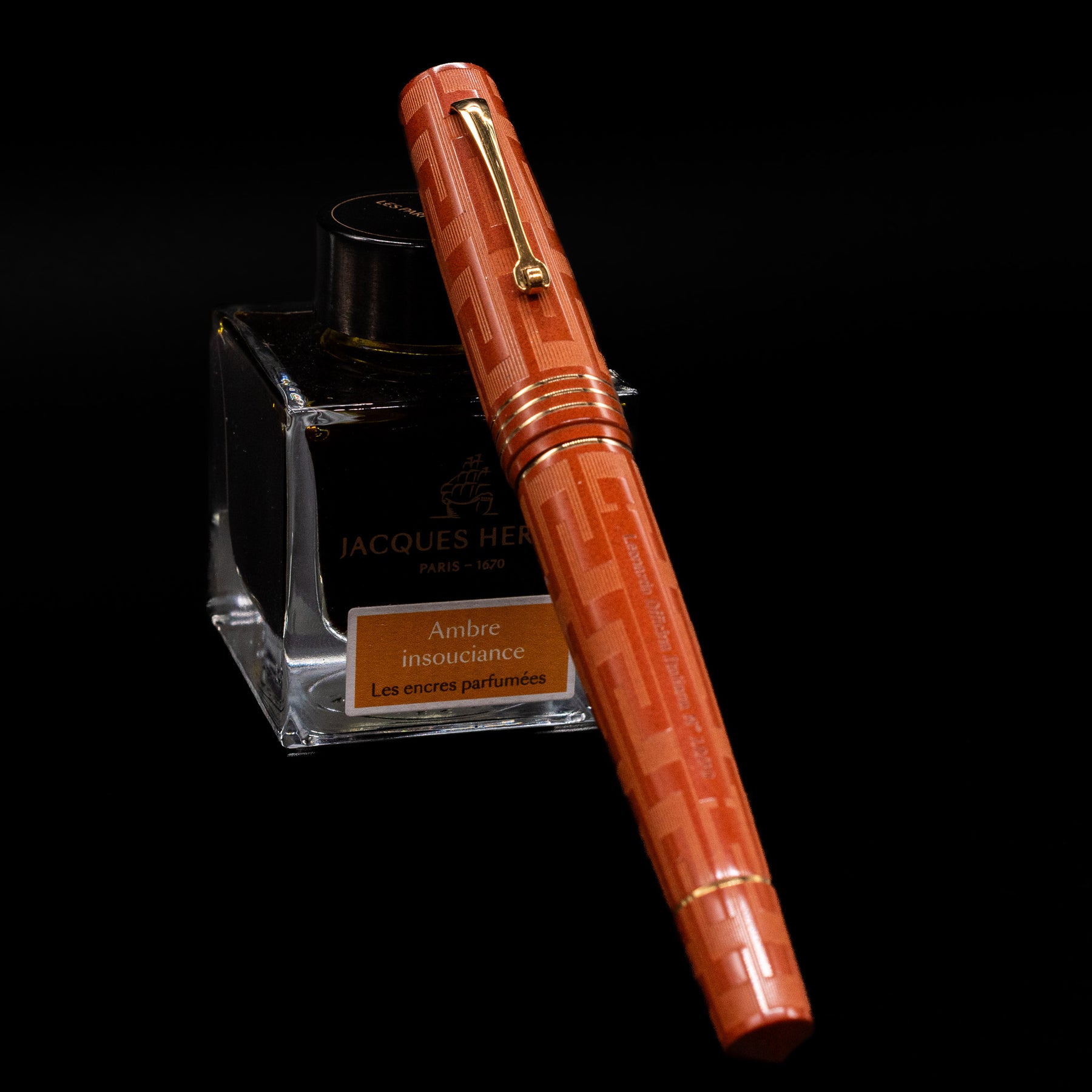 Orange fountain pen with gold accents next to a Jacques Herbin ink bottle on a black background