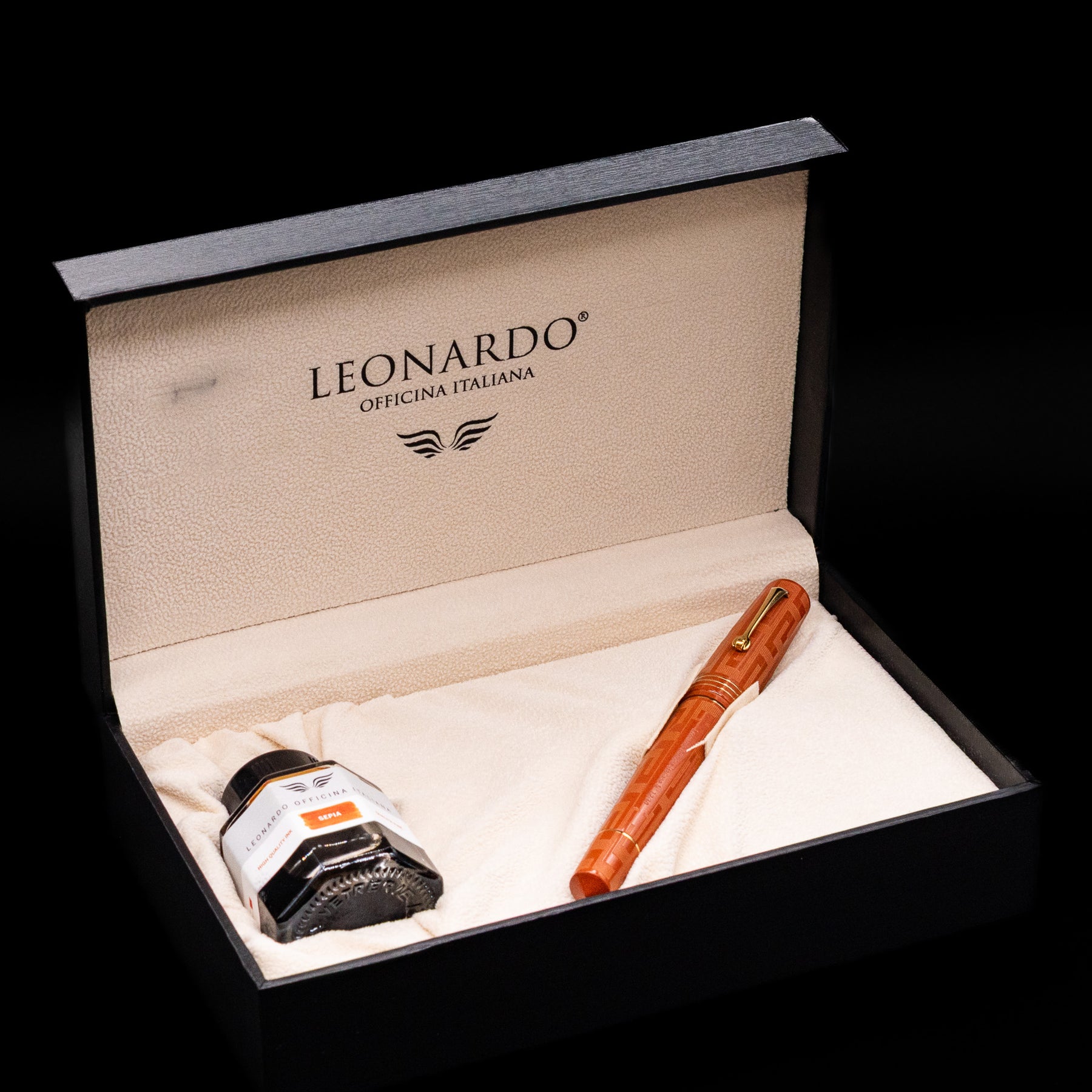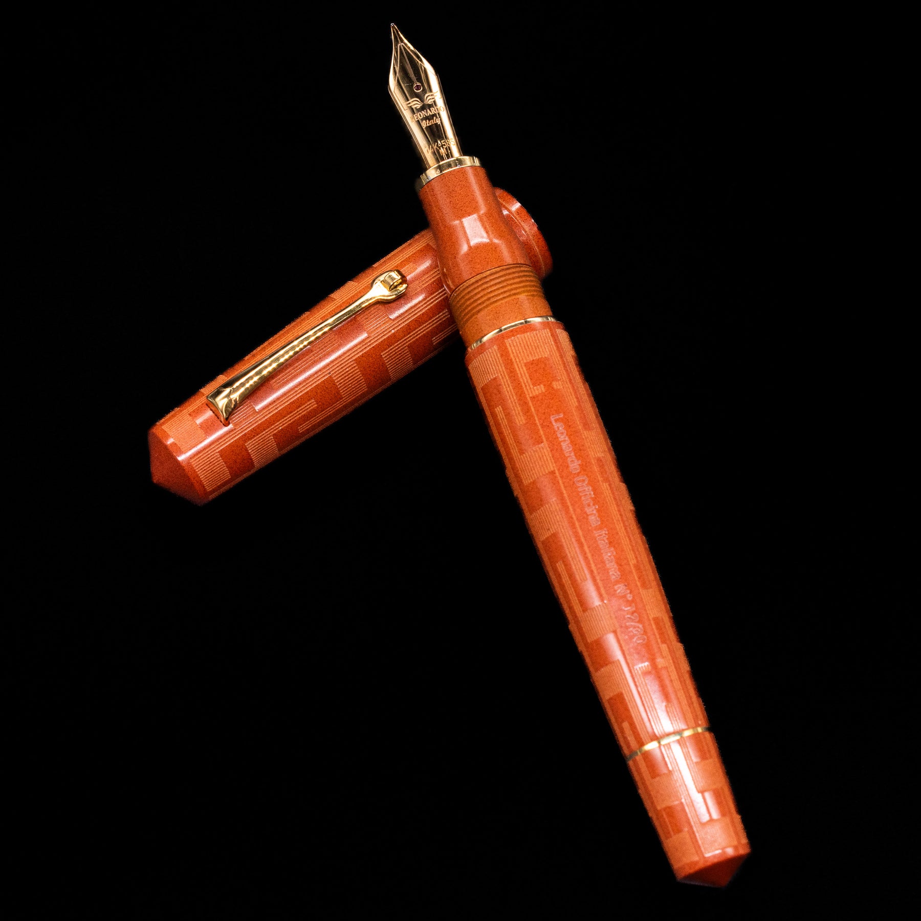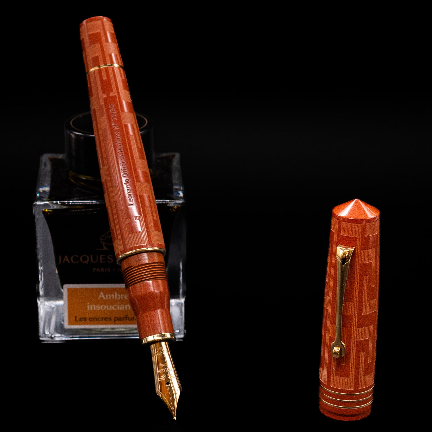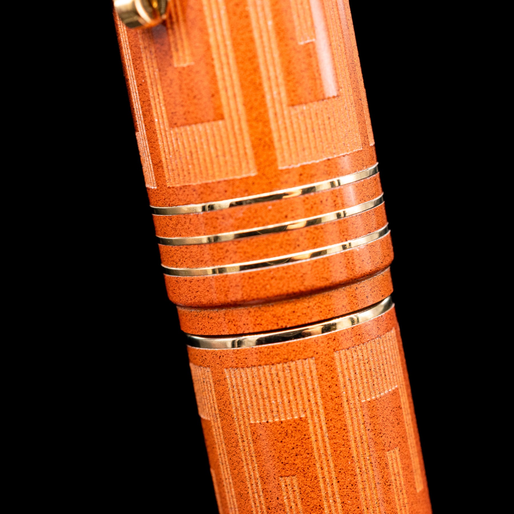 The Leonardo Momento Zero Grande Art Deco is a bold and beautifully crafted homage to early 20th-century design. This striking edition features a dramatic orange geometric ebonite body inspired by the rhythmic patterns, symmetry, and glamour of the Art Deco period. The hand-turned Italian resin showcases crisp contrasts and clean lines, making every pen visually captivating and truly one of a kind.