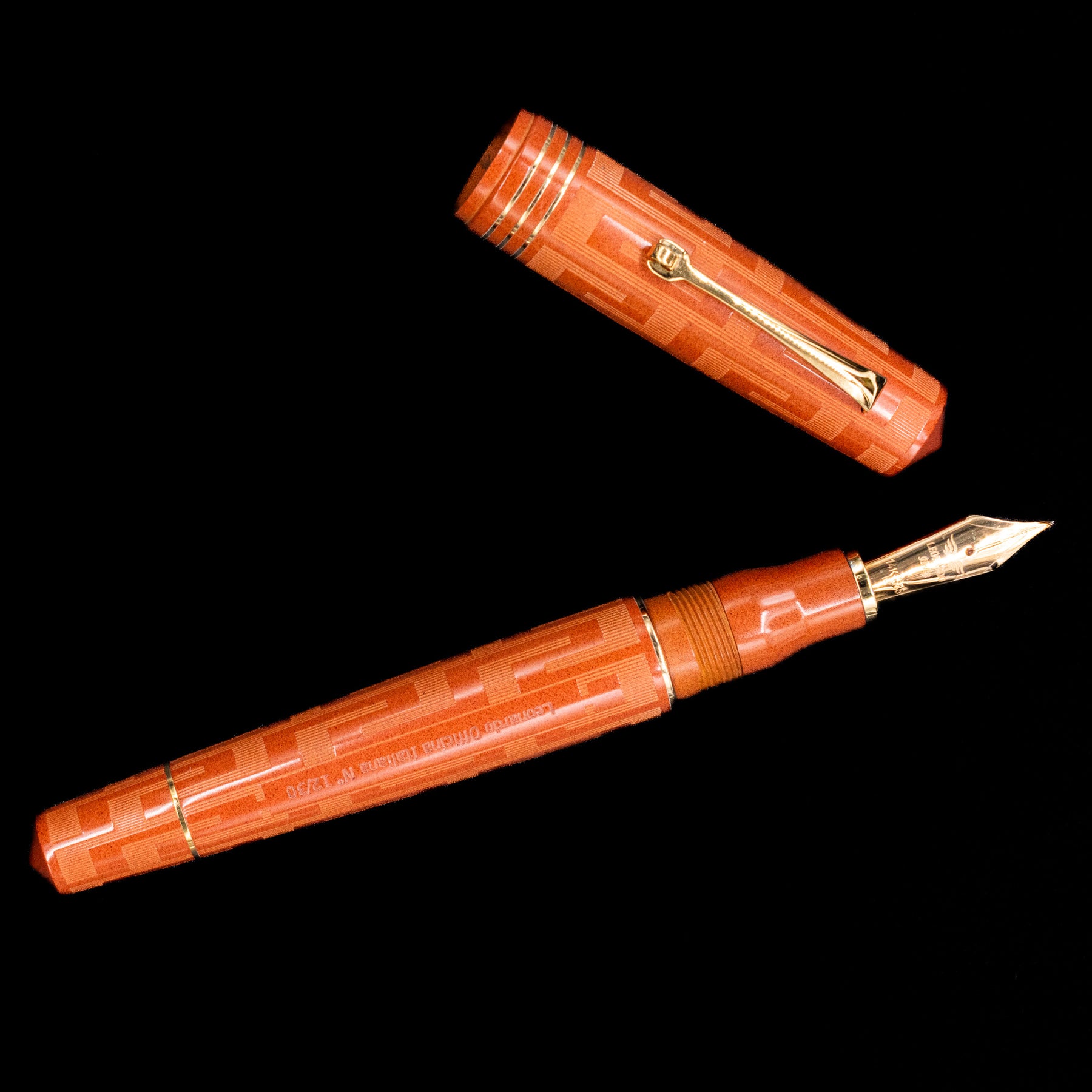 • Striking Art Deco–inspired orange ebonite with geometric resin — bold, architectural design