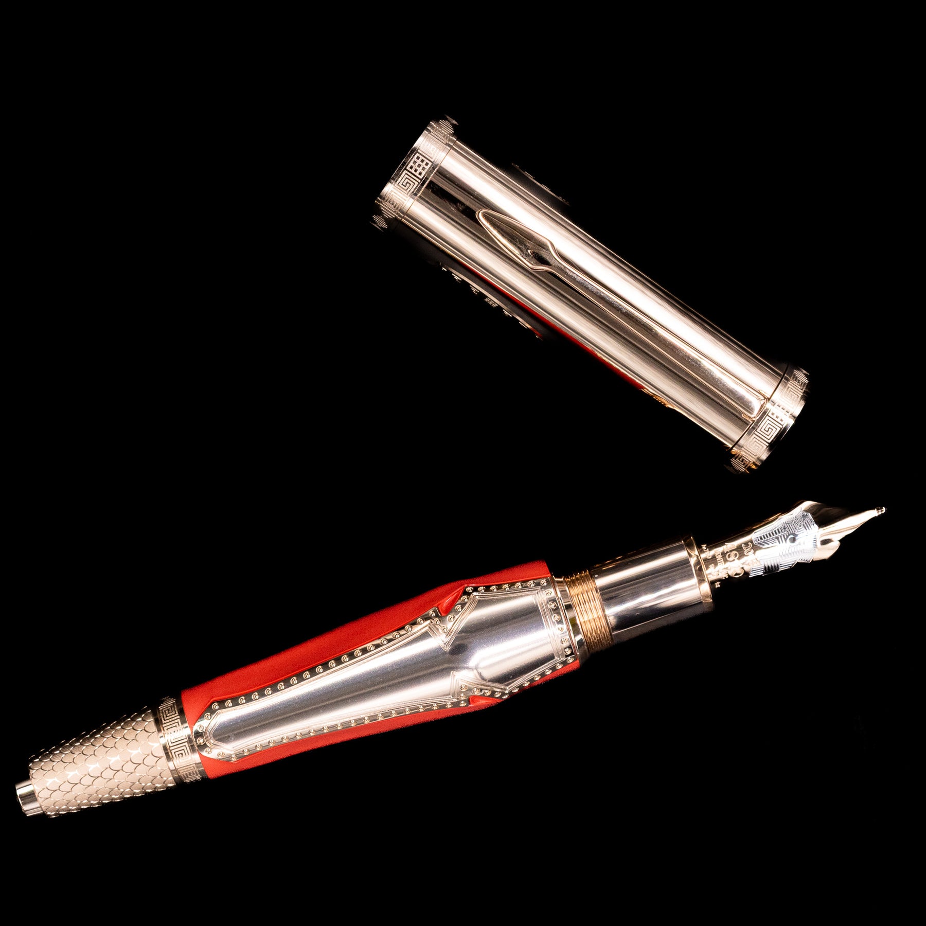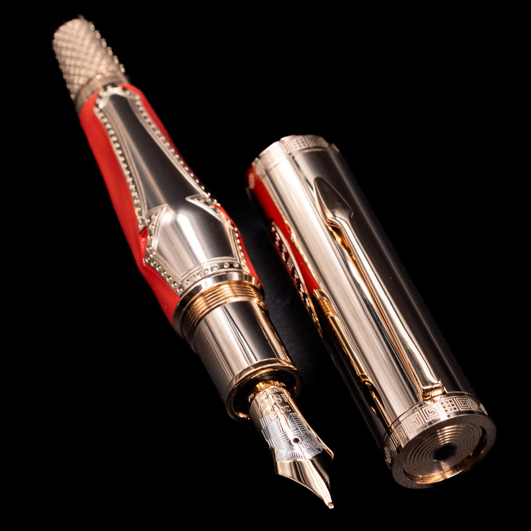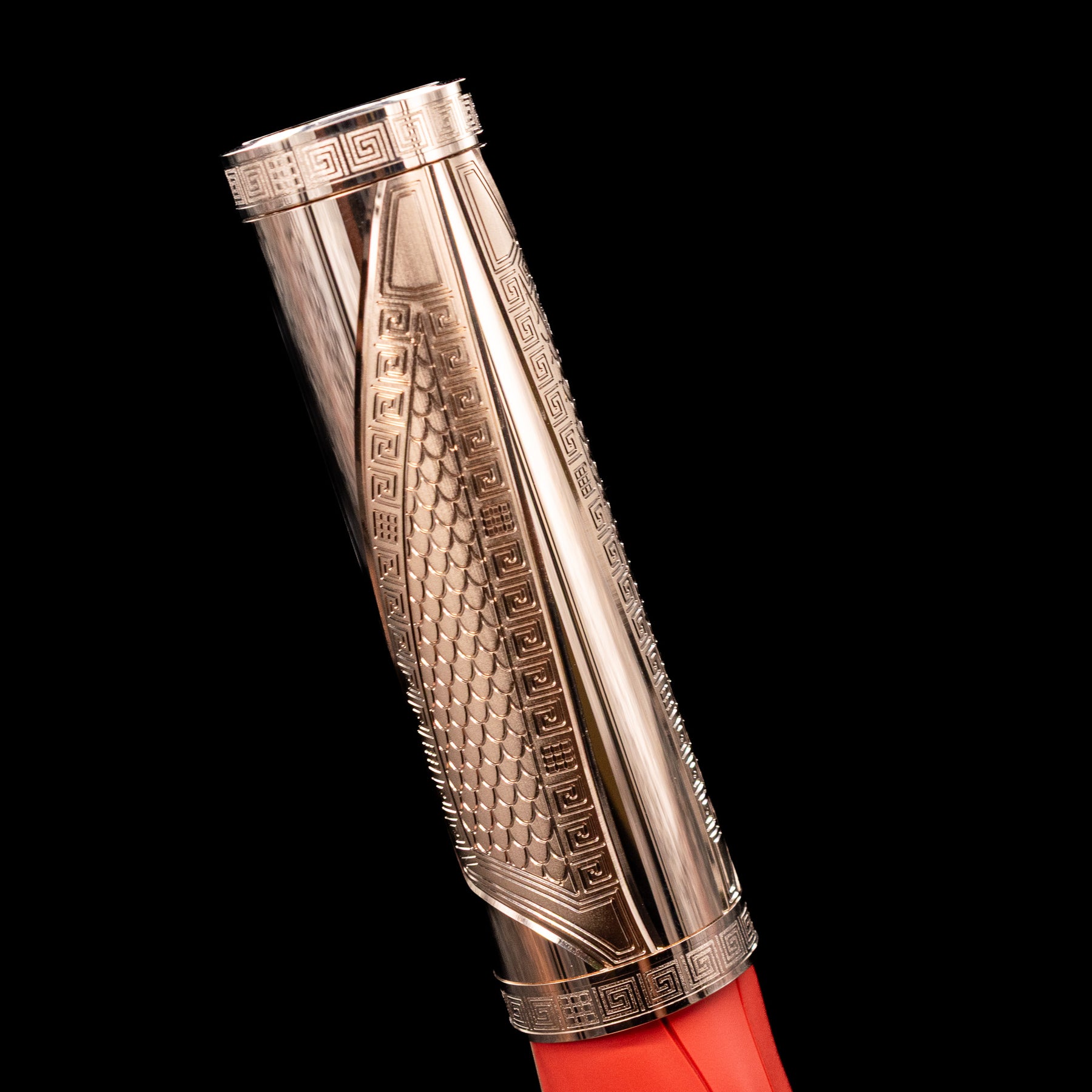 This Writer's Edition takes its main inspiration from the story of the Trojan Horse. The overall shape is inspired by the horse, with the back and the clip reflecting the spear. The engraving on the cone and rings borrows motifs from traditional Greek black-figured pottery. The coral color of the barrel also takes inspiration from pottery, while the engraved pattern on the cap is inspired by the armor of Achilles - the central figure of the Iliad.