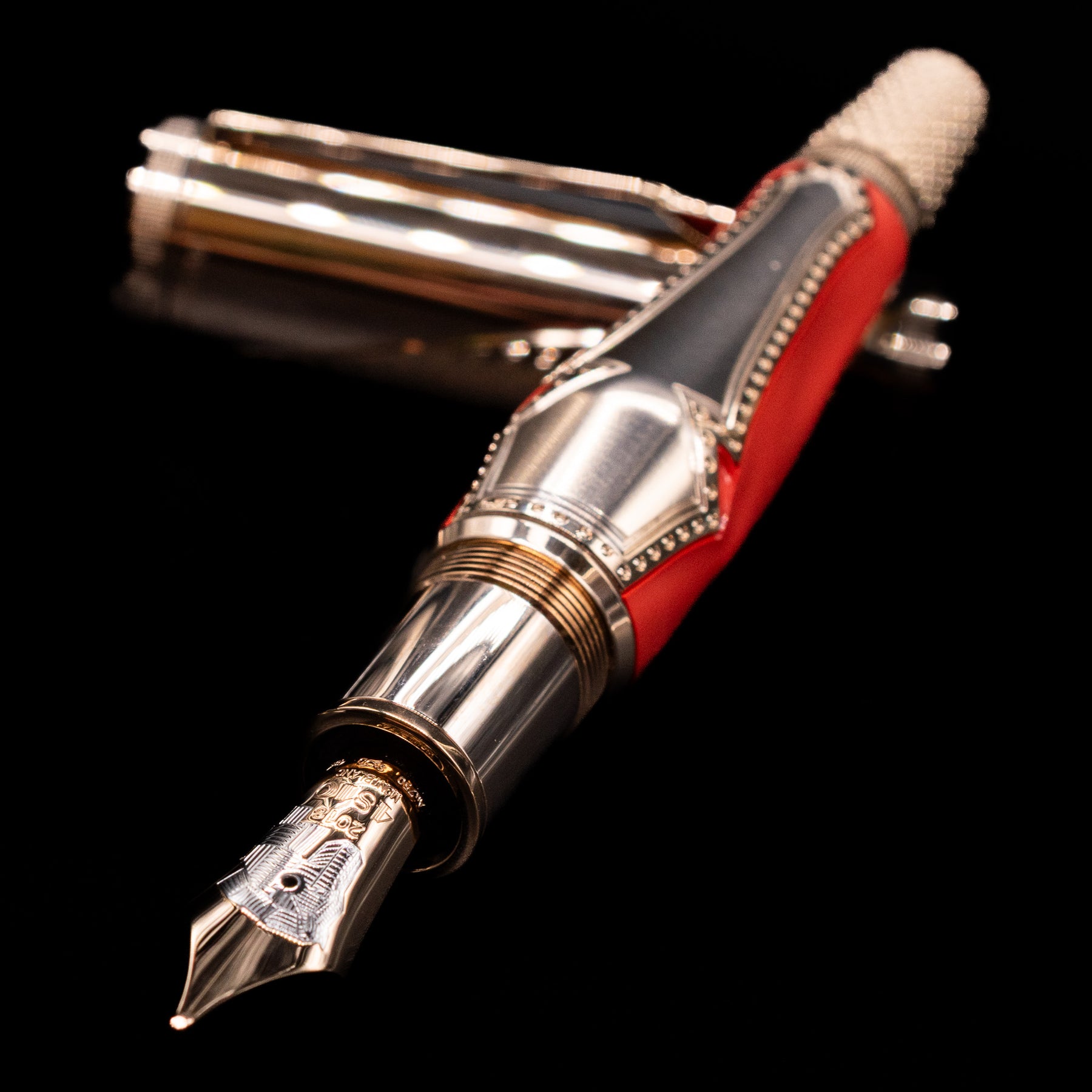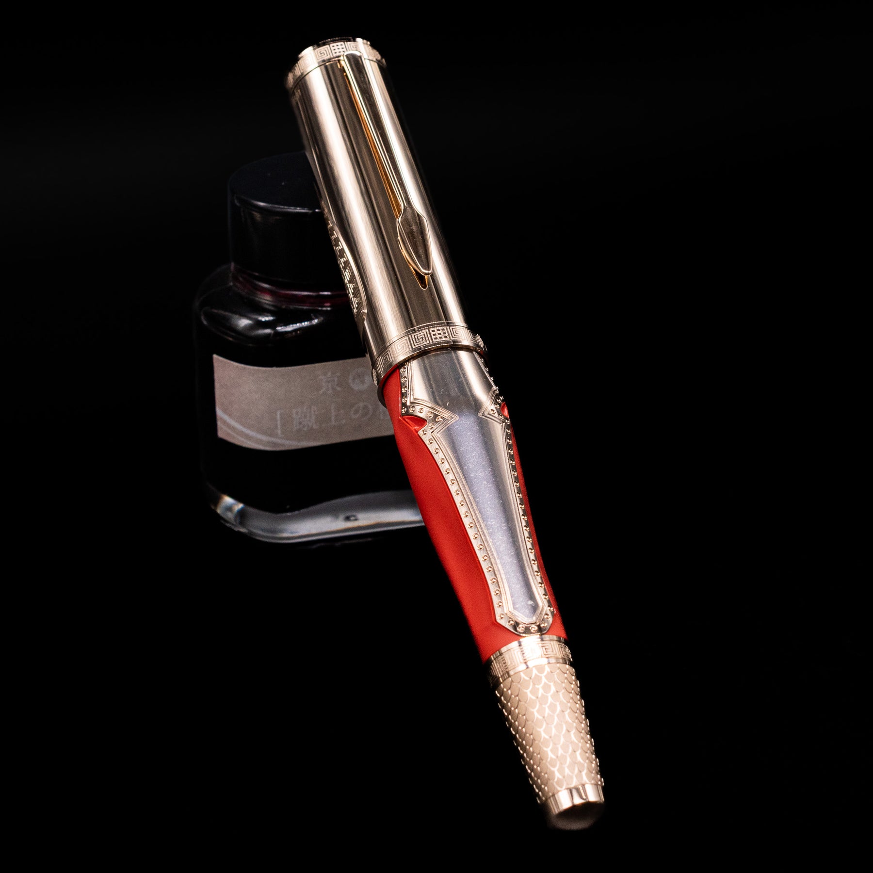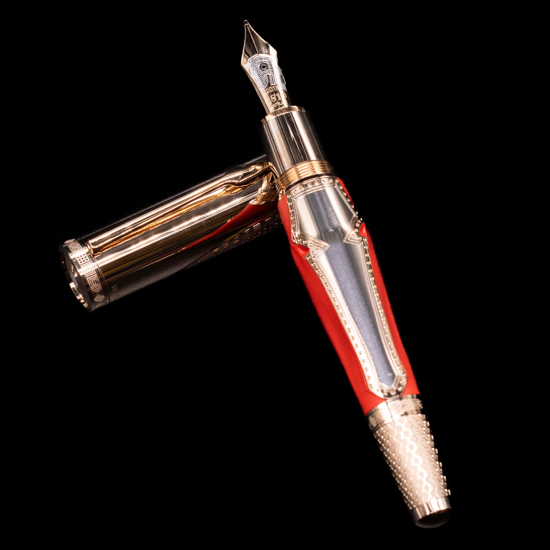 This Writer's Edition takes its main inspiration from the story of the Trojan Horse. The overall shape is inspired by the horse, with the back and the clip reflecting the spear. The engraving on the cone and rings borrows motifs from traditional Greek black-figured pottery. The coral color of the barrel also takes inspiration from pottery, while the engraved pattern on the cap is inspired by the armor of Achilles - the central figure of the Iliad.