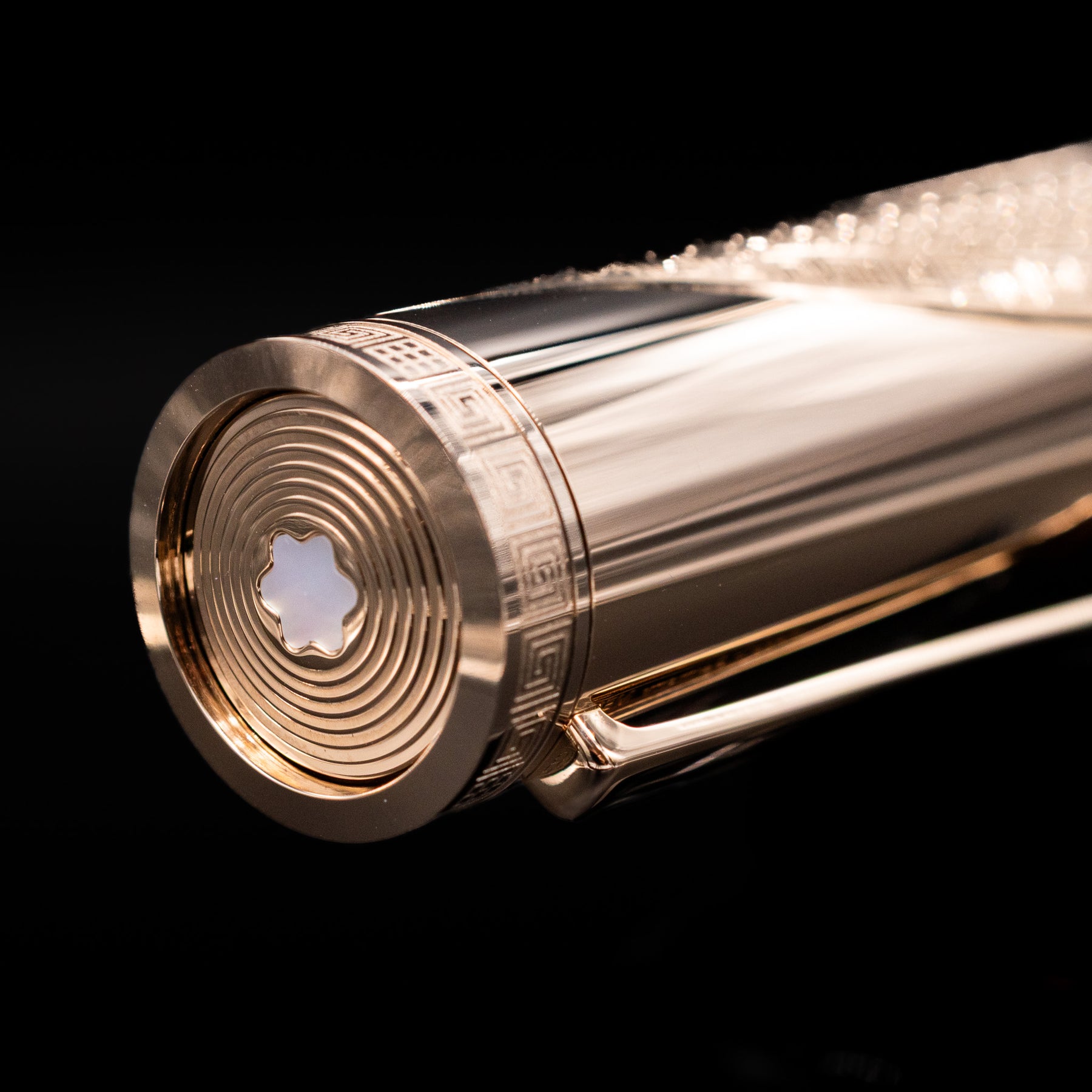The Trojan Horse, Odysseus' famous stratagem, is reflected in the edition's remarkable silhouette and engravings. A stylized Montblanc Au 750 champagne-tone gold coated head of a horse is set on the 149 sized nib (same size as Montblanc Hemingway and Dumas). The finely engraved Greek meander frieze on the Au 750 champagne-tone gold coated fittings of the Writers Edition Homage to Iliad 1581 is inspired by the six-foot structure of the hexameter. The edition is crowned by the Montblanc emblem in mother-of-pearl. This edition is limited to 1581 pieces worldwide in honour to the first translation of ten books of the Iliad into english language in 1581.