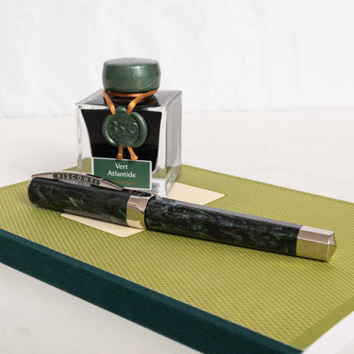 Experience the rebirth of the legendary Visconti Opera Master, now in a captivating collaboration with Jonathon Brooks, aptly named Stargazer. This fountain pen is a testament to exquisite craftsmanship, featuring a mesmerizing blend of blue and vibrant green swirls on both body and cap. The iconic Ponte Vecchio bridge clip, adorned with sparkling teal enamel, elegantly showcases the Visconti brand. Palladium trim accents further enhance the pen's allure.