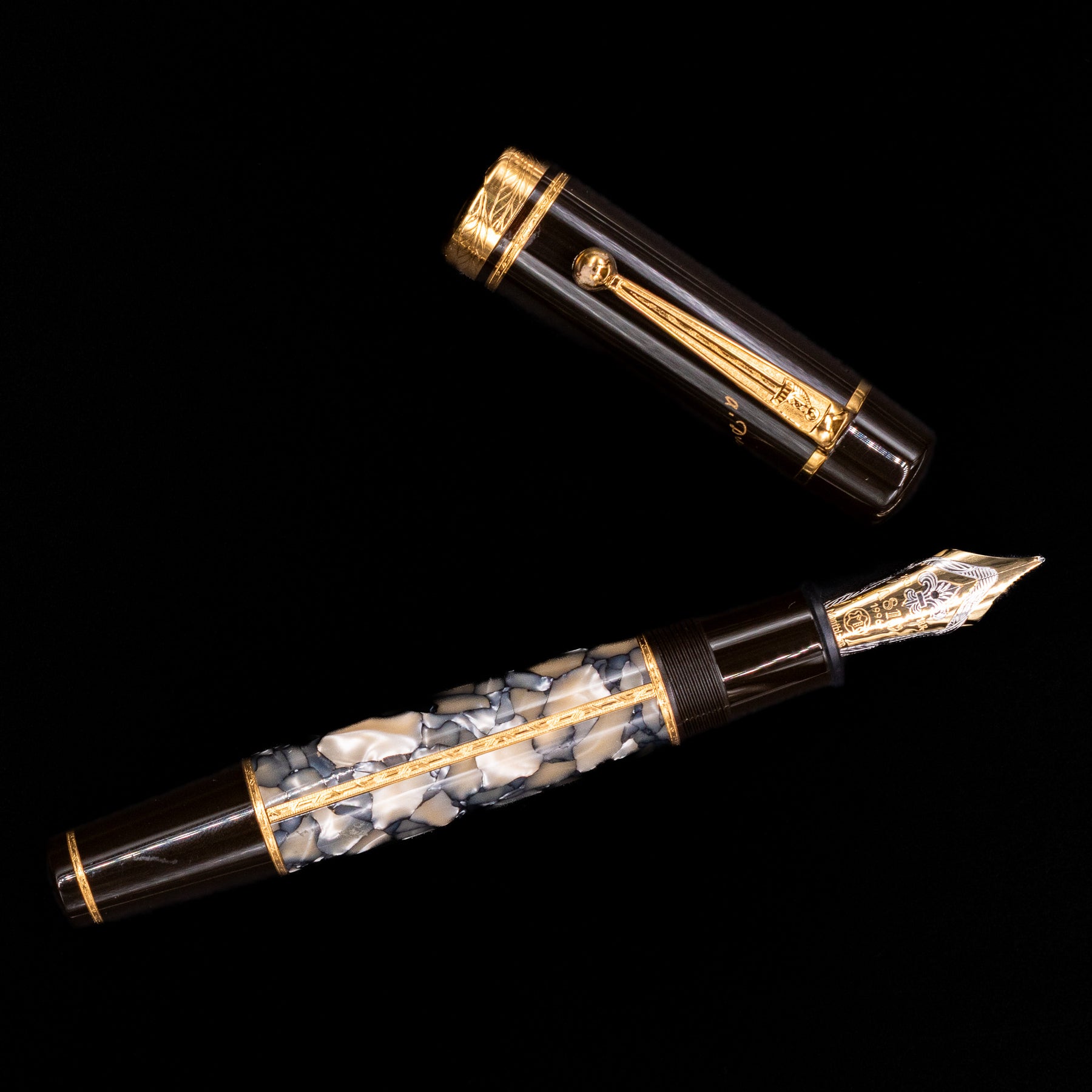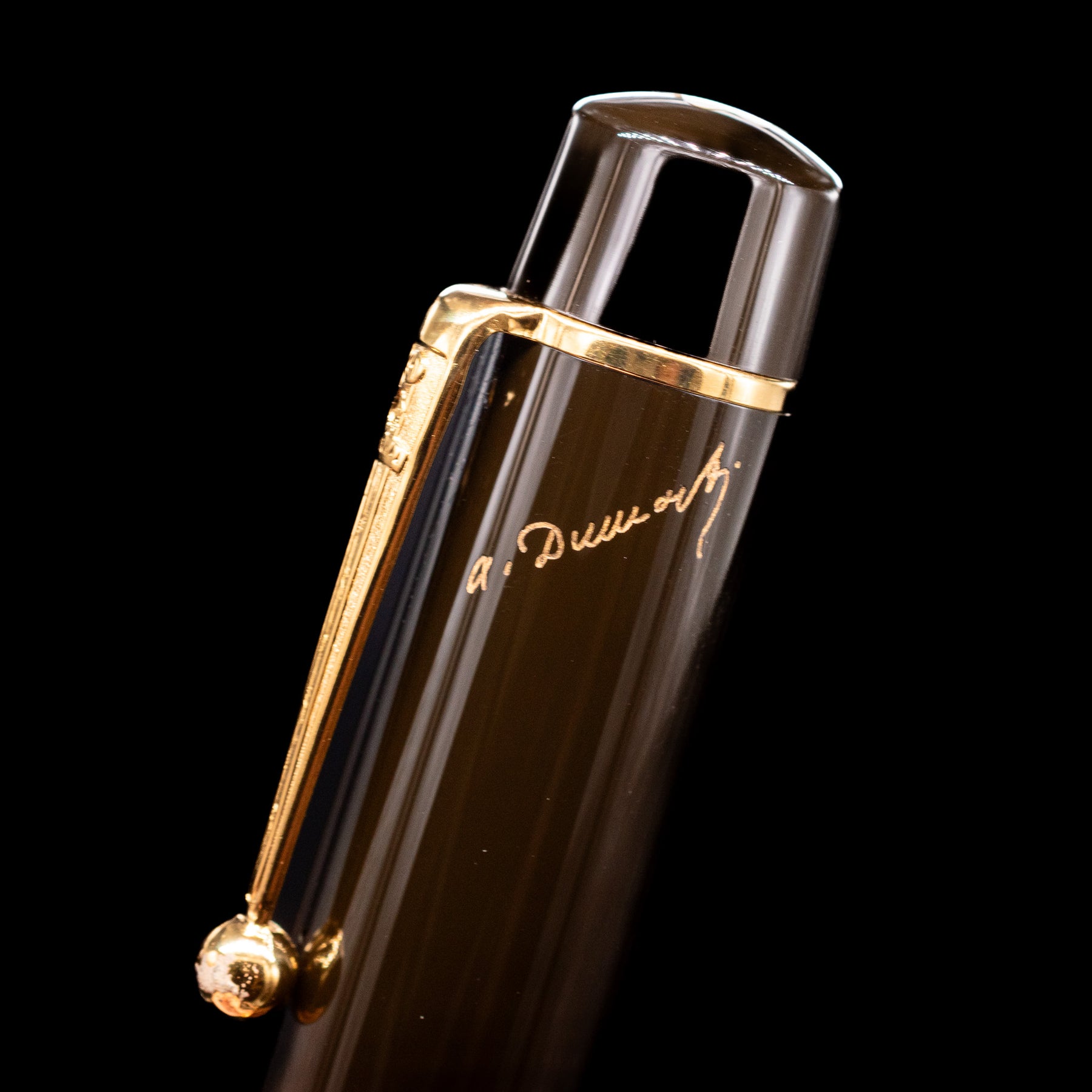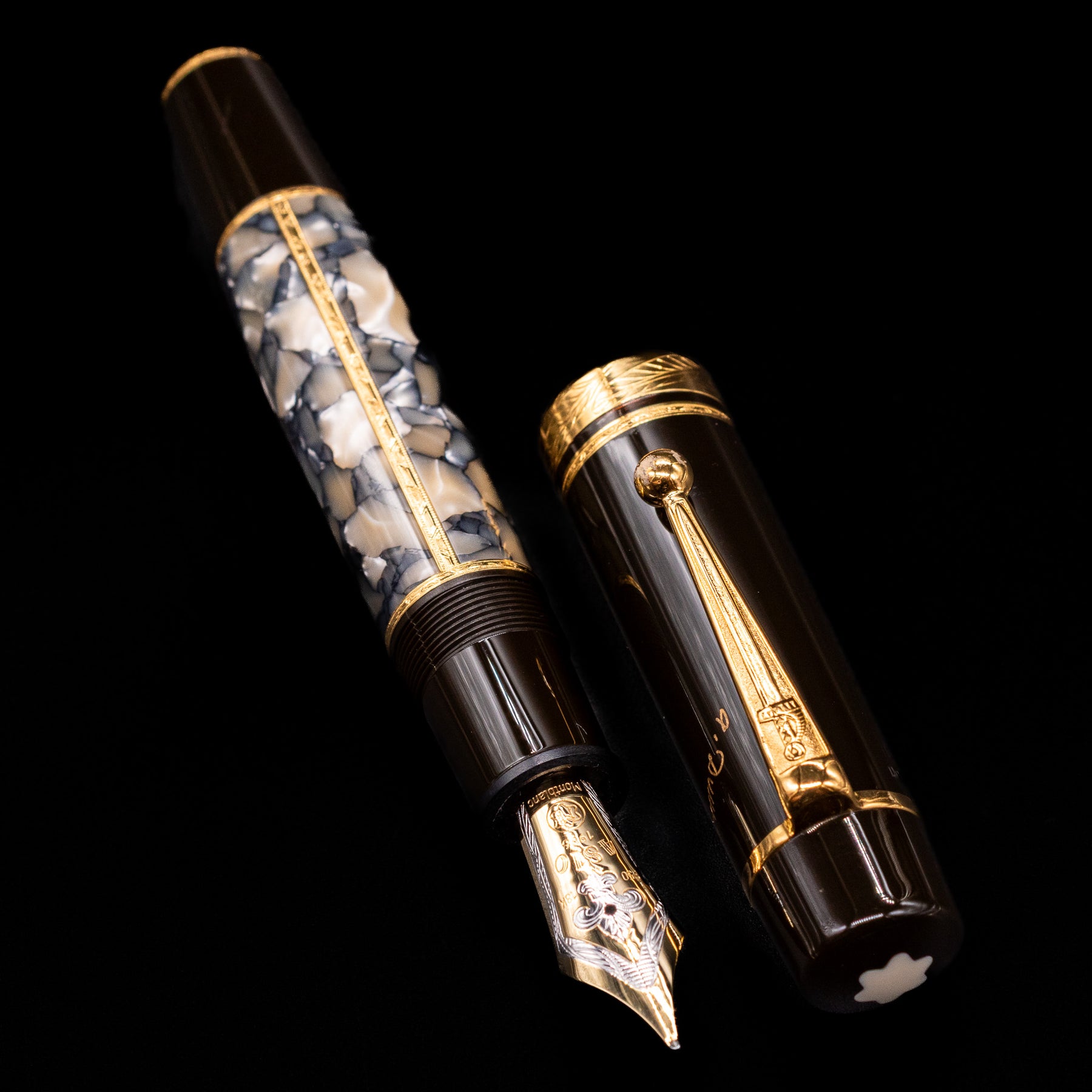 Just as perfect as the work of this great novelist are the Alexandre Dumas Writers Edition pens. Created from the finest of materials, they have a mysterious shimmering appearance which is set off by a dark brown precious resin cap. On top of this, every detail emphasizes the personality of Alexandre Dumas: the clip with its distinctive sword symbol, the rhodium-plated 18-karat gold nib, which is decorated by a fine engraving of a fleur-de-lis, and the gold-colored signature on the cap.