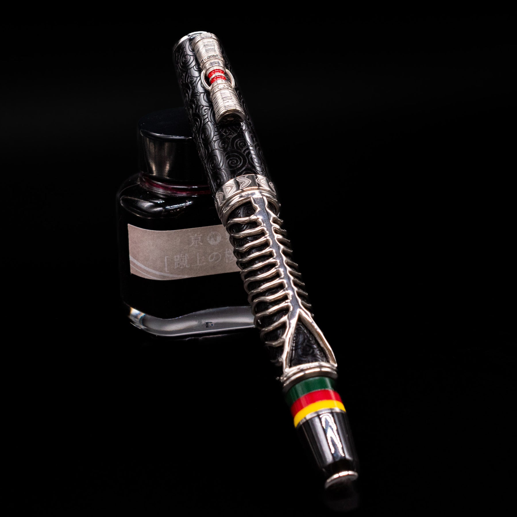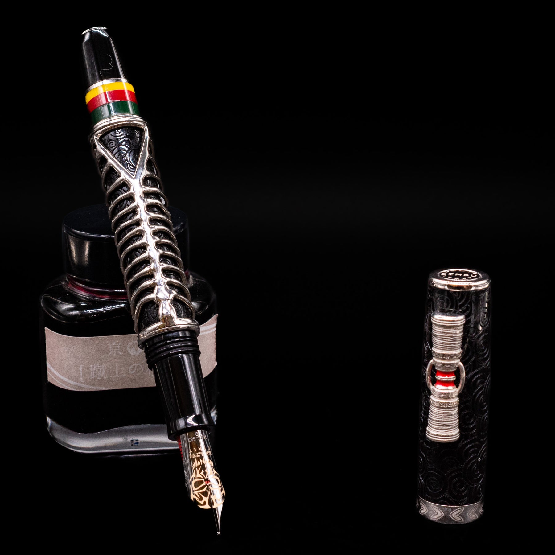 Delta Indigenous People Sterling Silver Fountain Pen - Simbu (Limited Edition) capped, leaning against an ink bottle.