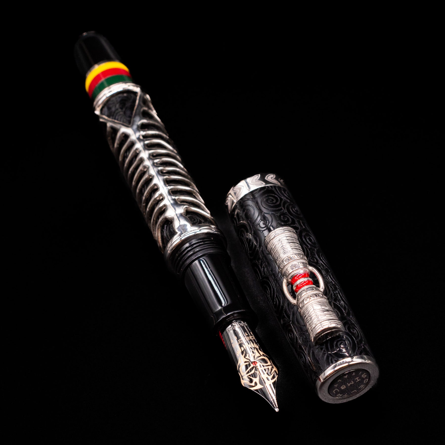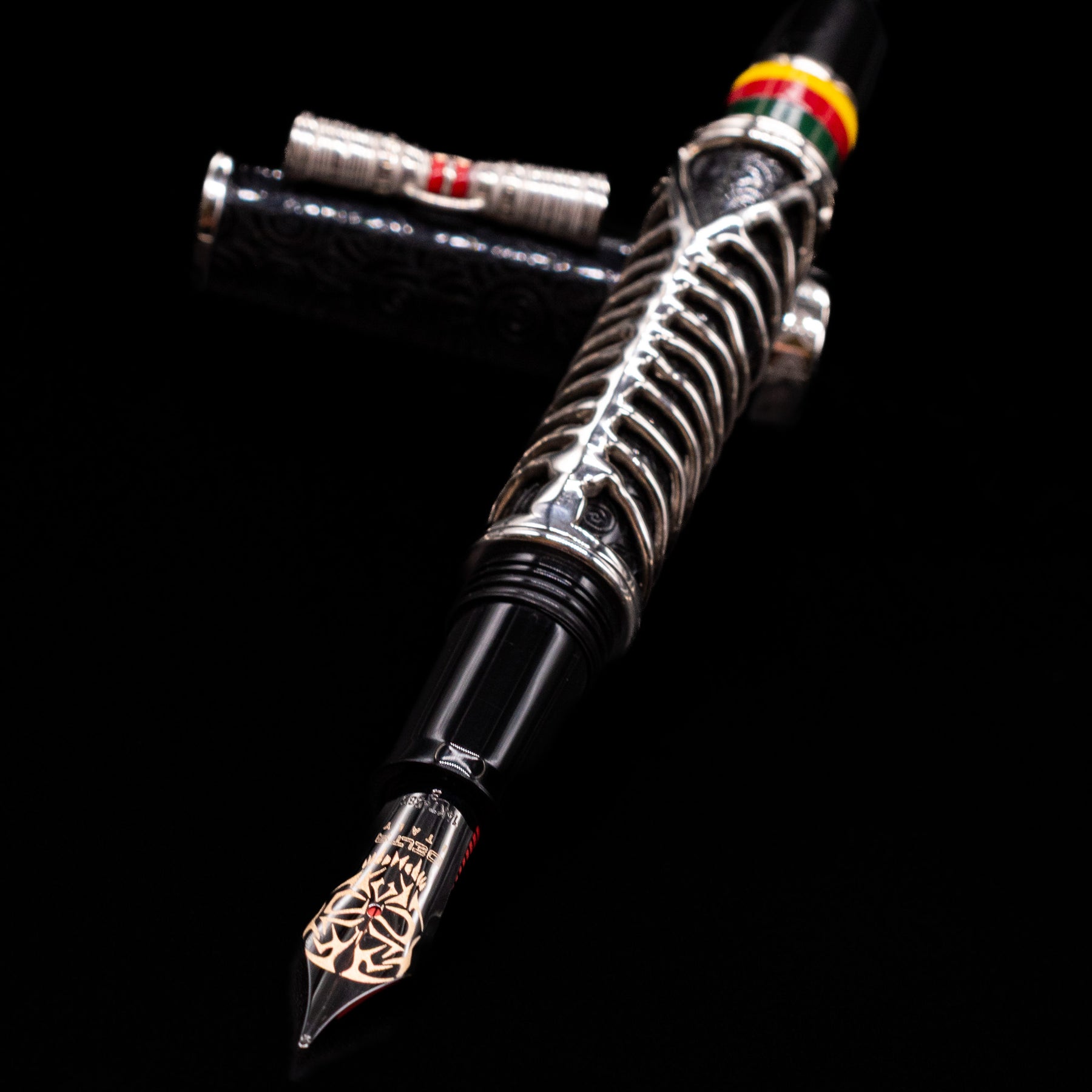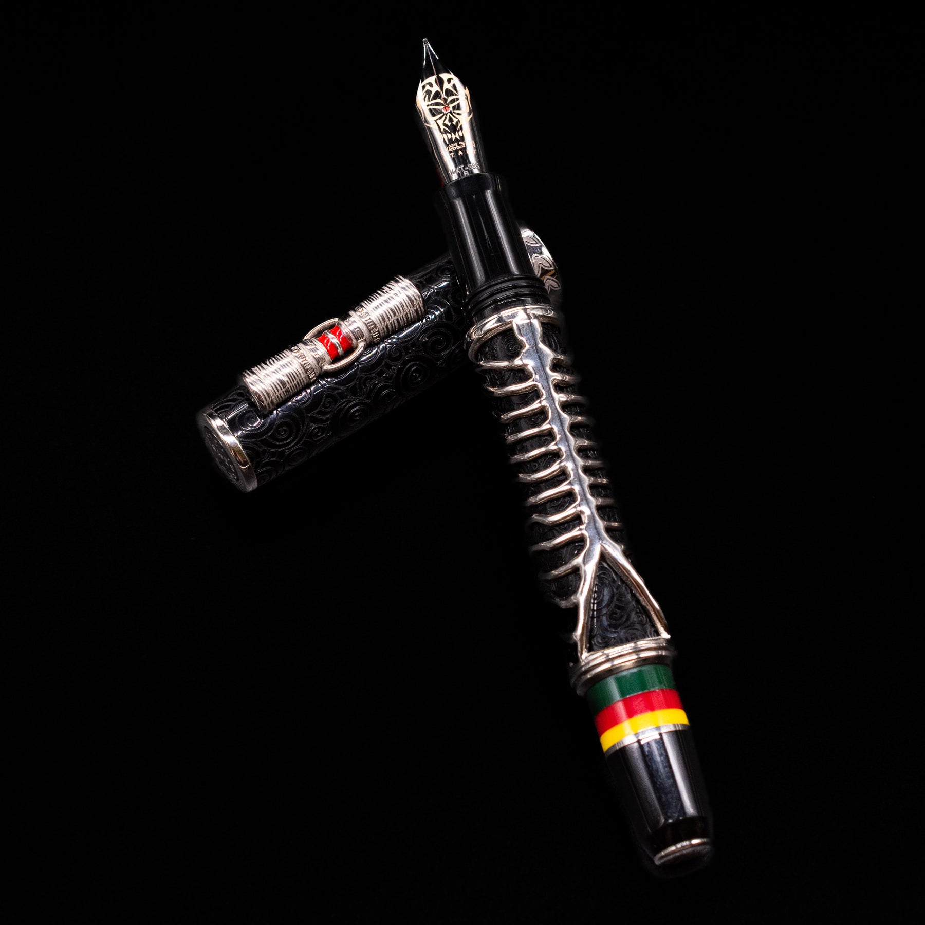 The pen’s design draws inspiration from the Simbu’s famous “Skeleton Dance,” where warriors paint their bodies as skeletal figures during ritual performances to symbolize the connection between the living and the spirit world. This powerful imagery is translated into the pen through an intricate sterling silver skeletal “armor” that wraps around the barrel, creating a dramatic lattice of bones over the underlying resin body.