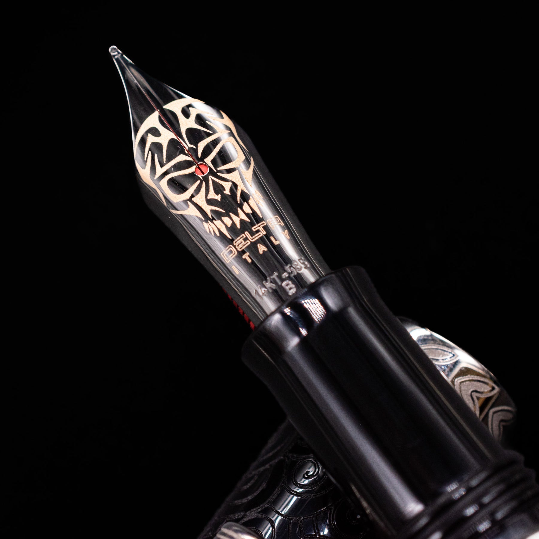 A macro shot of the nib with its intricate detailing and logo engraving for the Delta Indigenous People Sterling Silver Fountain Pen - Simbu (Limited Edition).